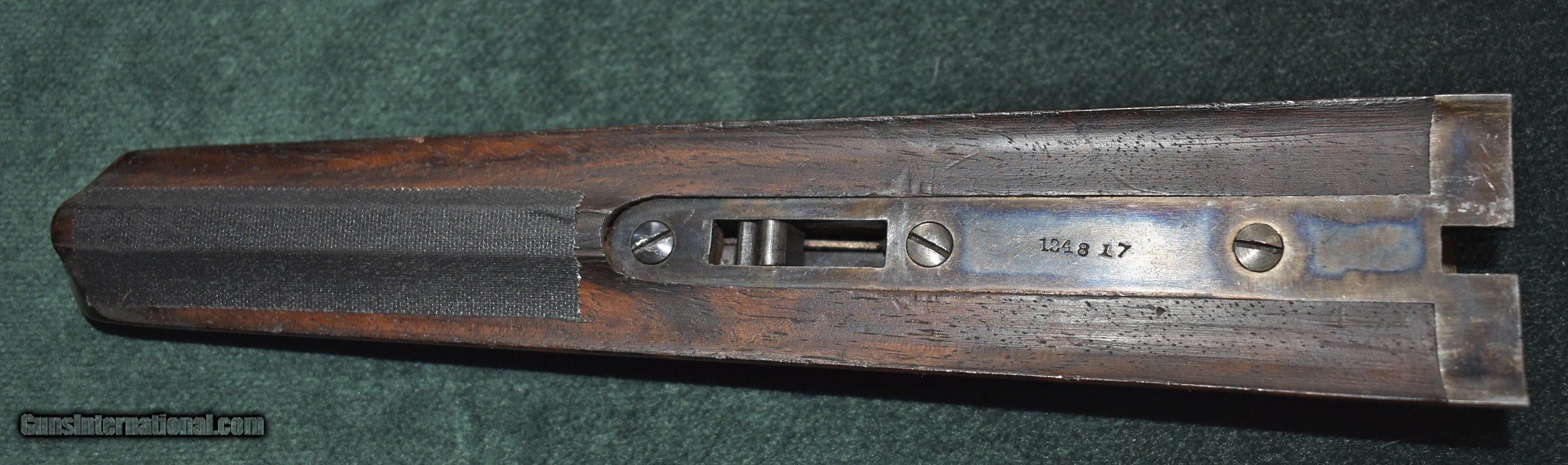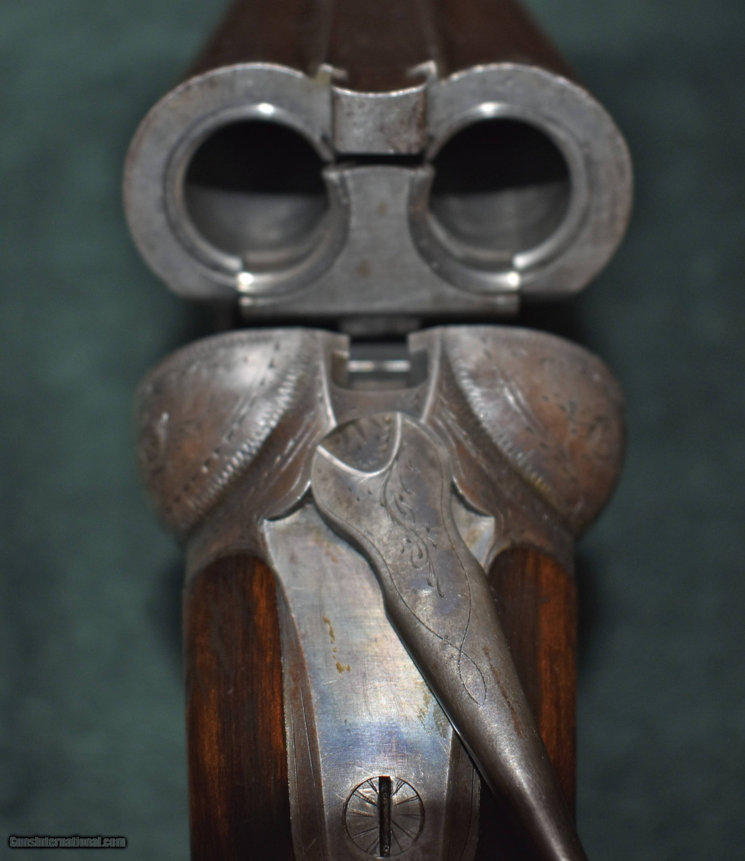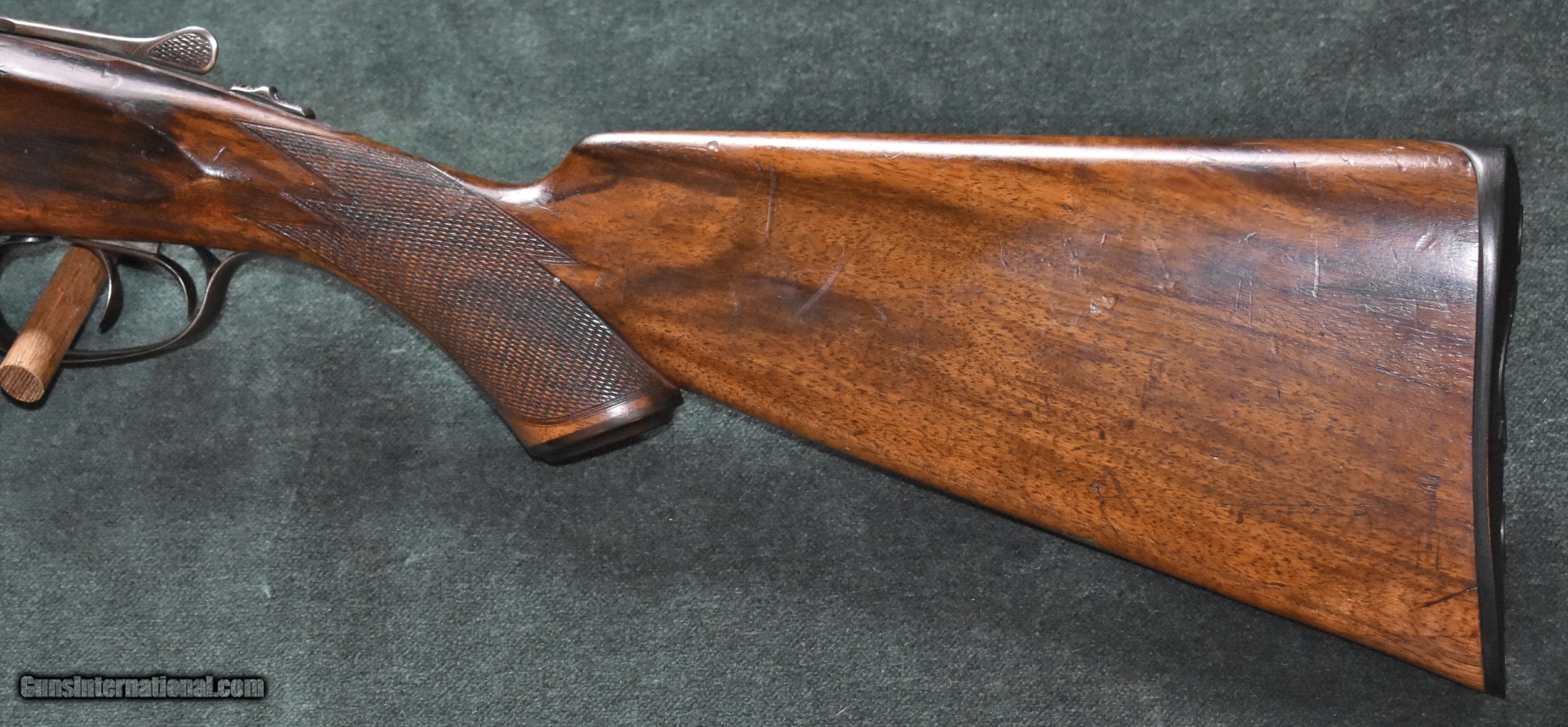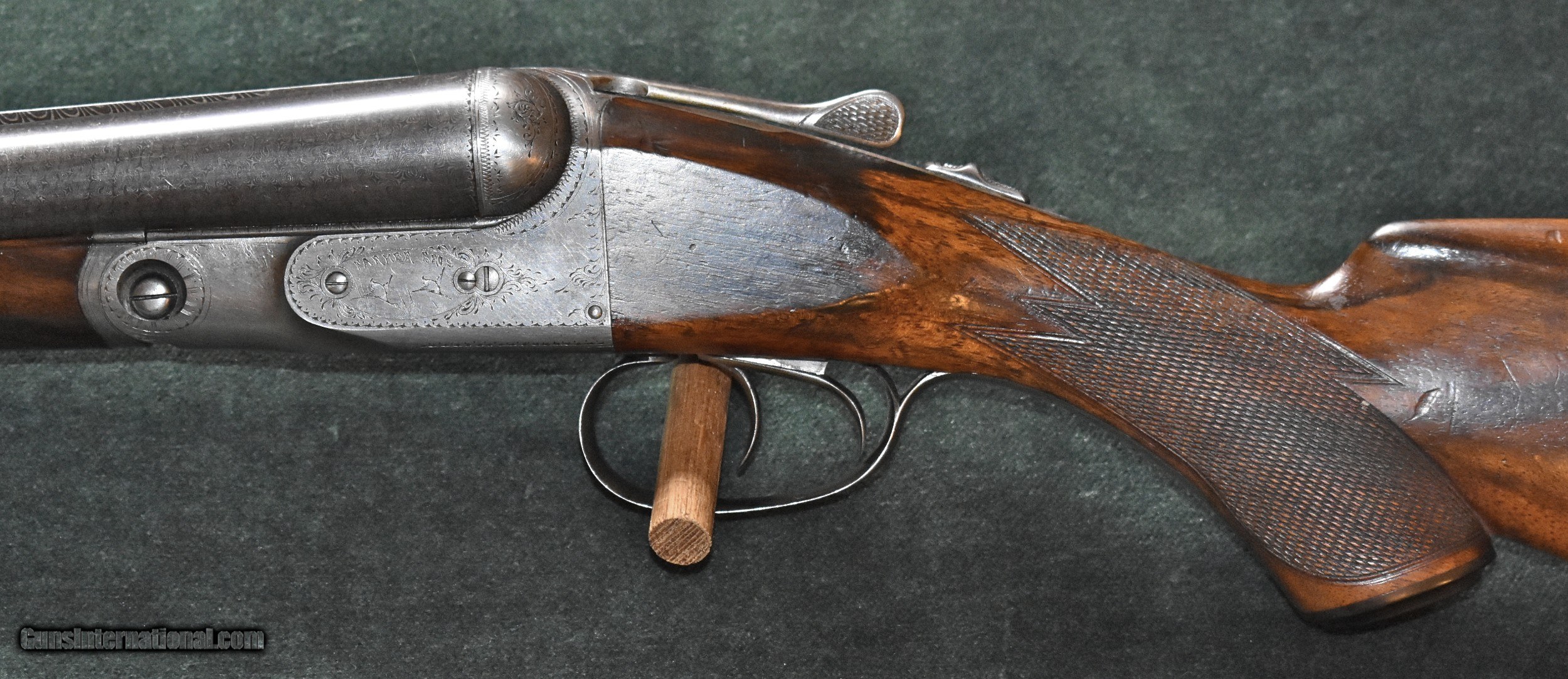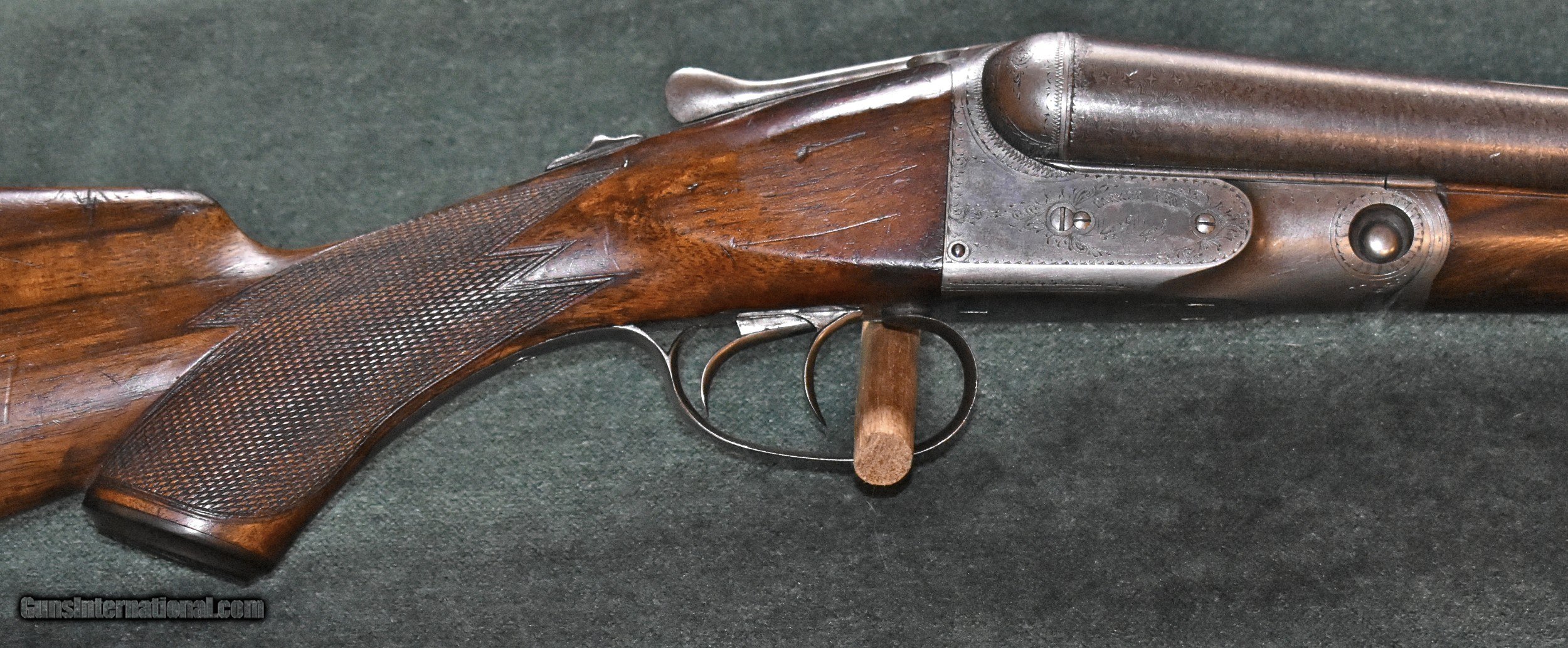 Description: An unusaul Parker GH grade 12 gauge with full length Briley 20 gauge insert tubes. Built in 1906 according to the factory letter, this gun has 30" damascus barrels choked improved cylinder (.005") and improved cylinder (.005"). In addition, it has been fitted with 20 gauge full length Briley titanium insert tubes with screw in chokes.The gun is in excellent condition retaining 25% of the original case colors and 90% of the original damascus pattern. The bores are excellent with no rust,or pitting. The barrels are on face and lock up tightly to the action with no play and have excellent wall thickness. The is one minor dent in the right barrel near the muzzle that does not show in the bore.(shown in photos).The stock is sound with no cracks or damage other than light handling marks. The stock retains the oiriginal dogs head buttplate with widows peak. Built on a #2 frame,the gun weighs 8-0 with the tubes in and 7-9 without the tubes. The stock dimensions are 143/8"x11/2"x21/2". I have shot the gun with 12 gauge 1oz loads.and 20 gauge 1 oz. loads and it performs well with either. The Briley tubes have and improved cylinder and a modified choke tube in the tube now. Others can be easily ordered from Briley if needed. A great Parker for all types of shooting. C&R eligible. SOLD Curio/Relic: Yes Shotgun Gauge: 12 Gauge, 20 Gauge Manufacturer: Parker Bros. Model: GH Serial Number: 124817 Barrel Length: 30 Chambers: 23/4 Ejectors: extractors Condition: excellent Metal Condition: excellent Wood Condition: excellent Bore Condition: excellent Barrel Type: damascus steel Action: double barrel Triggers: double Stock Dimensions: 143/8"x11/2"x21/2 Butt Pad: Factory Dog's Head Buttplate Manufacture Date: 1906 Extras: factory letter Minimum Wall Thickness Left: .035 Minimum Wall Thickness Right: .033 |