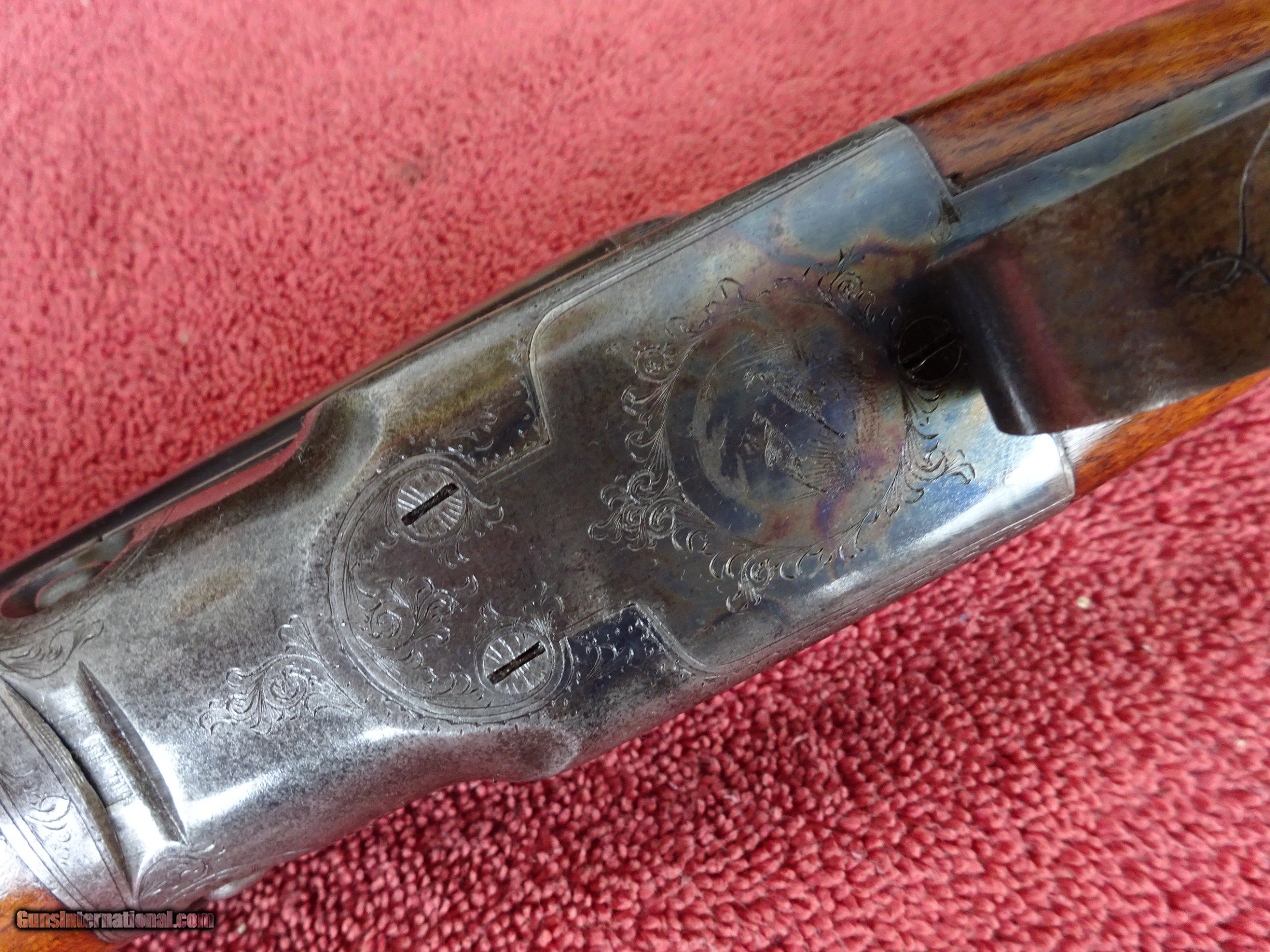Description: PARKER GH GRADE 12 GA, 28" PARKER SPEC. STEEL BARRELS. IMCYL AND FULL (.08 AND .035), 2 1/2" CHAMBERS, MIRROR PERFECT BORES, 98% ORIGINAL BRIGHT BLUE, SINGLE SIGHT, BARRELS RING BEAUTIFULLY. NUMBER 1 FRAME, TYPICAL ENGRAVING WITH GAME BIRDS, SCROLLWORK AND BORDERS, BOLD VIVID CASE COLOR OVER MOST ALL OF THE FRAME TOP SIDES AND FLOOR PLATE, PERFECT ENGRAVED SCREWS, TRIGGERGUARD DULLED BACK TO A PATINA, TOP LEVER TO THE RIGHT, TIGHT AS NEW. THERE IS MORE CASE COLOR THAN THE PHOTOS SHOW. PISTOL GRIP STOCK, SPLINTER FOREARM, EXCELLENT WOOD AND CHECKERING, ORIGINAL GRIP CAP AND DOGHEAD BUTTPKATE, STOCK SHIELD INLAY NOT ENGRAVED. GREAT DIMENSIONS, 1 1/4" X 2 1/4" X 14 1/4", 7 POUNDS EVEN. A SUPERB, ORIGINAL LIGHT WEIGHT PARKER. $3950.00 + $50.00 Insured shipping to an FFL address. See all Pats gun listings on this site! We also have hundreds of pieces of ORIGINAL gun company advertising & memorabilia available for sale on our site SPORTINGCOLLECTIBLES. We have no reprints or reproductions. Email for more information. SOLD Curio/Relic: Yes |