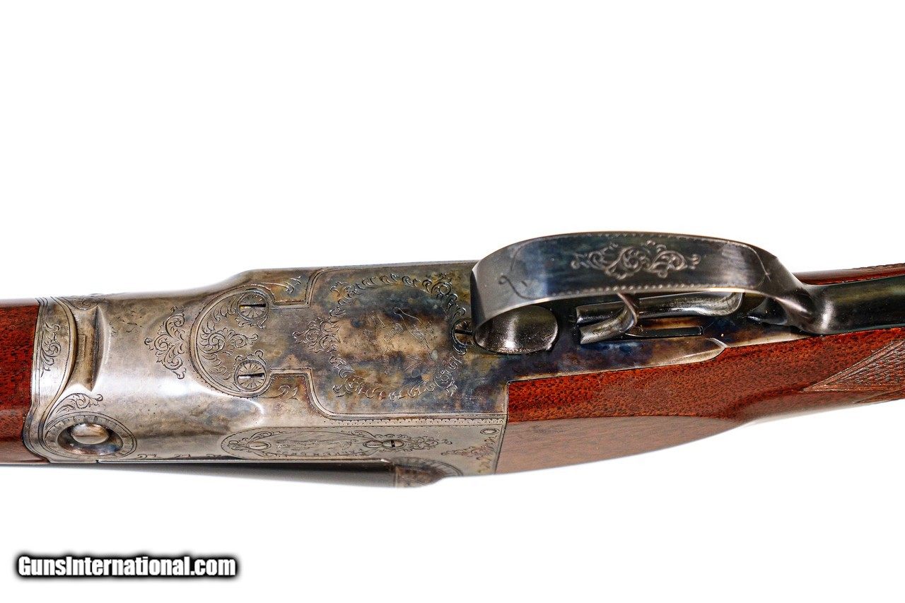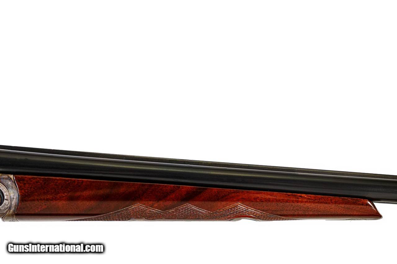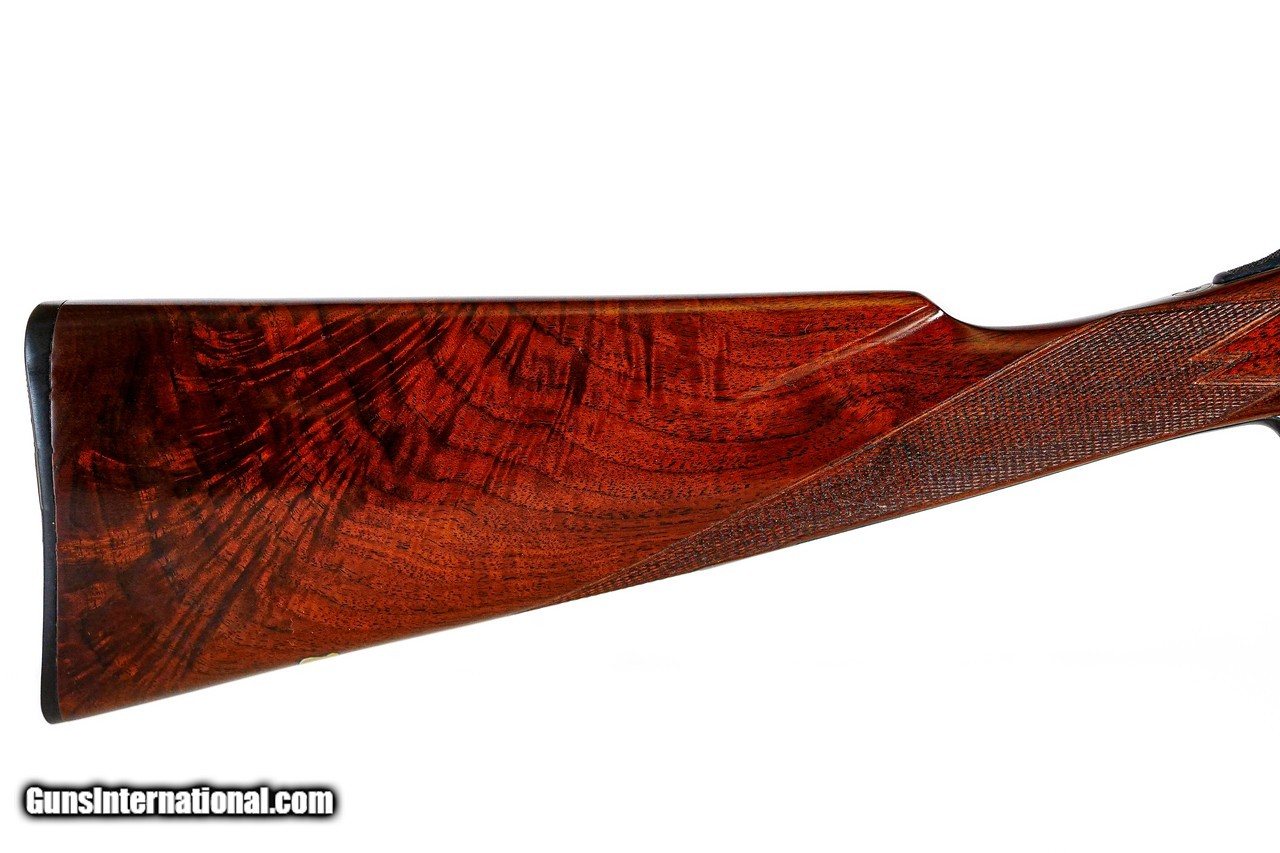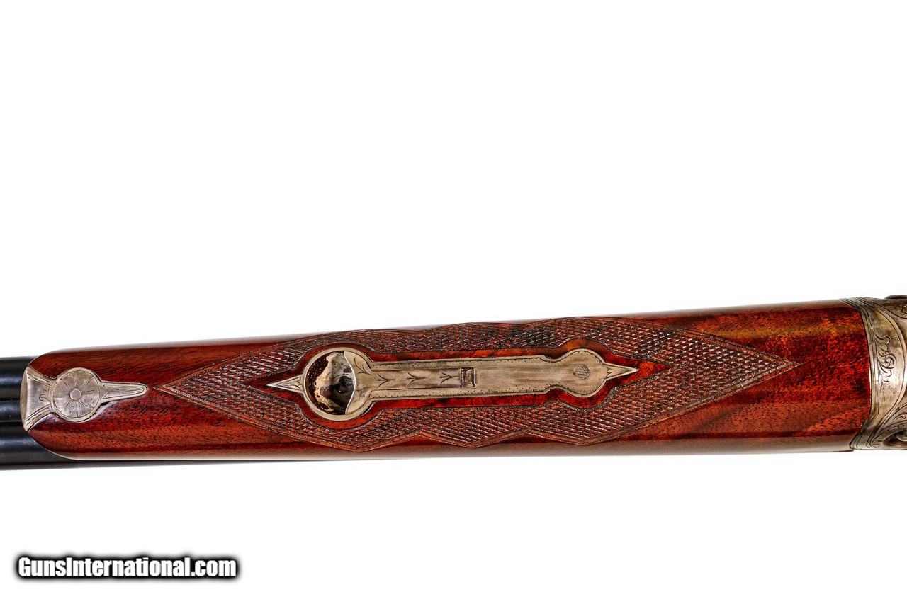 Description: Parker - GH Grade, .410. 26" Barrels Choked M/IM. Highly figured feathercrotch straight grip stock, dogs head butt plate, double trigger, extractor, 219,xxx serial number, 000 frame, sharp engraving, perfect screws, splinter forend, 85% case coloring, near perfect bluing and wood finish, great configuration, ultra rare G grade in a 410, available for immediate delivery. Connecticut Shotgun/Galazan are experts at buying, selling and manufacturing Parker Shotguns. We have handled the largest collection of Parker shotguns including all 3 Invincible grades, and many of the milestone guns, too numerous to list. We can assure the guns that we sell for shooting or collecting are simply the best. We also maintain many styles, hunting presentation cases and accessories. Inv: 51499 5 lbs. 8 oz. 14 3/8“ x 1 ½“ x 2 3/8“ $27,999.00 SOLD |