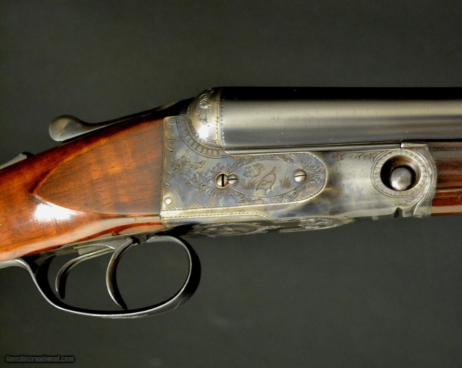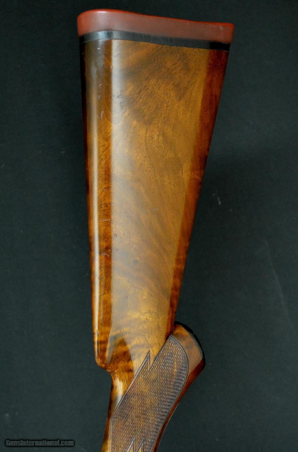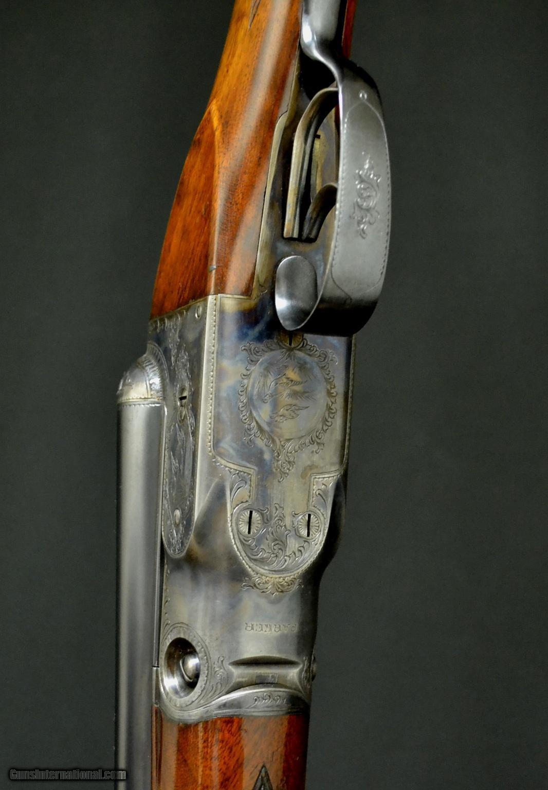 Description: Parker GHE 12ga., 30” barrels choked Mod./Full, 1 ½ frame, late Parker/Remington production that is 100% new with very minor handling marks. Double trigger, automatic ejector, pistol grip, long length of pull, original factory pad. One of the highest conditioned guns we have ever owned. Collector quality, guaranteed authentic. It has all of the original trigger guard blue and even the forend has all the original case color. This gun is just new, untouched and authentic. If you are looking for the best, here it is. Inv# 36571 14 5/8” x 1 5/8” x 2 ½” 7lbs., 10oz. Price: $14,995.00 SOLD |