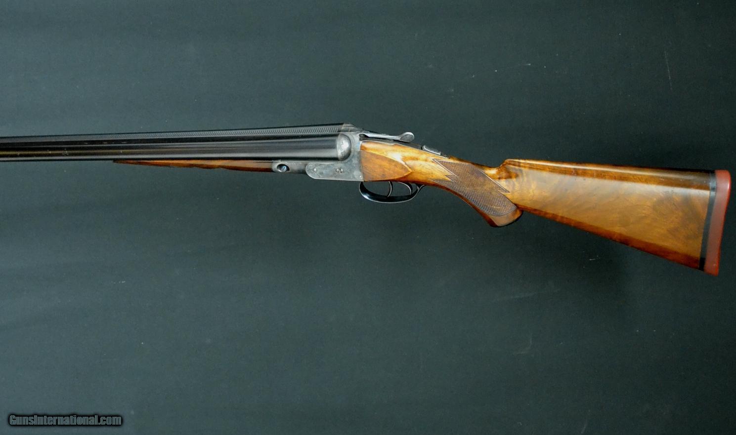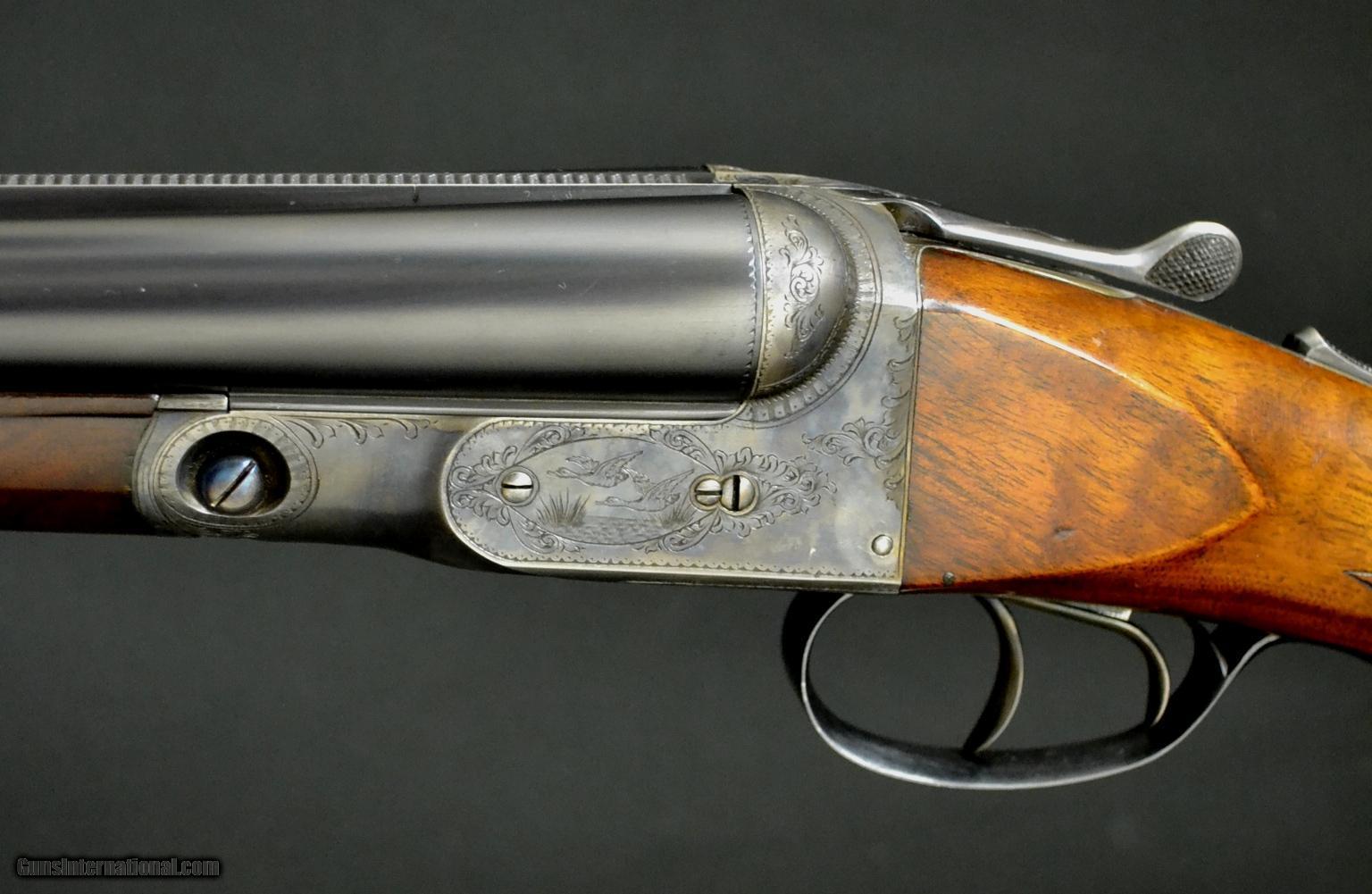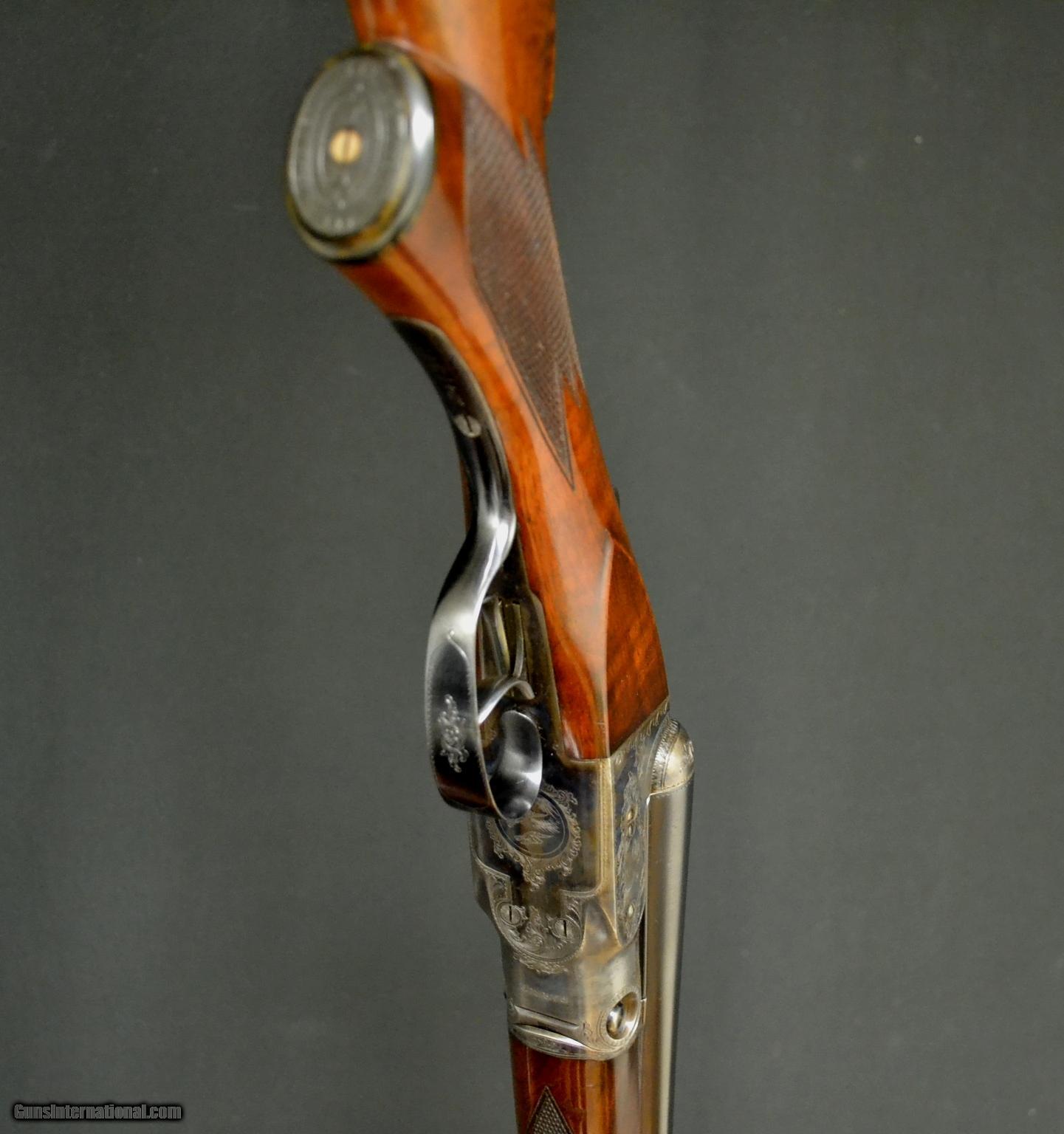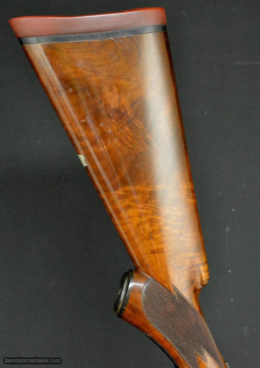 Description: Parker GHE 12ga., 30” barrels choked Mod./Full, 1 ½ frame, late Parker/Remington production that is 100% new with very minor handling marks. Double trigger, automatic ejector, pistol grip, long length of pull, original factory pad. One of the highest conditioned guns we have ever owned. Collector quality, guaranteed authentic. It has all of the original trigger guard blue and even the forend has all the original case color. This gun is just new, untouched and authentic. If you are looking for the best, here it is. Inv# 36571 14 5/8” x 1 5/8” x 2 ½” 7lbs., 10oz. Price: $14,995.00 SOLD |