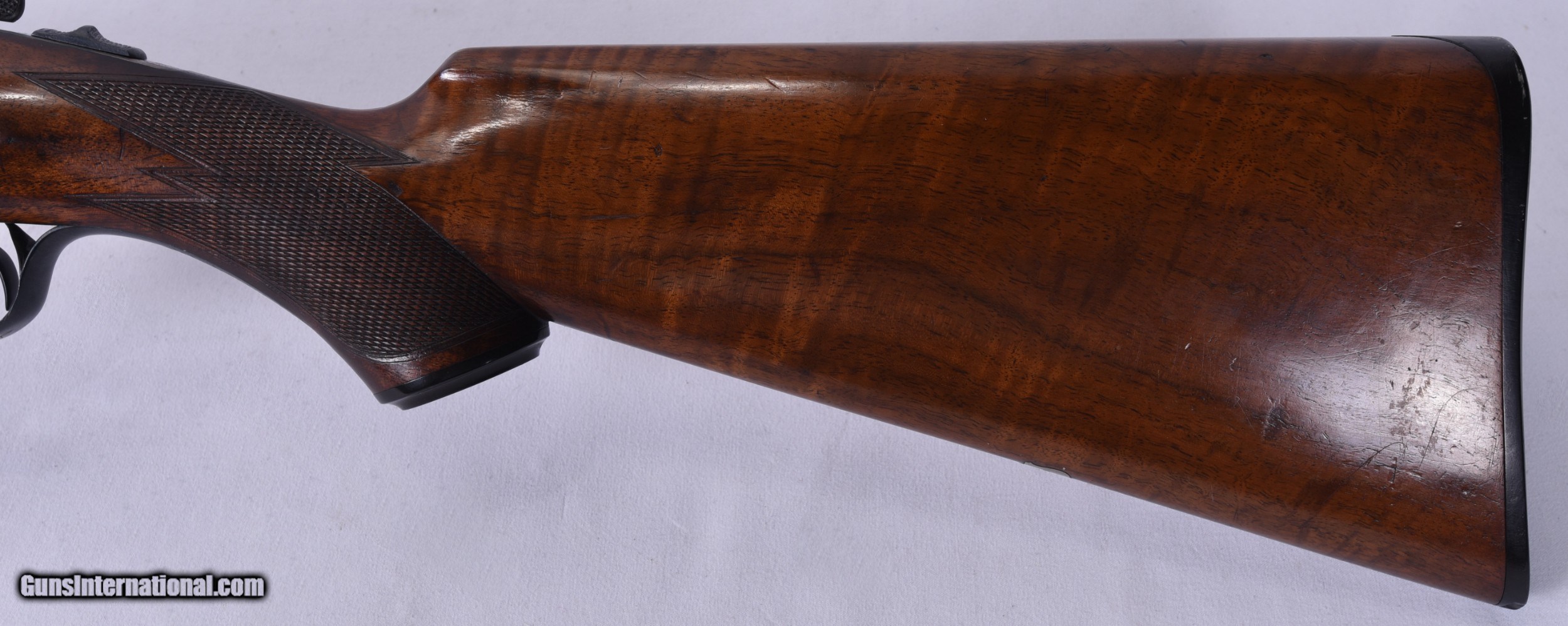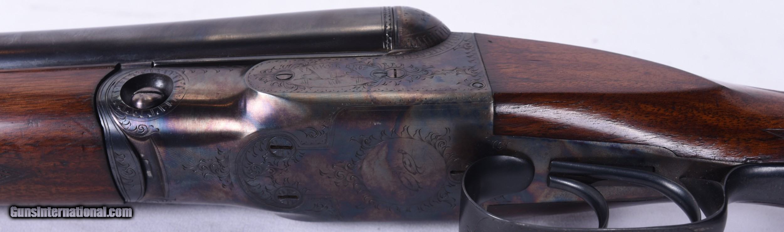 Description: Here is a stunnign Parker GHE in 12GA. Has 30" special steel, vent ribbed barrels. Made in 1899. Reblue and case colors by Del Grego. 14 1/4" PG stock to dogs heade butt plate. Wood finish looks origonal. SOLD Curio/Relic: Yes |