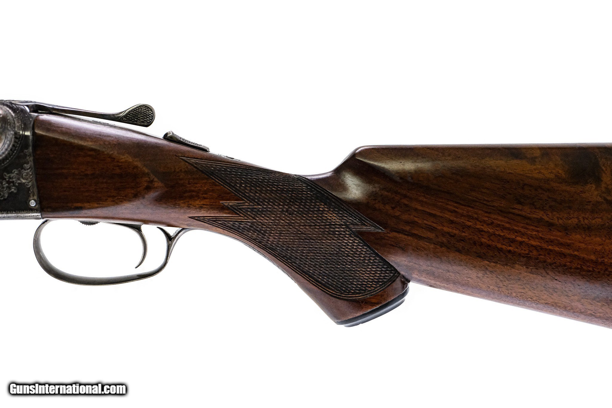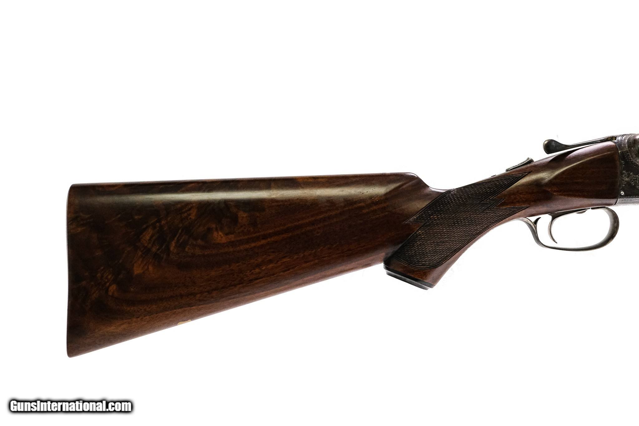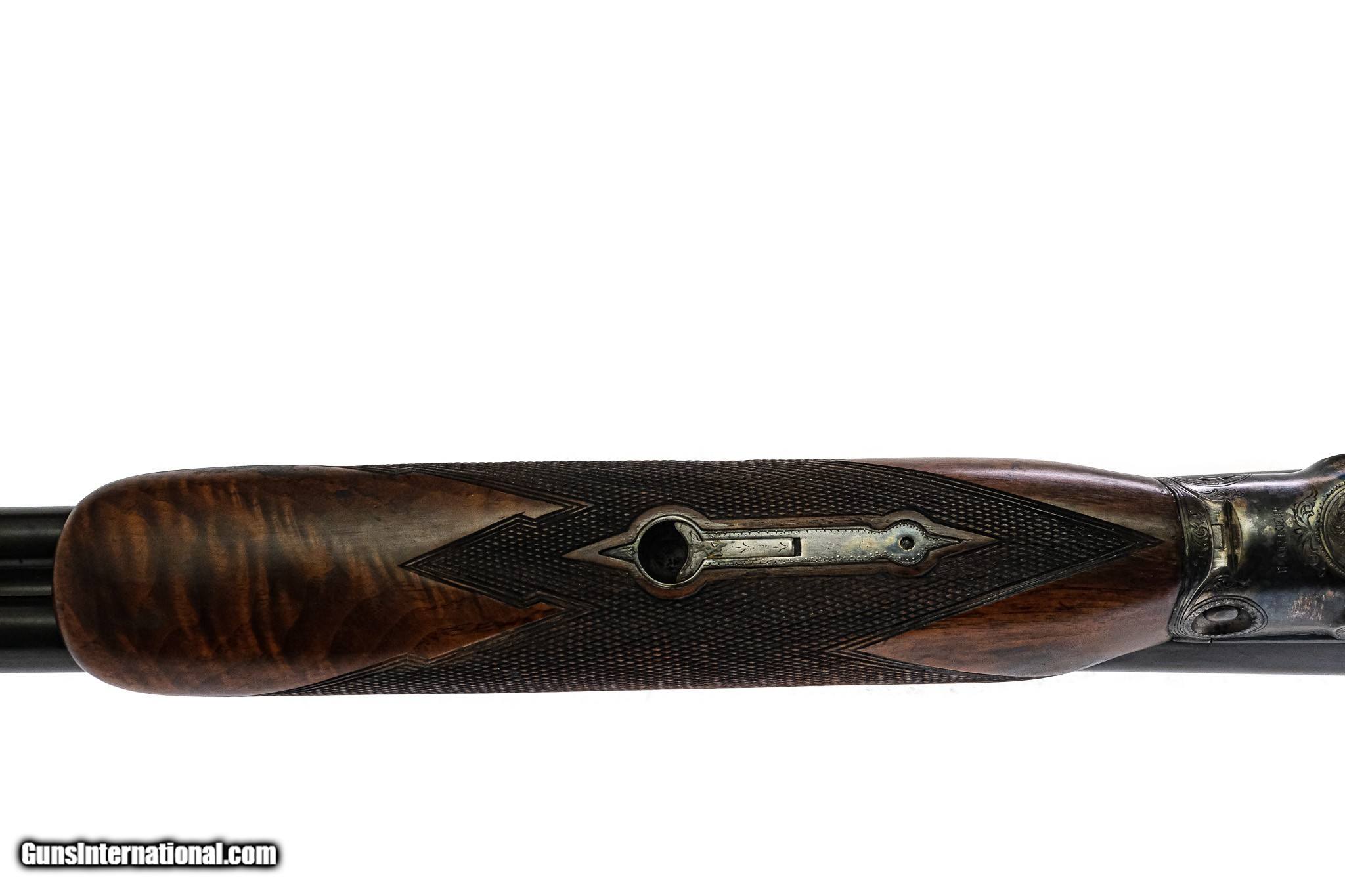 Description: Parker - GHE Grade, SxS, 1 ½ Frame, Skeet Gun, 12ga. 26" Special Steel Barrels Choked IC/M. Special Steel Barrels choked and marked on barrels flat IC/M , 1 ½ Frame, after market front sight, Remington day codes, factory beavertail forend, Parker single selective trigger, matte rib, capped pistol grip, checkered butt, shield in stock, 95% late style case colors, perfect screws, “Parker” written on bottom of frame. 99% barrel blue and wood finish, sharp checkering and engraving, with perfect screws.. rare skeet gun, beautifully figured American Walnut, automatic ejector, non auto safety, outstanding gun, very hard to find configuration. Inv: 70173 6 lbs. 9 oz. 14 3/4" x 1 5/8" x 2 3/4" $10,500.00 SOLD |