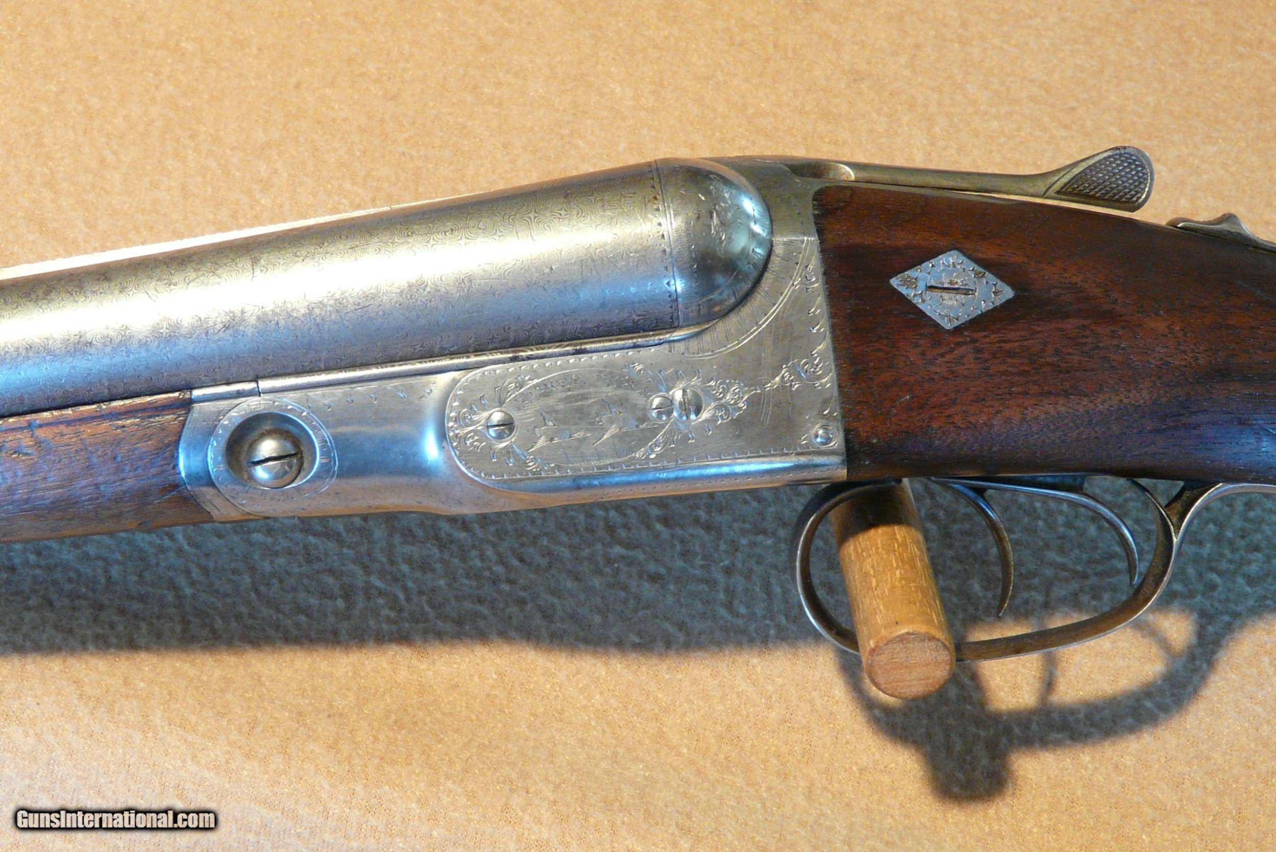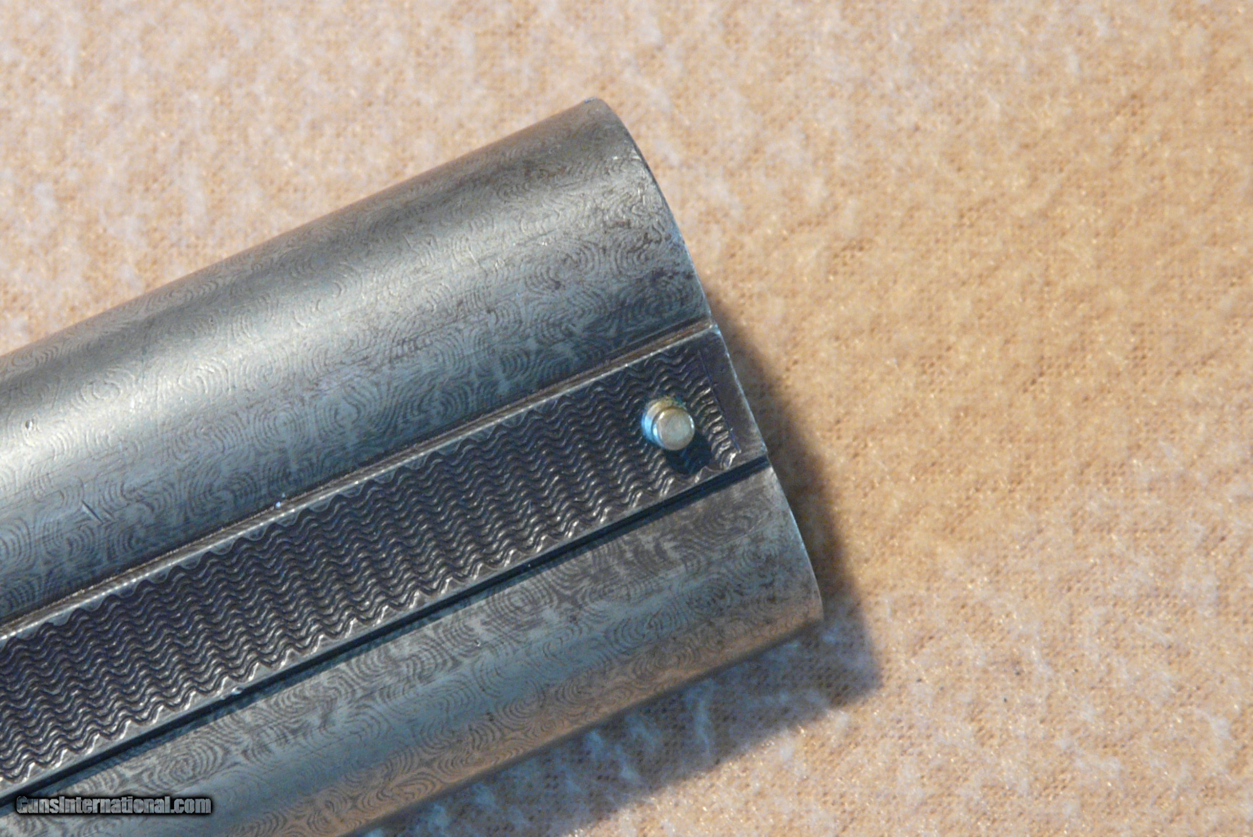 Description: Parker G Model mfg 1897, with no blue or case color, but Exc and tight as new, with Exc Bores, and Wood, all engraving is distinct, and easy to see, Damascus 28" Barrels with absolutely Exc Bores, with over 2 1/2" chambers, but not 2 3/4" ? choked full & Mod , A great candidate for Restoration, Buttstock has worn checkering, but no dings or cracks !! Original buttplate is Exc, and has nice figure in the wood, damascus pattern is 85 to 90% also. Forend has handling ring marks as you can see !! No cracks anywhere in wood ! Gun still closes like new, very tight to face, DAH 3 1/4" DAC 1 7/8" 13 3/4" LOP All numbers match ! SOLD |
