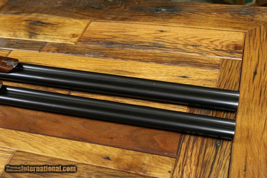 Description: SALE PENDING ...Offered is a totally unique pair of Parker Reproduction DHE shotguns. Serial numbers are 28-898 and 20-898. This pair was specially ordered at the same time with exactly the same dimensions and chokes. They are both DOUBLE TRIGGER SHOTGUNS with straight stocks and splinter fore ends. The figure of the wood on both shotguns is gorgeous The dimensions are 14 1/2 inch length of pull from the front triggers over the skeleton butt plates. Drop at heel 2 1/4 inches and drop at comb 1 1/2 inches. Chokes are Improved Cylinder and Modified. Weight of the 28 gauge is 5 pounds 8 ounces and the weight of the 20 gauge is 6 pounds 10 ounces. Conditions are both exellent and all original with the 28 gauge showing a little wear to the case color on the receiver. The 20 gauge has nearly all of its original case color. They both look great and were obviously used little and well cared for. They both include their original Emmebi hard cases and dust covers and accessories. Perhaps the only same serial Parker Reproductions in existence. A Great set for the shooter and investor. Sold as a pair only. Go to ironmenarms . c o m for additional pictures. SOLD |