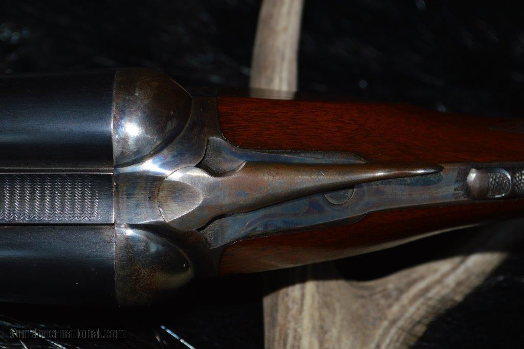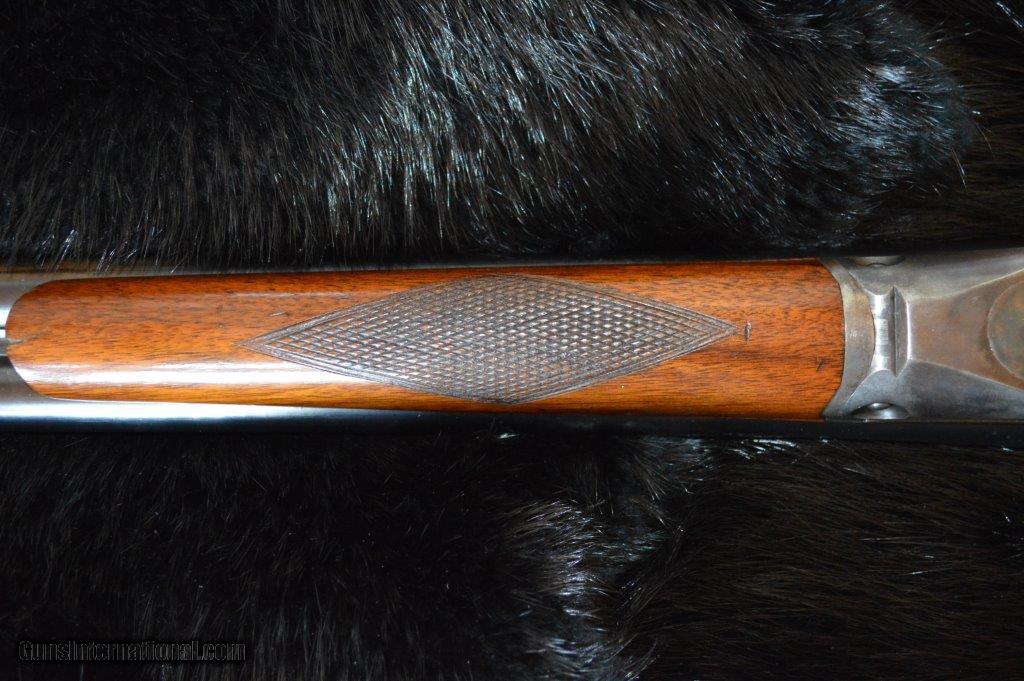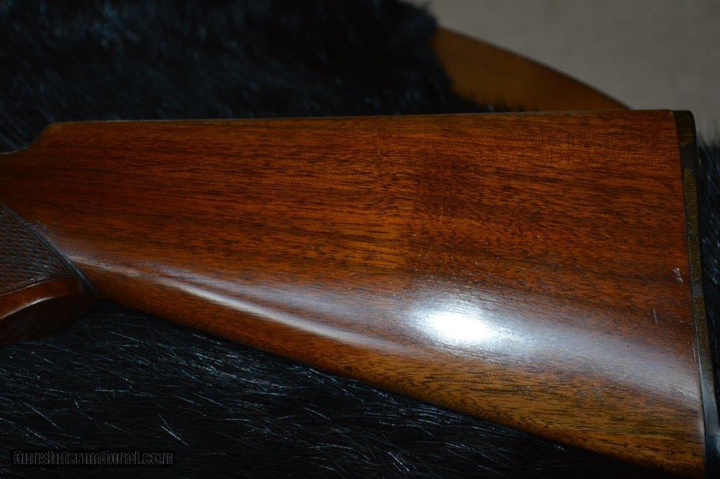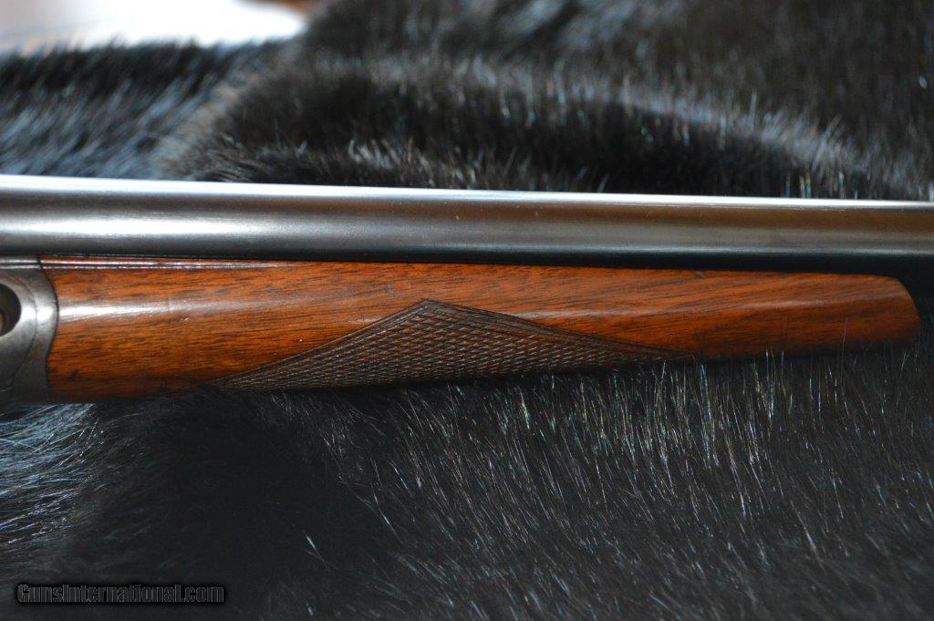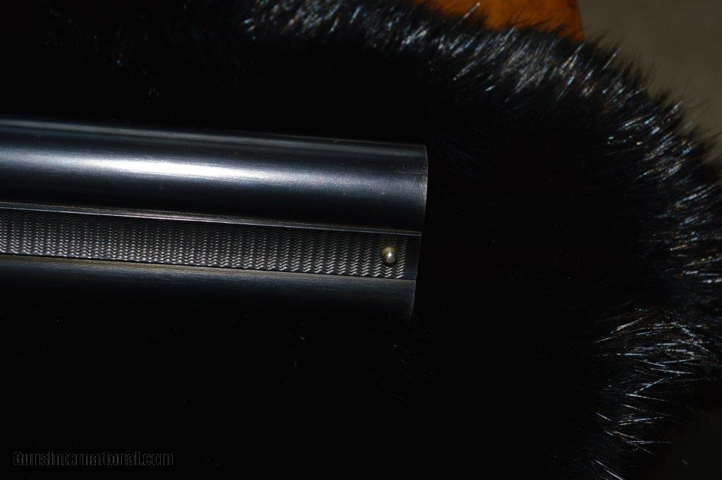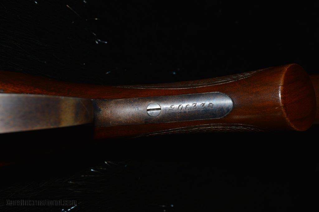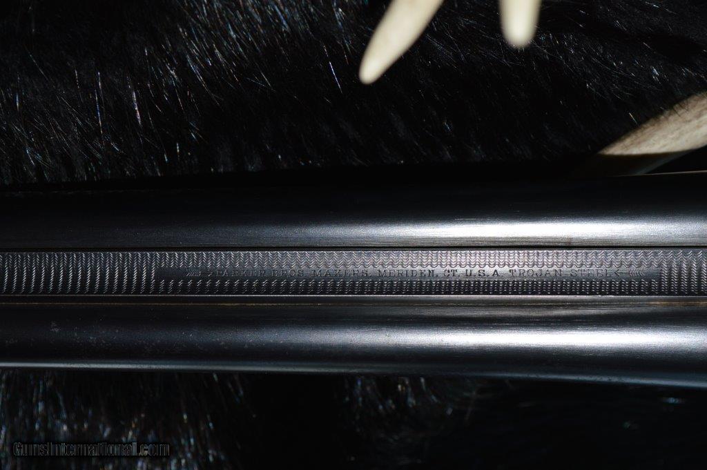 Description: Made in 1923, this is one of the best condition Parker Trojans available. It has shiny, mirror like bores, crack-free original factory serial numbered wood, super-tight lock up and great balance, about an inch ahead of the hinge pin. 30" barrels, choked (R) Improved Mod and (L) Full, the bores are .733" with 2-5/8" chambers. The rust blue finish is a very deep and lustrous blue that is flawless, even in the rib matting; with the exception of an area on the left tube where your hand would rest against the barrel. Ribs are tight and barrels lock shut leaving the top lever just to the right of center. Vibrant case colors are conservatively 70%. The wood is proud of the metal and tight to the inletting and the finish is at least 95%. All of the mechanicals operate very well and there are no issues. The pull is 14" over the factory plastic butt and there's 2-3/4" drop at the heel and 1-3/4" at the comb. The checkering is very well preserved and the mullard boarders are very clear and clean. SOLD Curio/Relic: Yes Antique: Yes |