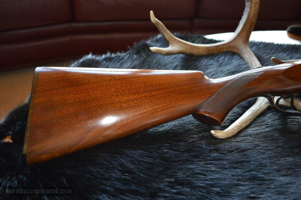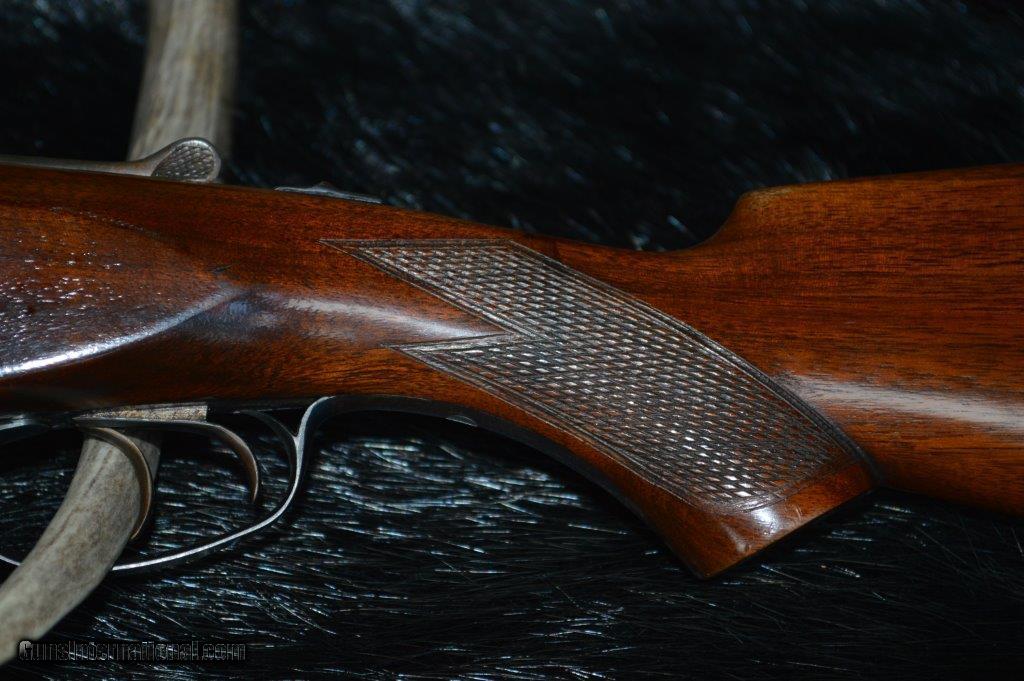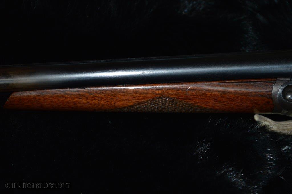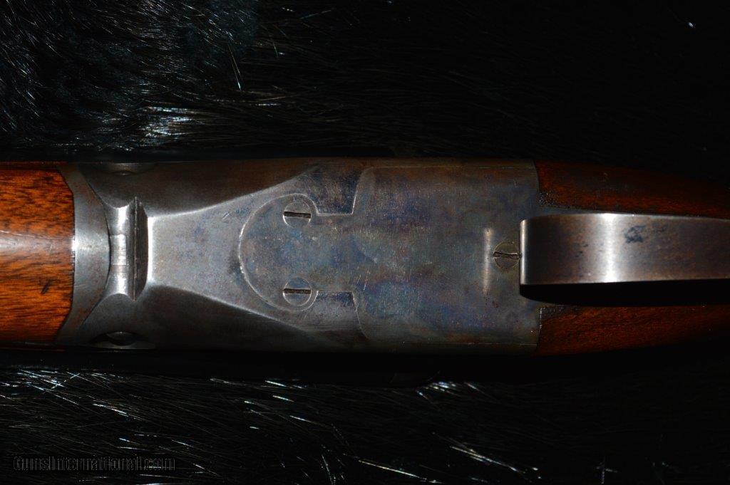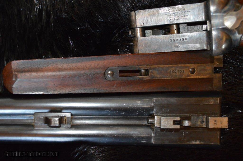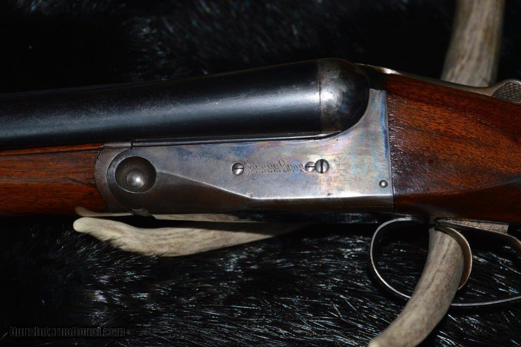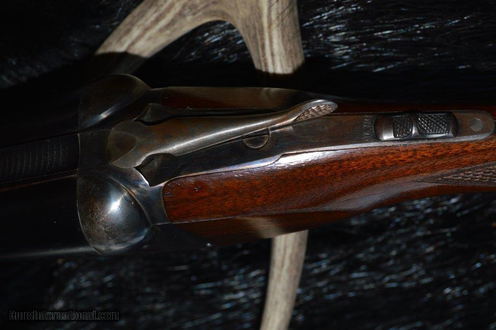 Description: Made in 1923, this is one of the best condition Parker Trojans available. It has shiny, mirror like bores, crack-free original factory serial numbered wood, super-tight lock up and great balance, about an inch ahead of the hinge pin. 30" barrels, choked (R) Improved Mod and (L) Full, the bores are .733" with 2-5/8" chambers. The rust blue finish is a very deep and lustrous blue that is flawless, even in the rib matting; with the exception of an area on the left tube where your hand would rest against the barrel. Ribs are tight and barrels lock shut leaving the top lever just to the right of center. Vibrant case colors are conservatively 70%. The wood is proud of the metal and tight to the inletting and the finish is at least 95%. All of the mechanicals operate very well and there are no issues. The pull is 14" over the factory plastic butt and there's 2-3/4" drop at the heel and 1-3/4" at the comb. The checkering is very well preserved and the mullard boarders are very clear and clean. SOLD Curio/Relic: Yes Antique: Yes |