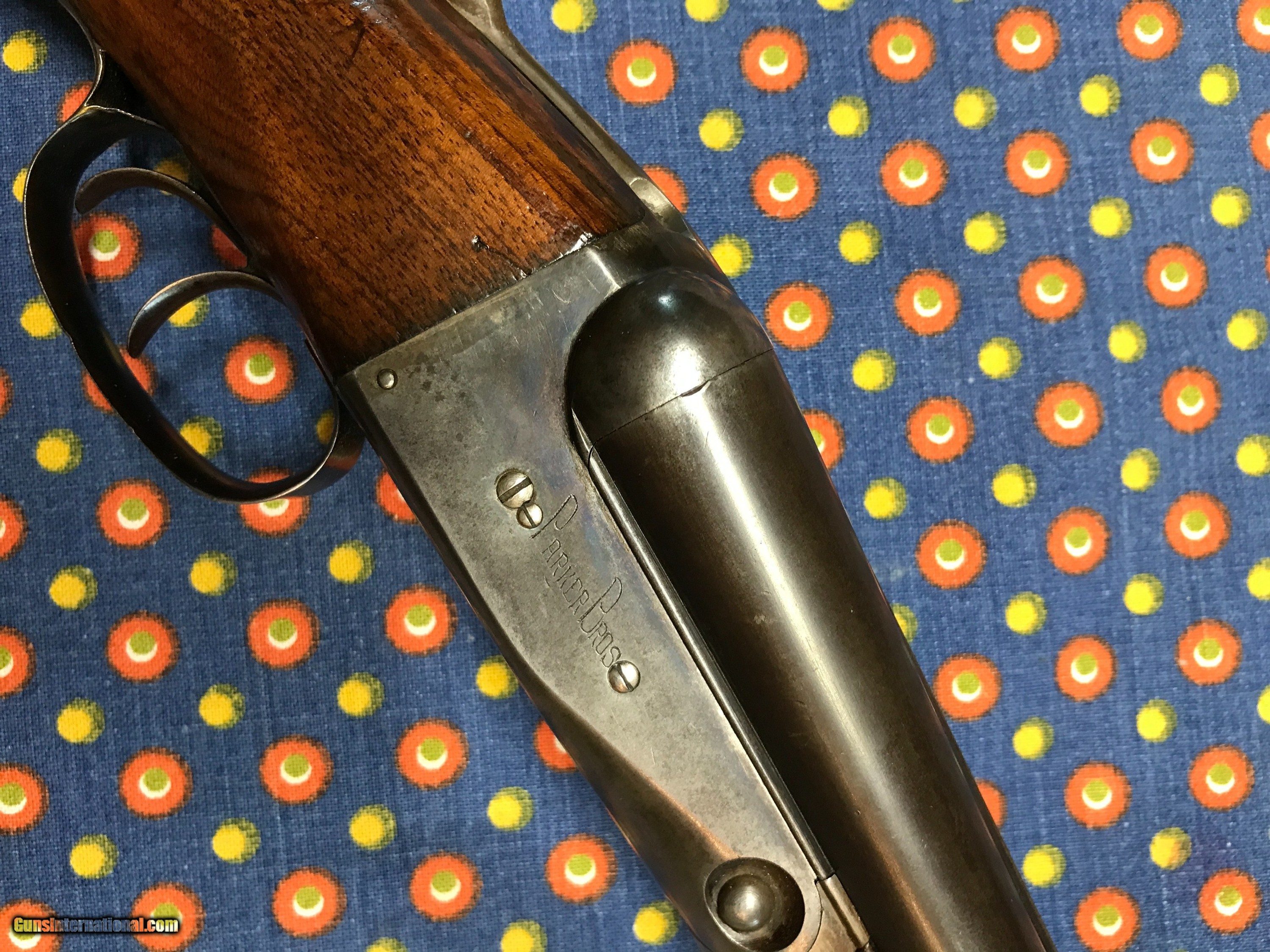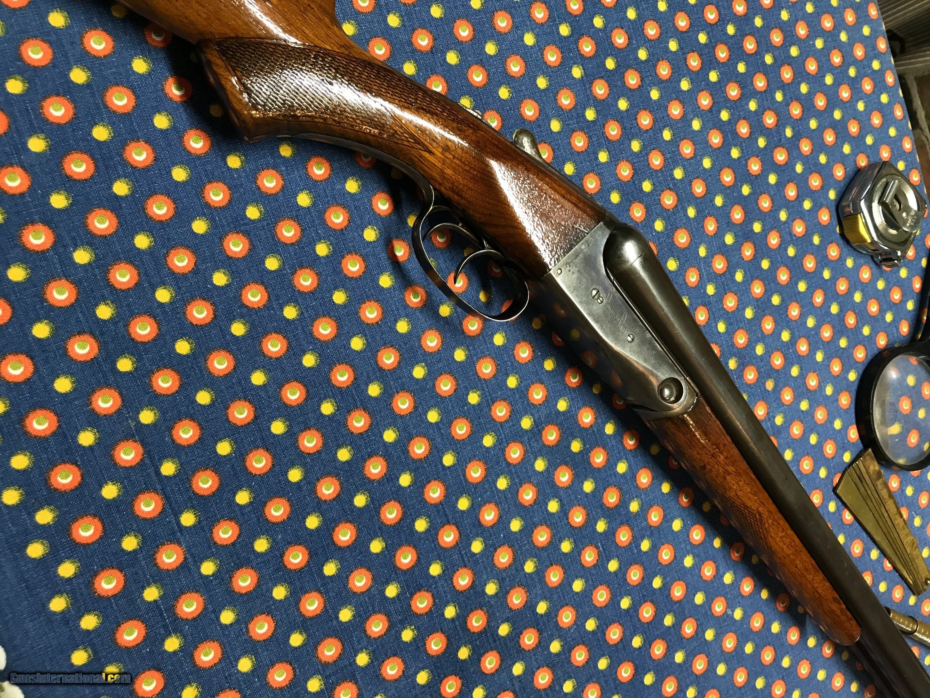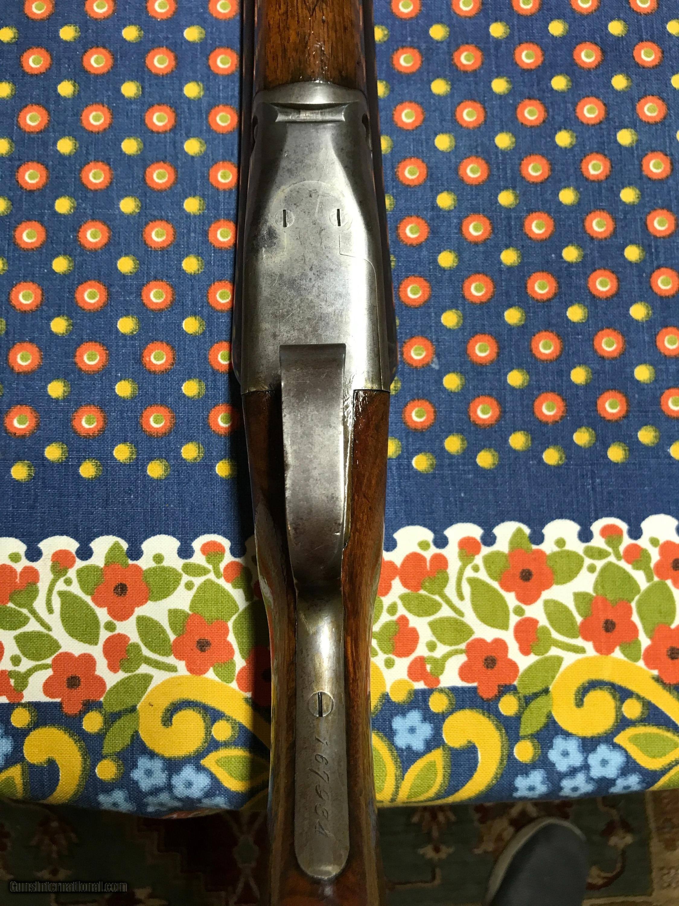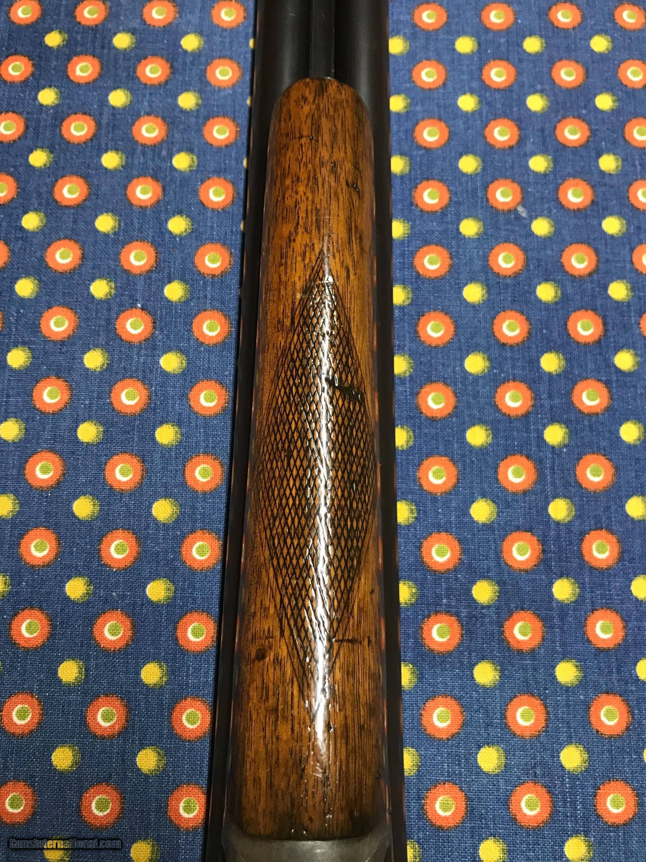 Description: This is a nice old 12 gauge Parker Trojan, made in 1914, the second year of production for these fine hunting guns...The 30" barrels are choked mod and full...2 3/4" chambers, with excellent bores...14" length of pull...Weighs 7 1/3 pounds...Serial #167xxx...Most of the barrel blue is still there...Faded case colors...A coat of glossy varnish has been added to the wood. Buttplate is a Remington marked replacement...Nice tight old gun that is in fine shooting and collecting condition... SOLD Curio/Relic: Yes |
