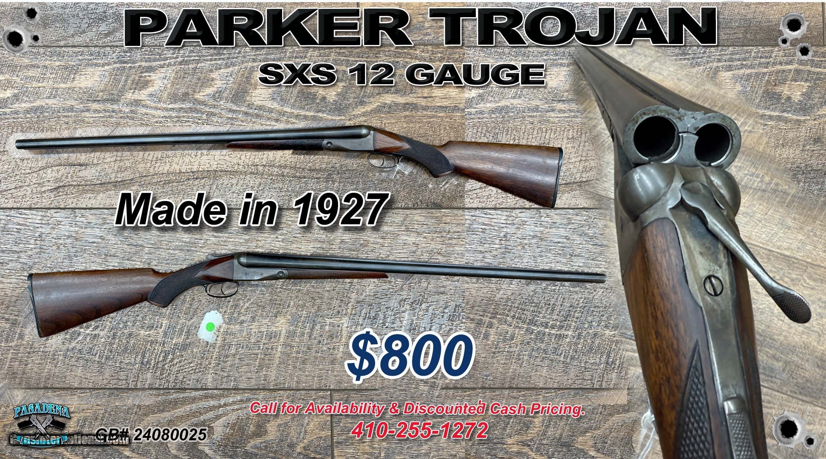 Description: Here is a very good condition Parker Trojan 12 gauge shotgun with 28" barrel that have very good bores choke full and mod.This was made in 1927 with a serial number of:221195.This is C&R eligible and ships for free through October 31, 2024 in the continental US.We do not charge you any CC fees.All prices are negotiable! SOLD Curio/Relic: Yes Shotgun Gauge: 12 Gauge Manufacturer: Parker Model: Trojan Serial Number: 221195 Barrel Length: 28 Condition: very good Metal Condition: very good Wood Condition: very good Bore Condition: very good |