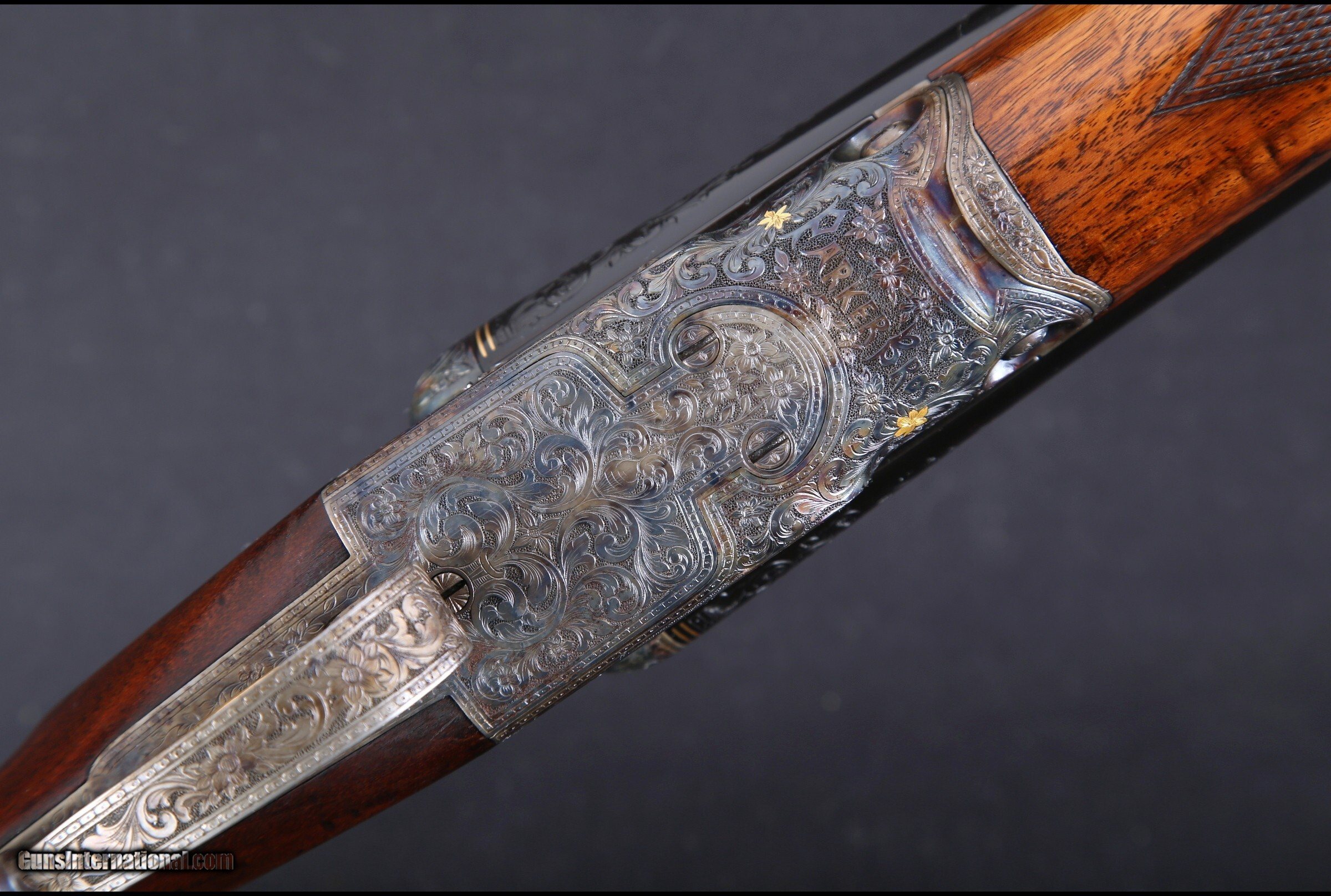 Description: Fantasticly engraved Parker Upgrade. Engraving done by Crowell (signed between the triggers). Action engraved with scroll accompanied by flowers inlaid with gold. Barrels also feature 3+ inches of scroll work and gold trim at the breech. Case colors show brilliantly through the engraving. Shotgun Gauge: 12 Gauge Manufacturer: Parker Model: Upgrade Serial Number: 206809 Barrel Length: 28 inches Chambers: 2 3/4 inches Ejectors: Yes Triggers: Double Triggers Stock Comb: 1 3/8 inches Stock Heel: 2 1/4 inches LOP: 14 inches Weight: 6 lbs. 14 oz. Choke Left: .034 inches Choke Right: .008 inches Engraving: Crowell Price: $9,995.00 Contact Seller |