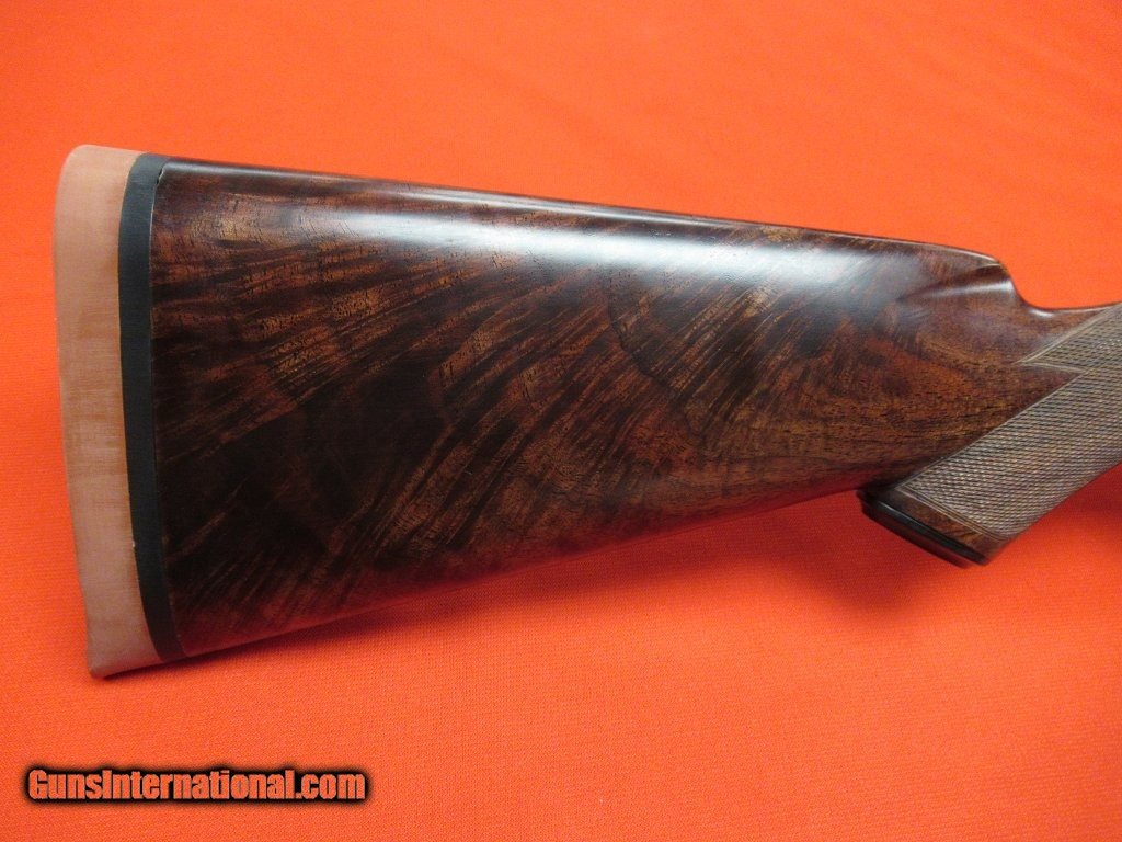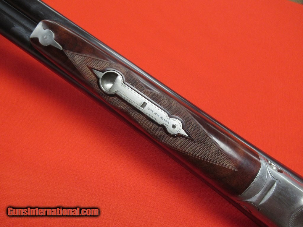 Description: Parker V Grade 12ga/28" Refinished -- Parker V-Grade with #2 frame: polished receiver, double trigger extractors. This gun has been restocked with nicely figured American Walnut, barrels have been rust blued. Stock measures: 1 7/8" x 2 5/8" x 14 over a No Shock recoil pad. Very nice condition overall. SOLD |