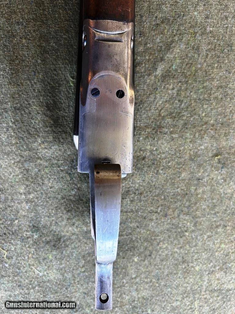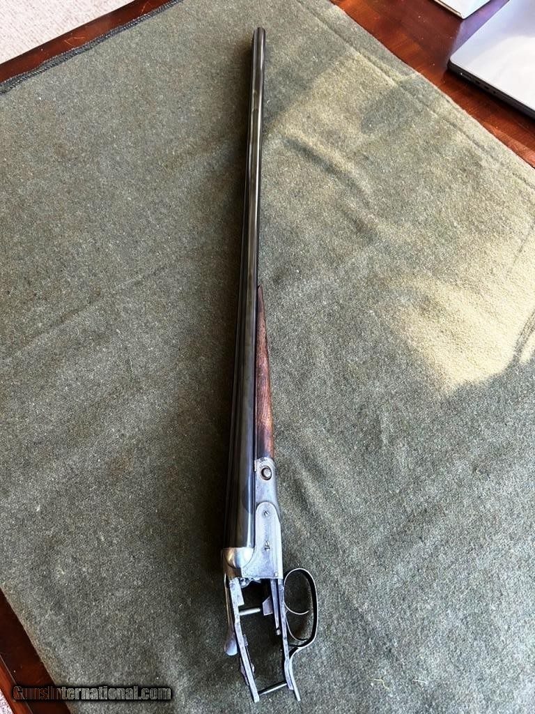 Description: This is a project piece obviously. The gun is complete and the barrels match the receiver and the forearm Iron also matches. It's got a "0" frame. The bores are excellent, and are choked IC/IM. The barrels are 27" long. ( yes, they may very well have been cut to 27" as the top rib doesnt have that small smooth strip in front of the front sight bead, but the chokes are there and the muzzle is clean. see PICS. I cant prove it one way or the other.) The barrels have a nice blue and the top rib says its Vulcan Steel. The barrels ring too. The bores are smooth and shiny. The trigger gaurd was cut in anticipation of fitting it to a straight grip butt stock. There is no buttstock. The gun is complete,to include the automatic safety (which I have in a small bag so it wont be lost) but it will need to be cleaned, case colored and restocked by your gunsmith/stock maker. These guns sell upwards of 5K and this is an opprtunity to get one that you can customize to your dimensions for a great price. It is of course sold "as is". We have two of these project guns that came out of an estate belonging to a gunsmith who has passed. The other is an interesting WC Scott 12 bore. Must ship to an FFL. Credit cards need to add the 3% fee, VISA and MC are accepted. Cashiers checks and even personal checks are accepted, but no USPS money orders please. You will also pay the actual shipping cost to your FFL dealer, via FedEx. We don’t ship via USPS. I will send you the FedEx tracking number when your item ships. If you have any questions, please let me know. Strength and Honor! SOLD |