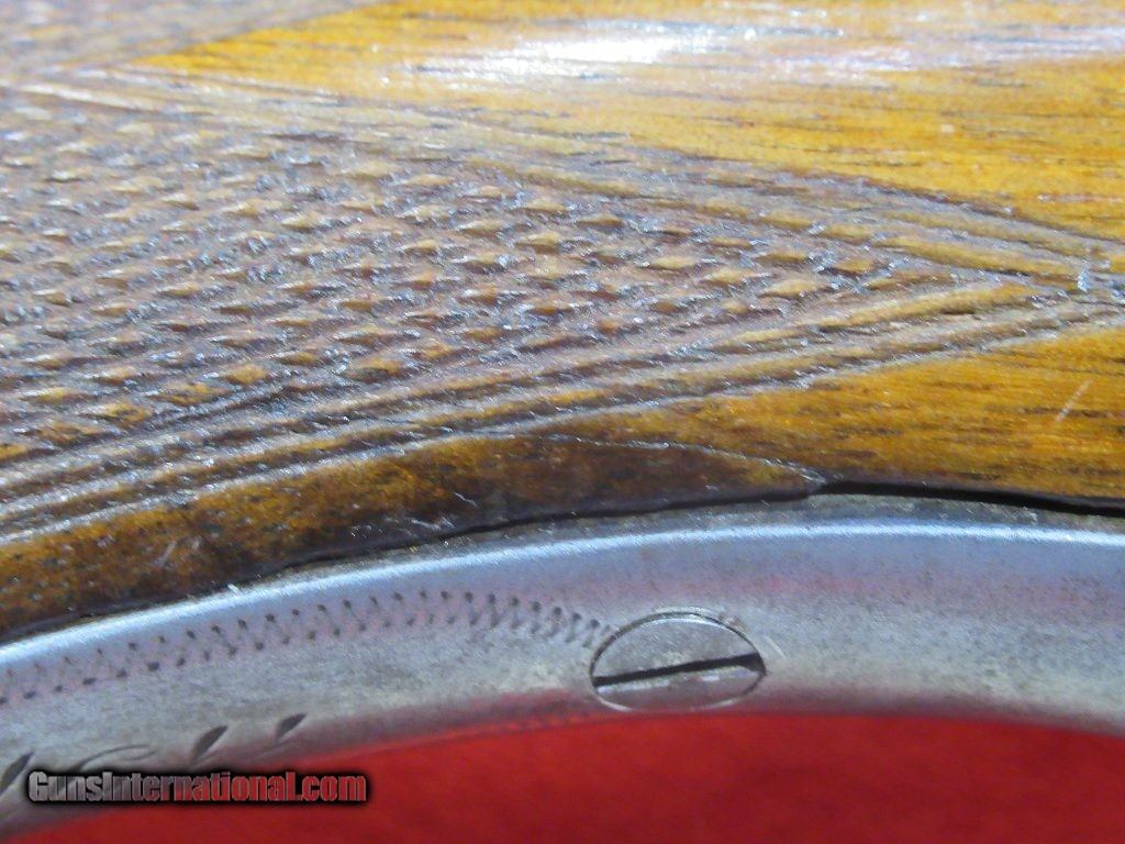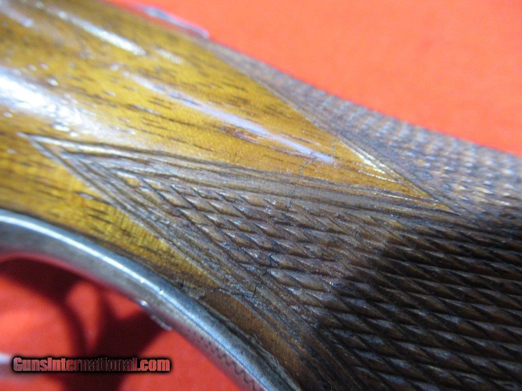 Description: Gun remains in good condition with a crack in the wrist area of the stock; number 2 frame, lengthened forcing cones, extractors, 2 triggers and dogs head butt plate. Good tight action. Mod/Full. SOLD |