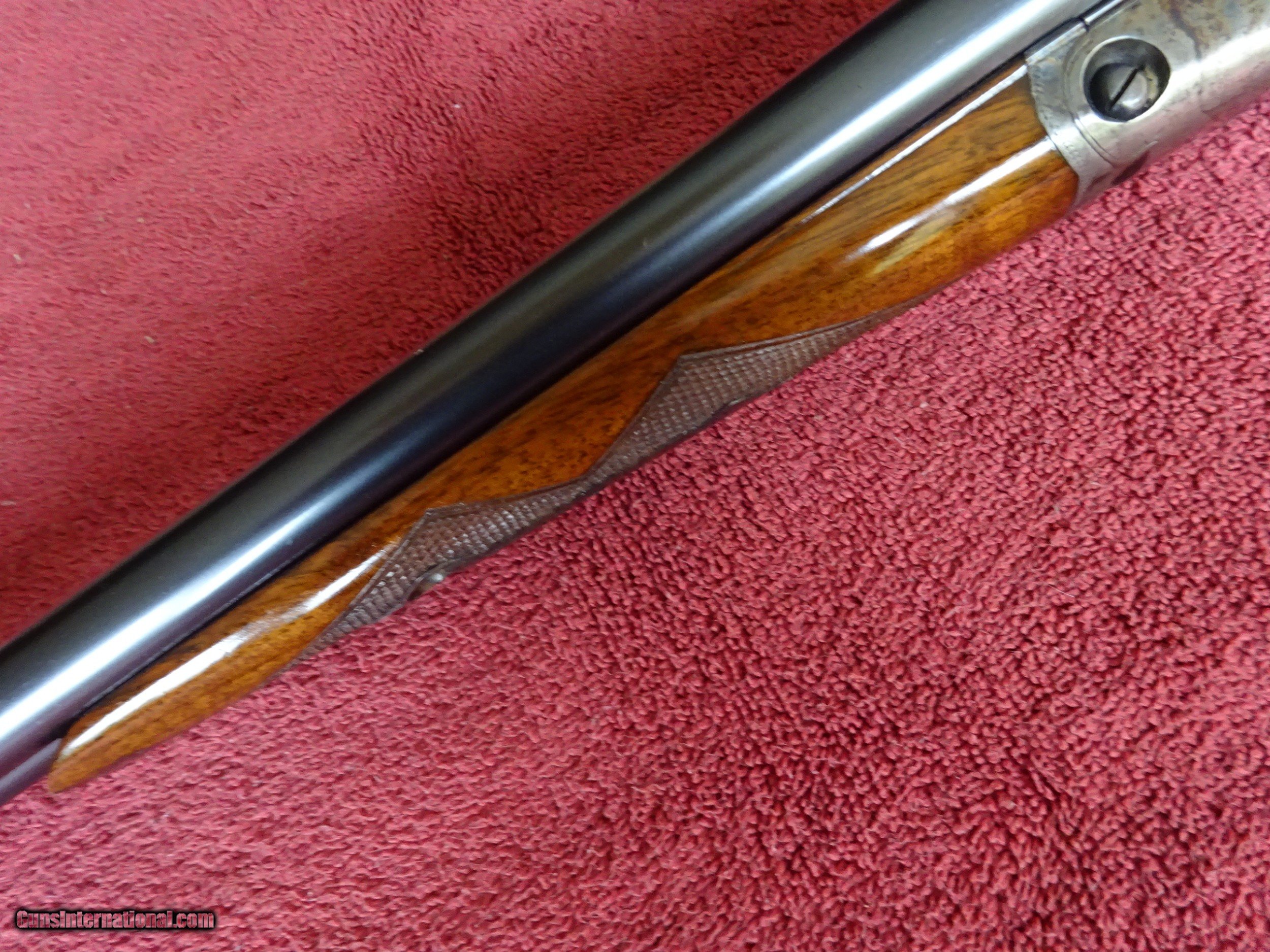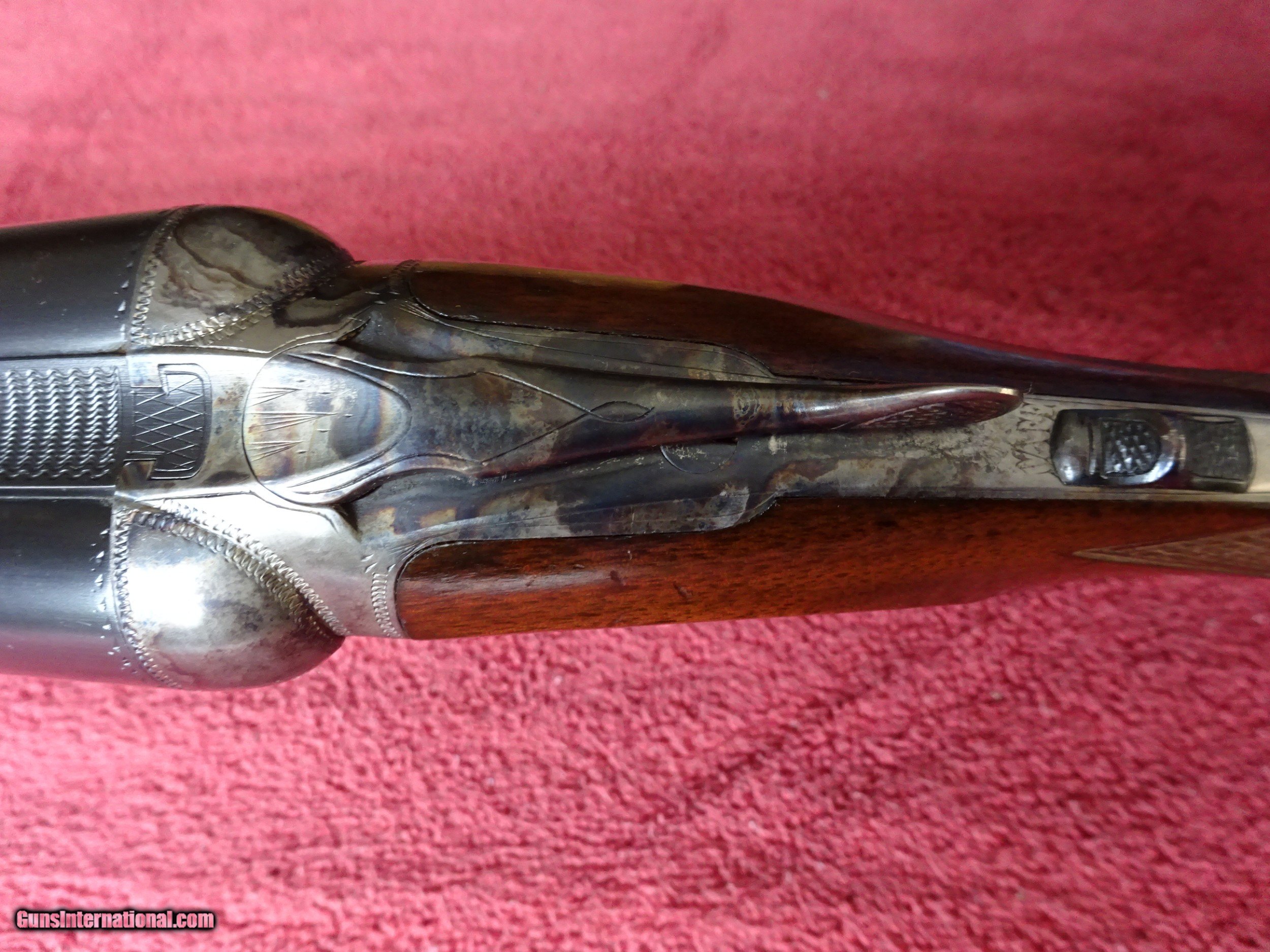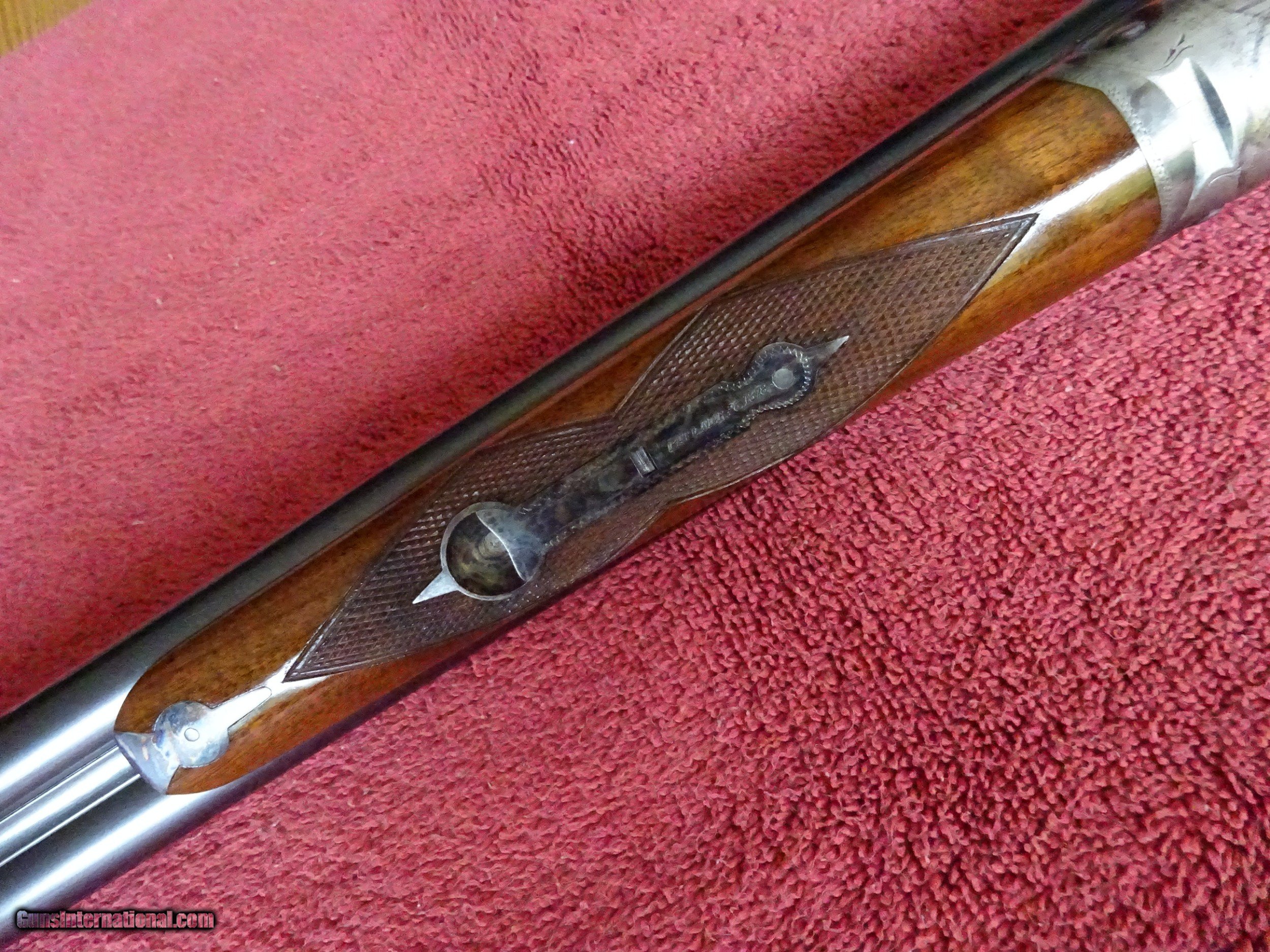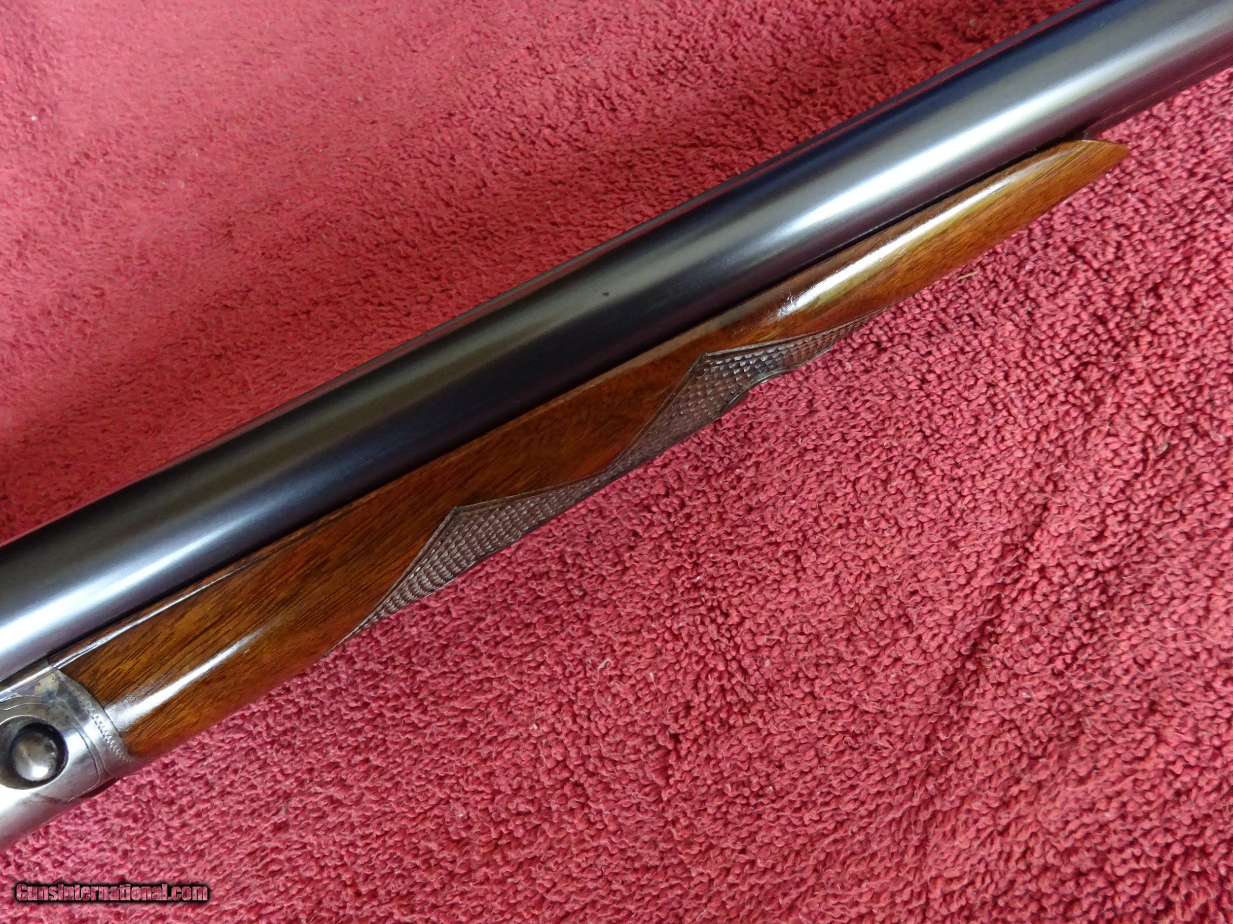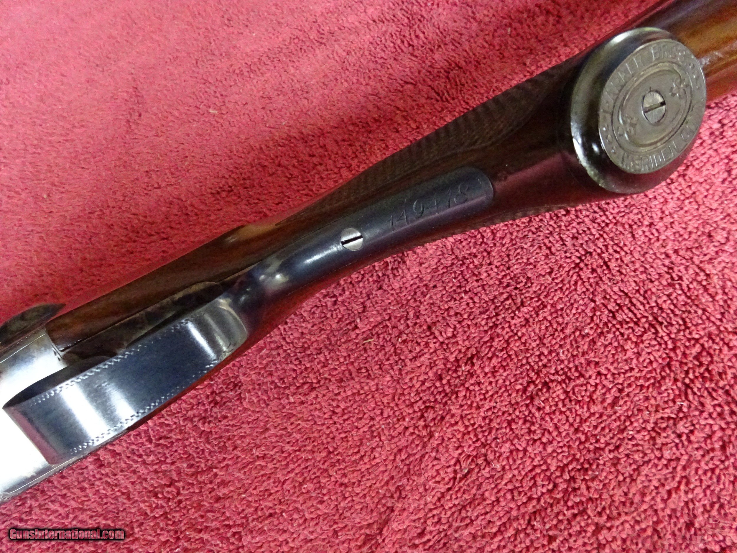 Description: PARKER VH GRADE 16 GAUGE, O FRAME, 28" BARRELS, FULL AND MODIFIED, 2 3/4" CHAMBERS, 100% BRIGHT BLUE, MIRROR PERFECT BORES, WALTER KING STAMP, BARRELS RING LIKE A BELL. VIRTUALLY PERFECT MARKINGS AND SCREWS. BOLD VIVID CASE COLOR, TOP LEVER TO THE FAR RIGHT, TIGHT AS NEW. WOOD TO METAL FIT IS PERFECT. PISTOL GRIP STOCK, SPLINTER FOREARM, EXCELLENT WOOD AND CHECKERING, ORIGINAL GRIP CAP AND DOGHEAD BUTTPLATE. GREAT DIMENSIONS, 1 1/2" X 2 3/8" X 14 1/4", 6 POUNDS 3 OUNCES. THE GUN WAS PROFESSIONALLY RESTORED, IT SHOWS NO SIGN OF USE. THE COST TODAY OF THIS TYPE OF RESTORATION WOULD BE $5000.00 PLUS. MADE IN 1910. $3500.00 + $50.00 Insured shipping to an FFL address. See all Pats listings We also have hundreds of pieces of ORIGINAL gun company advertising & memorabilia available for sale. We have no reprints or reproductions. Email for more information. SOLD Curio/Relic: Yes Serial Number: 149xxx |