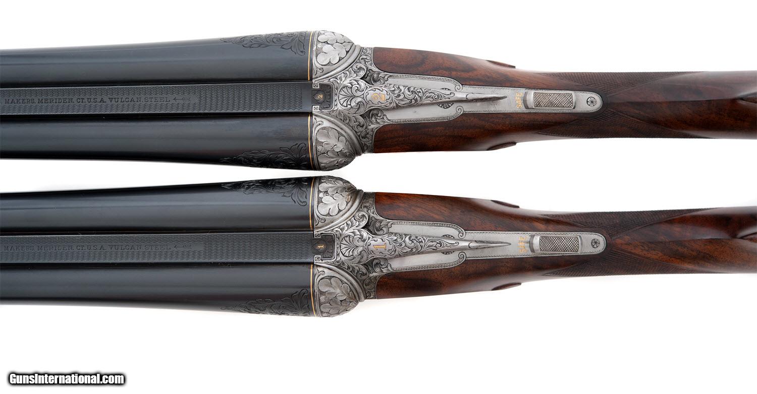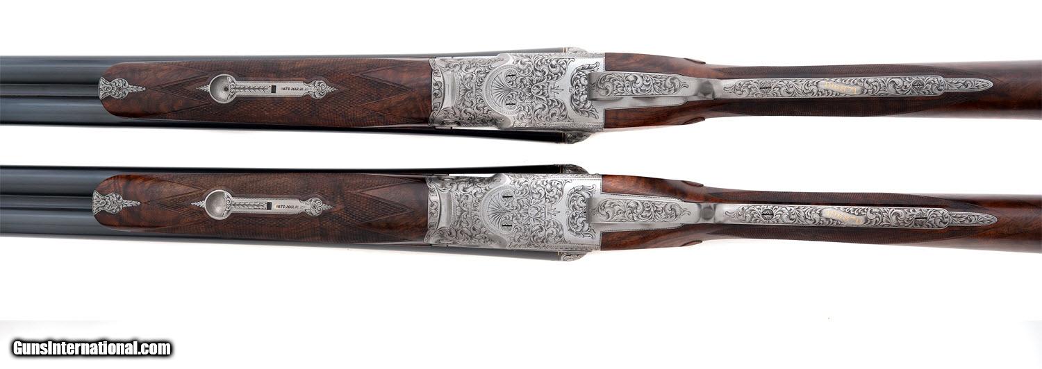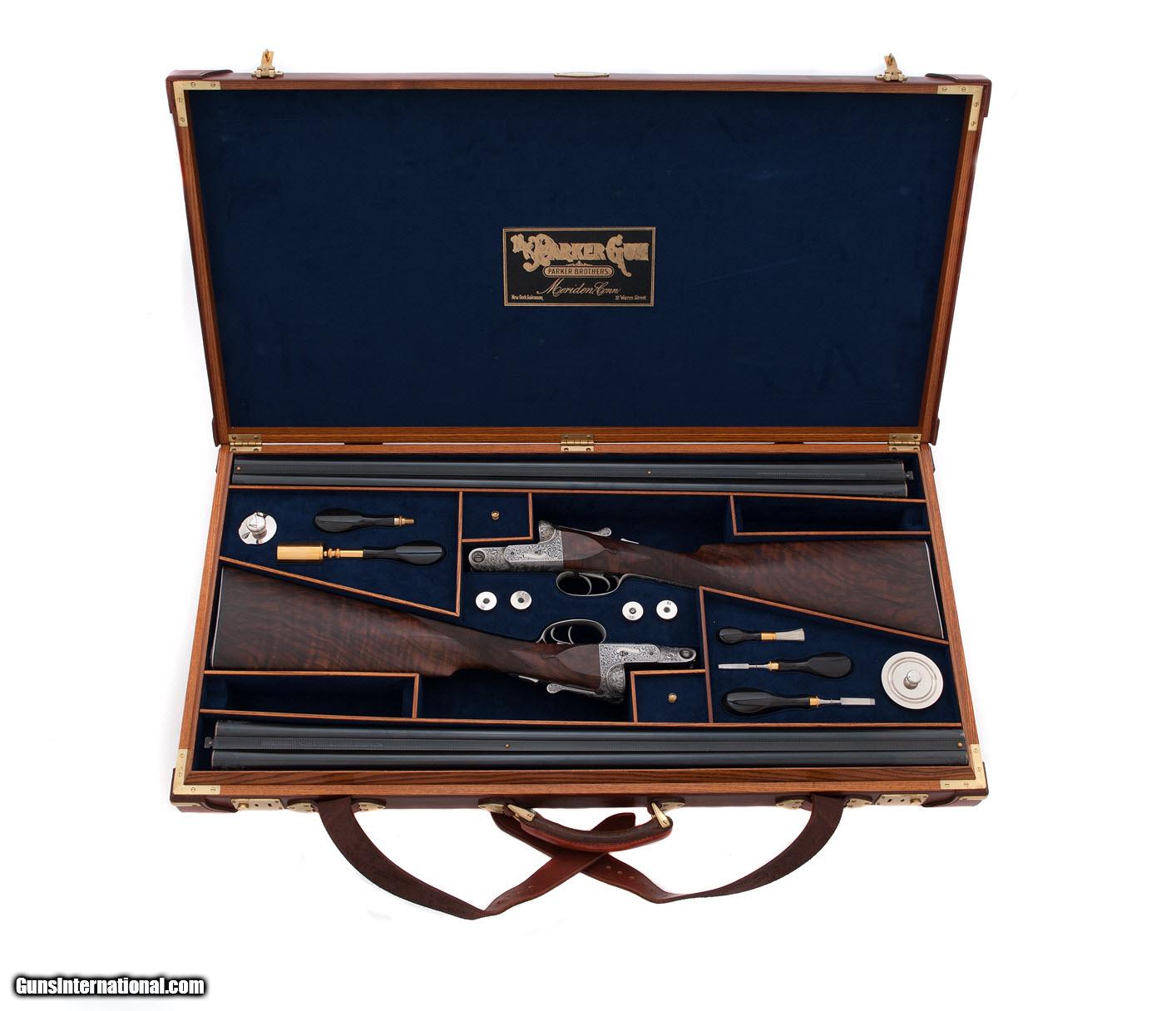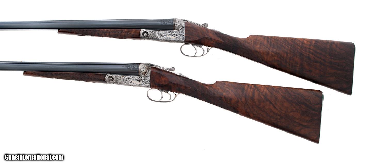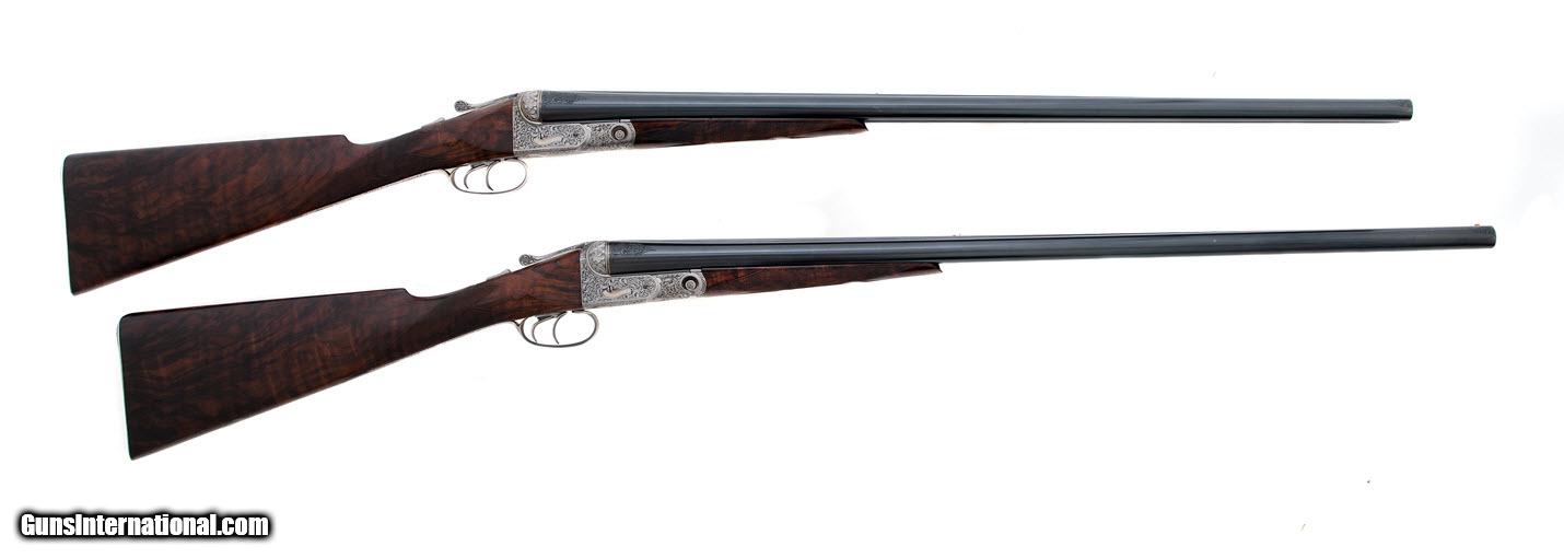 Description: Parker - VH Pair - 12 ga - Item Number: PAR196870/1 Shotgun type: SxS Action: Boxlock Ejectors: Yes Trigger: Double Grip: Straight Grip Forend: Checkered Lop: 14 7/8 " Pad thickness: " Type of butt: Skeleton Buttplate Drop comb: 1 1/2 " Drop heel: 2 1/4 " Cast amount: 3/16 " Cast: Off Weight: 7 lbs, 10 oz Manufactured in: USA Manufacture Year: Finish: Coin & Black Overall condition: Very Good Stock condition: Very Good Metal condition: Very Good Stock: Original finish Metal: Original finish Type of Case: Oak & Leather Case with Canvas Cover Extra barrels: 0 Barrel info: Gauge: 12 ga Chamber: 2 5/8 " Length: 30 " Chokes: M/M Rib type: Concave Comments : Beautiful pair of guns in very good condition. SG-25 SOLD |