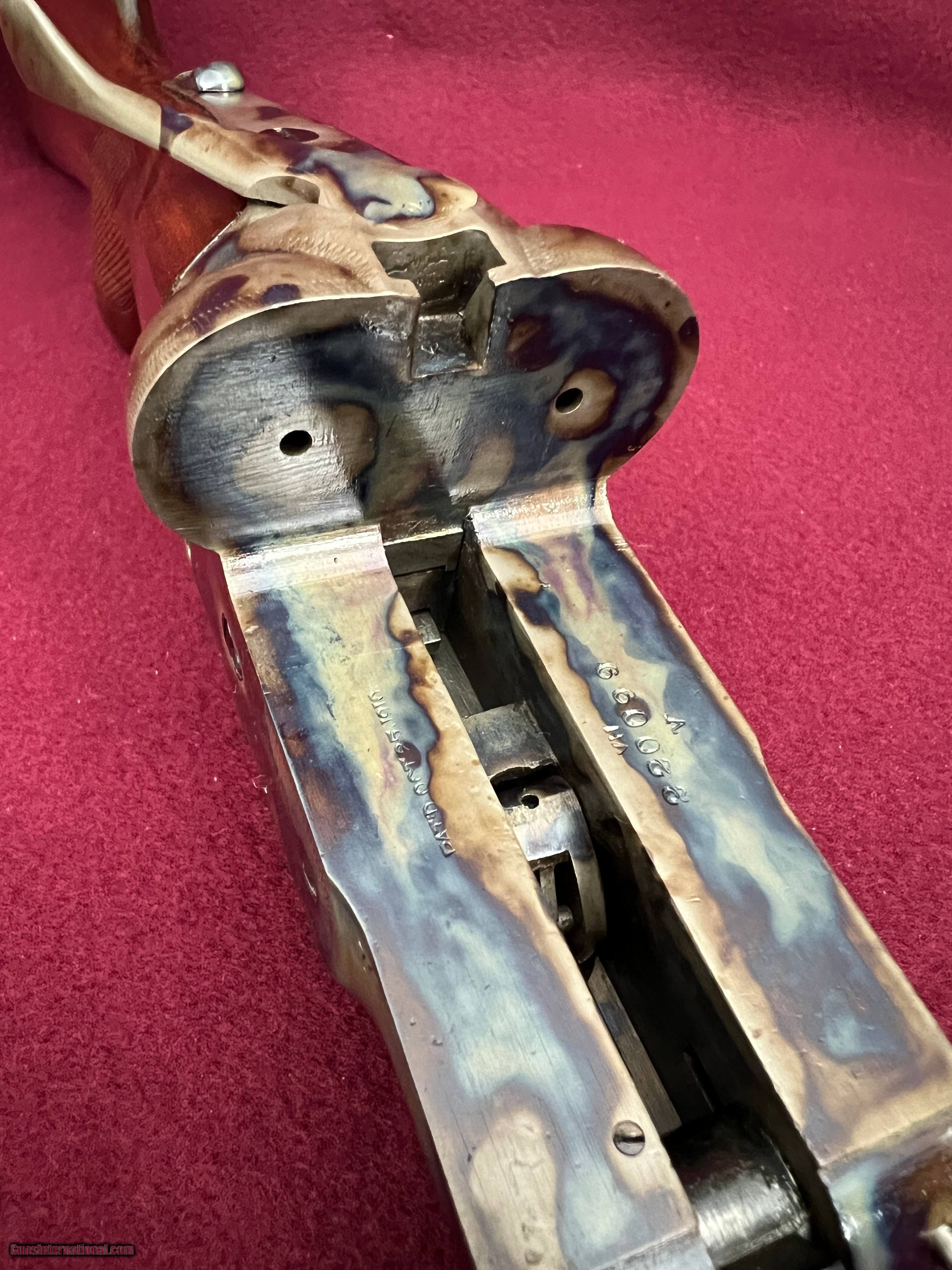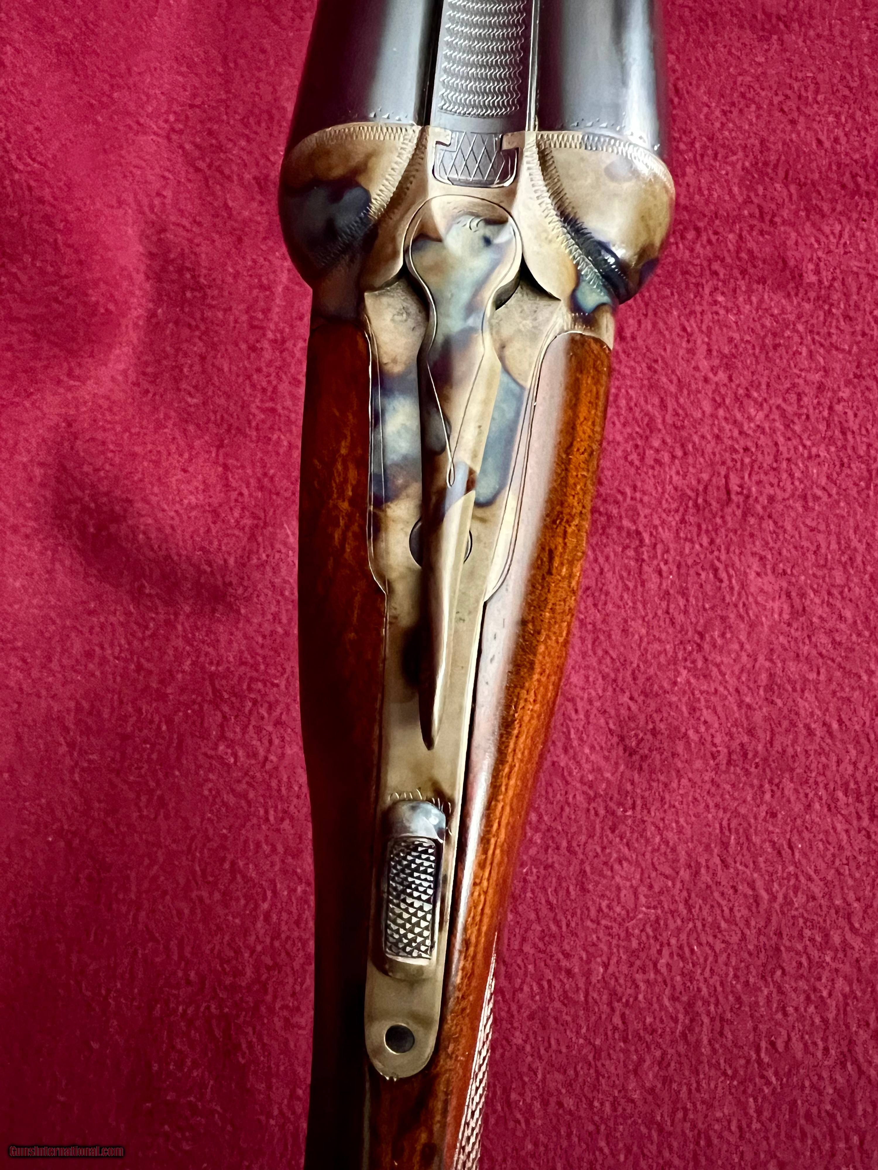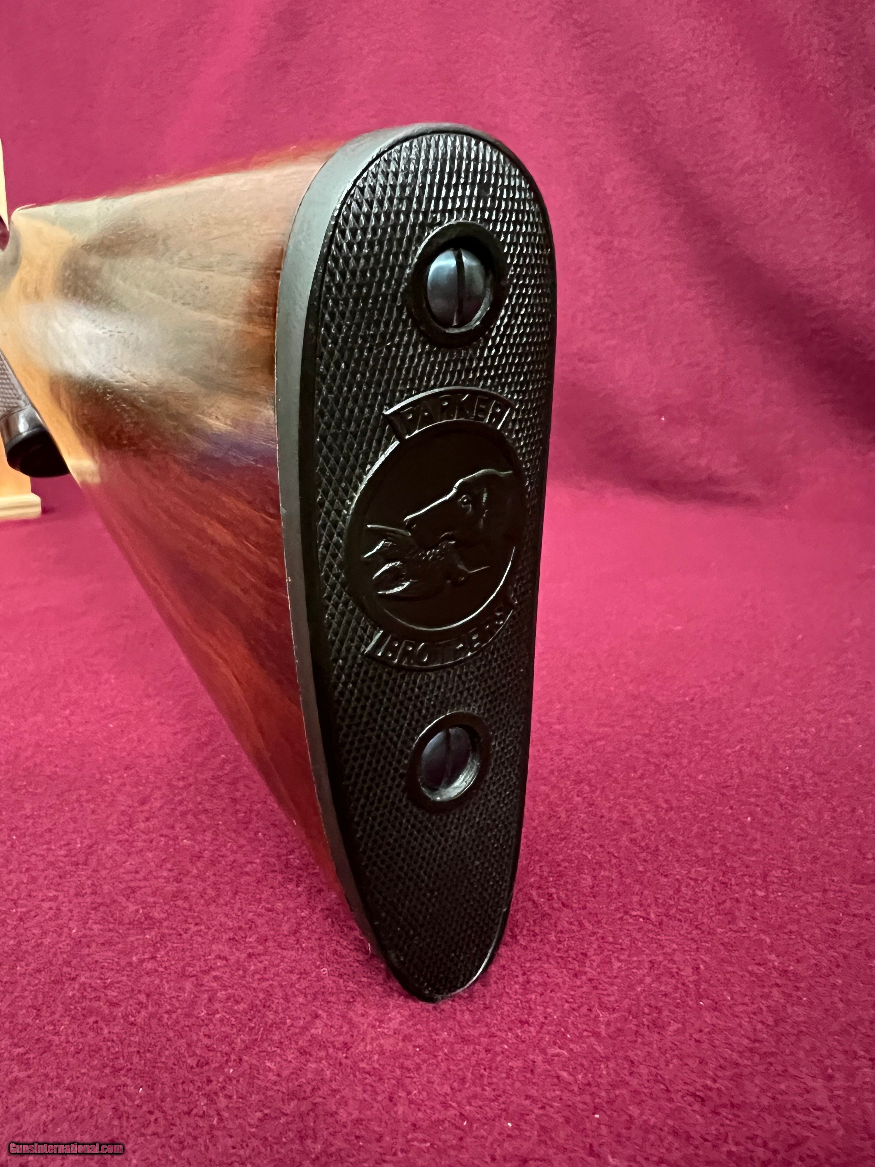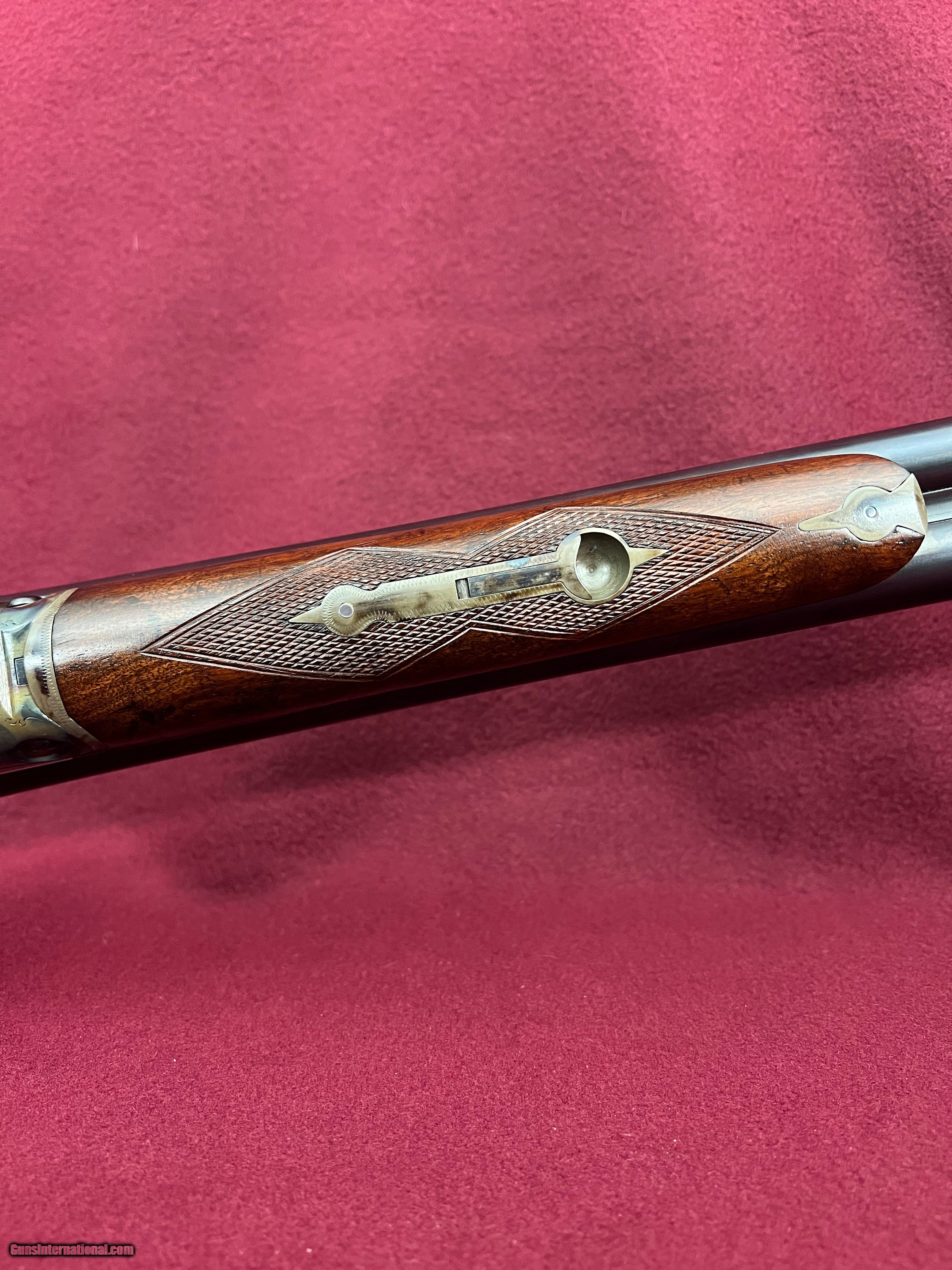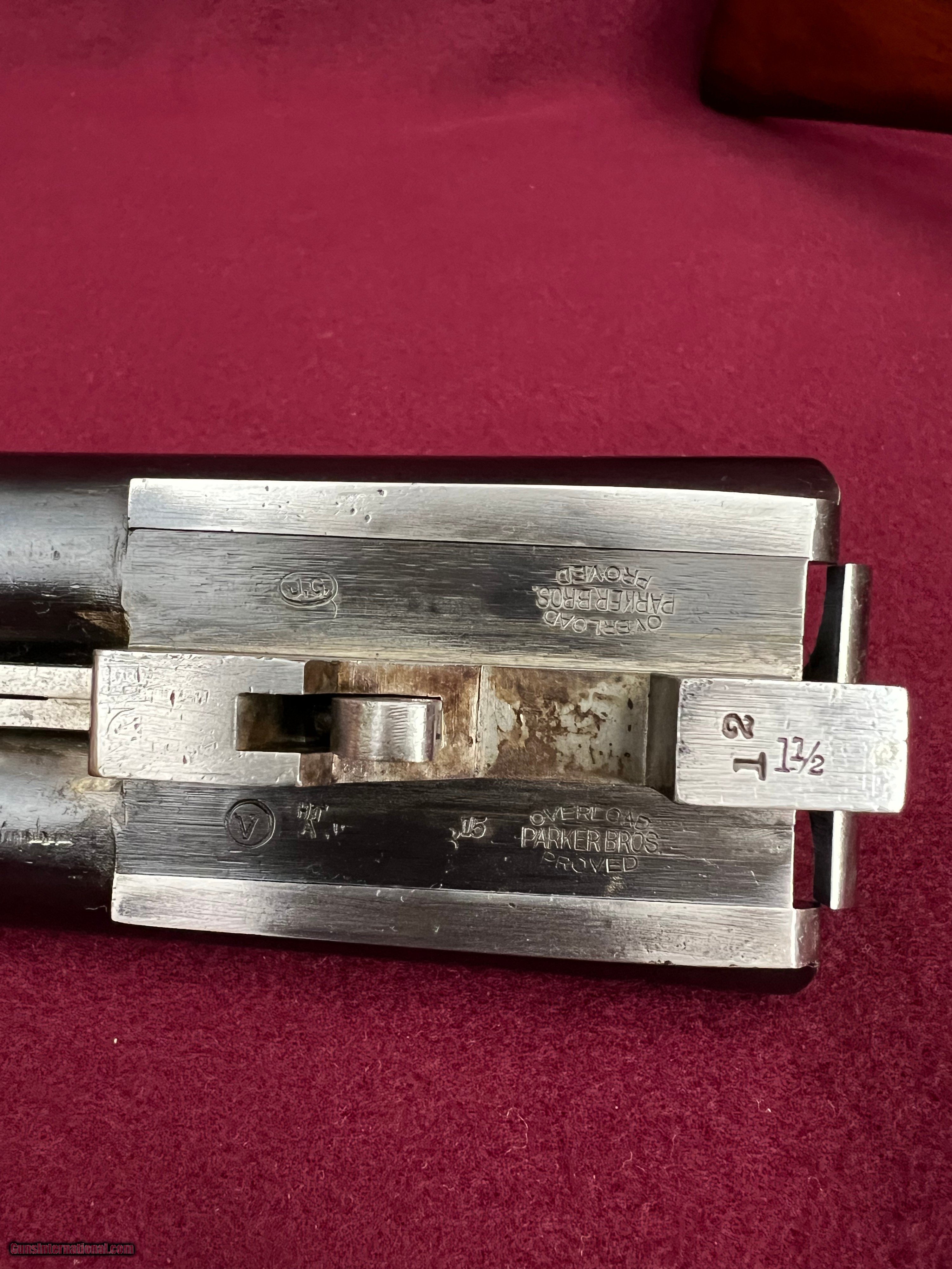 Description: I have for sale a really nice and very well done Parker VHE number 220099 (all numbers matching) built in 1926 in 12 gauge with 1 1/2 frame. Let me start by saying the person I got the gun from said that Mr. Bachelder restored the gun many years ago and it hadn't been fired since the restoration. Having myself had a gun restored by Mr. Bachelder years ago I would have to say it certainly appears to be his work but I have no documentation other than the man's word. He was not a dealer and didn't know other gunsmiths I mentioned but he knew Mr. Bachelder's name. The gun has 30 inch barrels with 2 1/2 inch original chambers. Right bore measures .734 with .024 of constriction. The left bore measures .733 with .037 of constriction. The ejectors are strong and well timed. The bores are excellent condition and these barrels ring as well as any I've ever had. Barrels are tight on face with no movement even with forend removed. Top lever is slightly right of center as you can see in the pictures. Stock dimensions are a 1 1/2 X 2 7/8 X 14 3/8 over a dogs head butt plate. The case colors have a protective coating and this is another reason I believe it is Mr. Bachelders work. When he did my gun he said he coated it with Tru-oil thinned 50% to protect it. This coating does make the case coloring "pop" and from my experience it does a good job of protecting the case coloring. Price of the gun is $2750 plus $50 shipping to your FFL. There is a three day non-firing inspection period with the buyer paying shipping charges if returned. This will make someone a very nice gun that they can shoot and be proud of. Contact me with any questions you might have. SOLD Shotgun Gauge: 12 Gauge Manufacturer: Parker Model: VHE Serial Number: 220099 Barrel Length: 30 Chambers: 2 1/2 inch Ejectors: Strong well timed Condition: Excellent Metal Condition: Excellent Wood Condition: Excellent Bore Condition: Excellent Action: boxlock Triggers: Double Stock: Caped Pistol Grip Stock Comb: 1 1/2 Stock Heel: 2 3/4 Stock Cast: Neutral Fore End: Splinter Butt Pad: Dogs Head LOP: 14 3/8 Original Rib: Solid concave Finish: Totally Restored Weight: 7 pounds 7 ounces Manufacture Date: 1926 Choke Left: Full Choke Right: Modified |