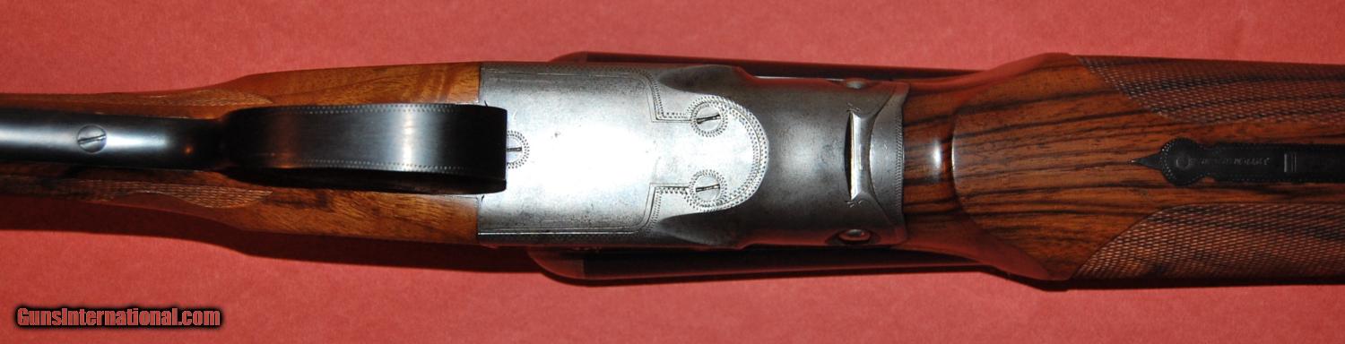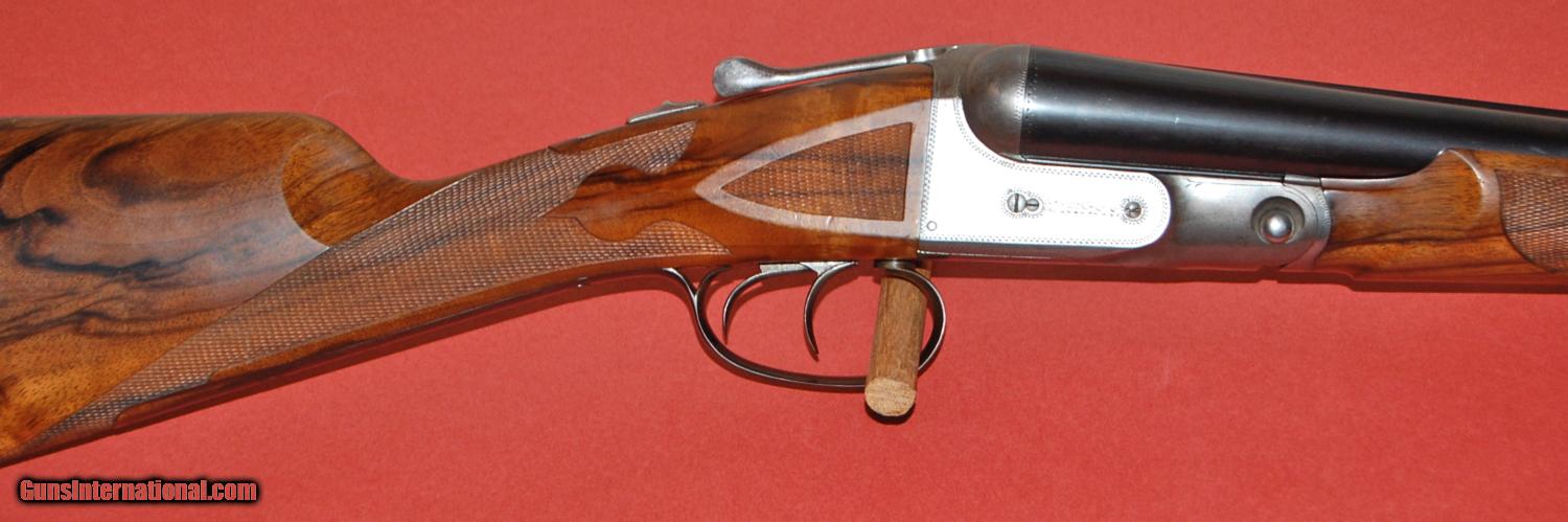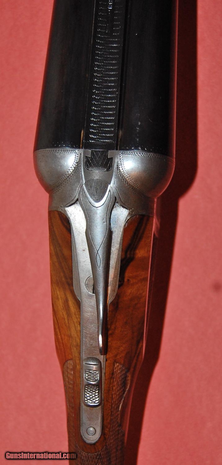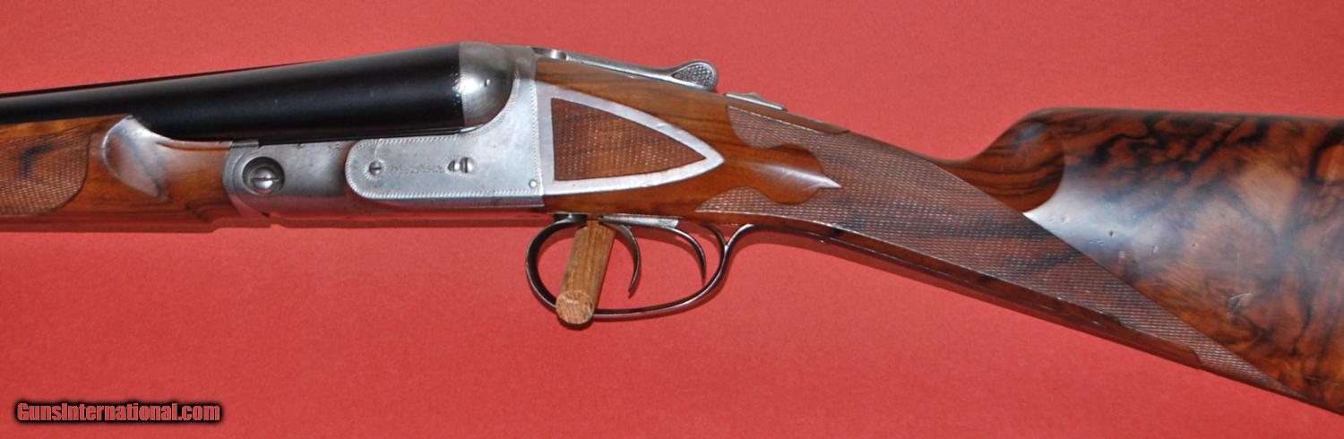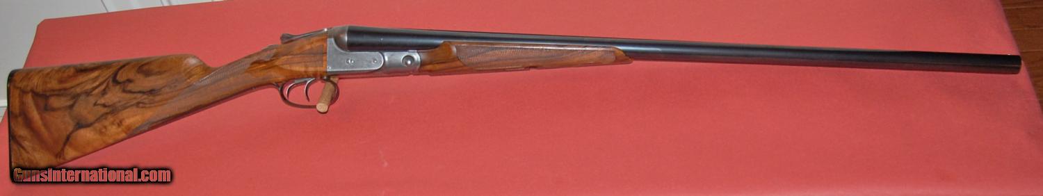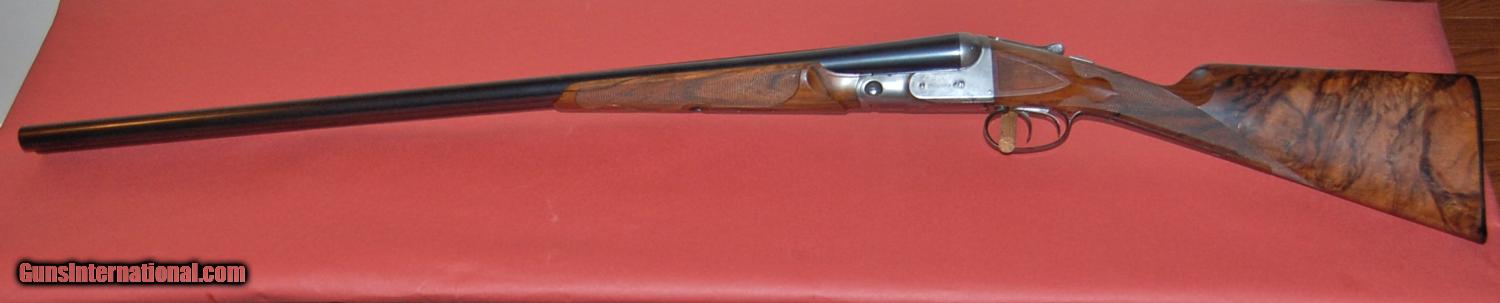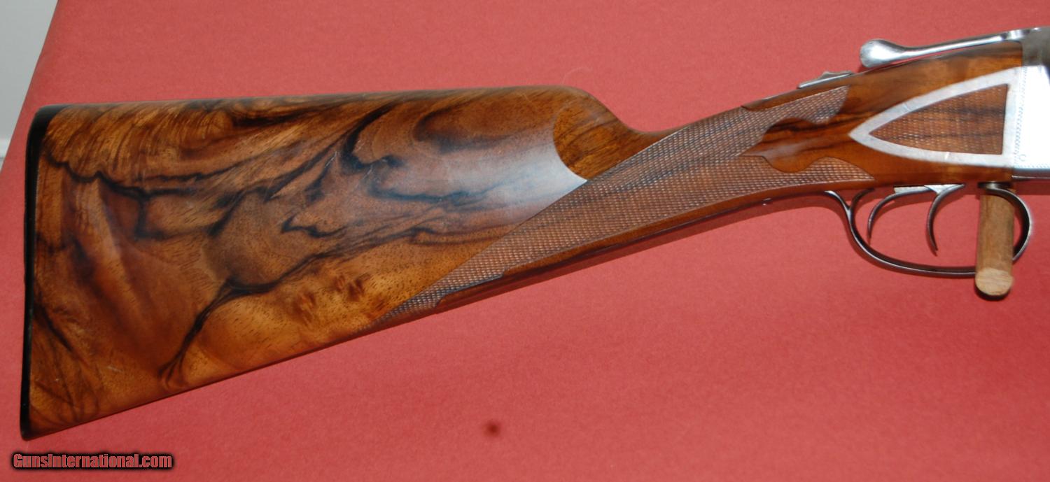 Description: Parker VHE 12ga. with outstanding custom wood.This gun has 30" Vulcan steel barrels choked full (.043") and full (.043").It has double triggers and ejectors.The gun has had a custom straight grip stock and beavertail forend of very highly figured English wanut added.It retains the original dogs head buttplate.The receiver has silvered out and shows no case color.The barrels retain 98% blue from a professional reblacking.The bores are bright and free of rust,pits,or dents.The barrels are on face.this gun would make a great pheasant gun as is.With a little alteration to the chokes it could be made into a fine SxS clays gun.C&R eligible. SOLD Curio/Relic: Yes Manufacturer: Parker Bros. Model: VHE Serial Number: 142958 Chambers: 23/4 Ejectors: yes Barrels: 30 Triggers: double Gauge Info: 12ga. Stock Dimensions: 137/8"x11/2"x21/2 Weight: 7-4 Choke Left: full (.043") Choke Right: full (.043") |