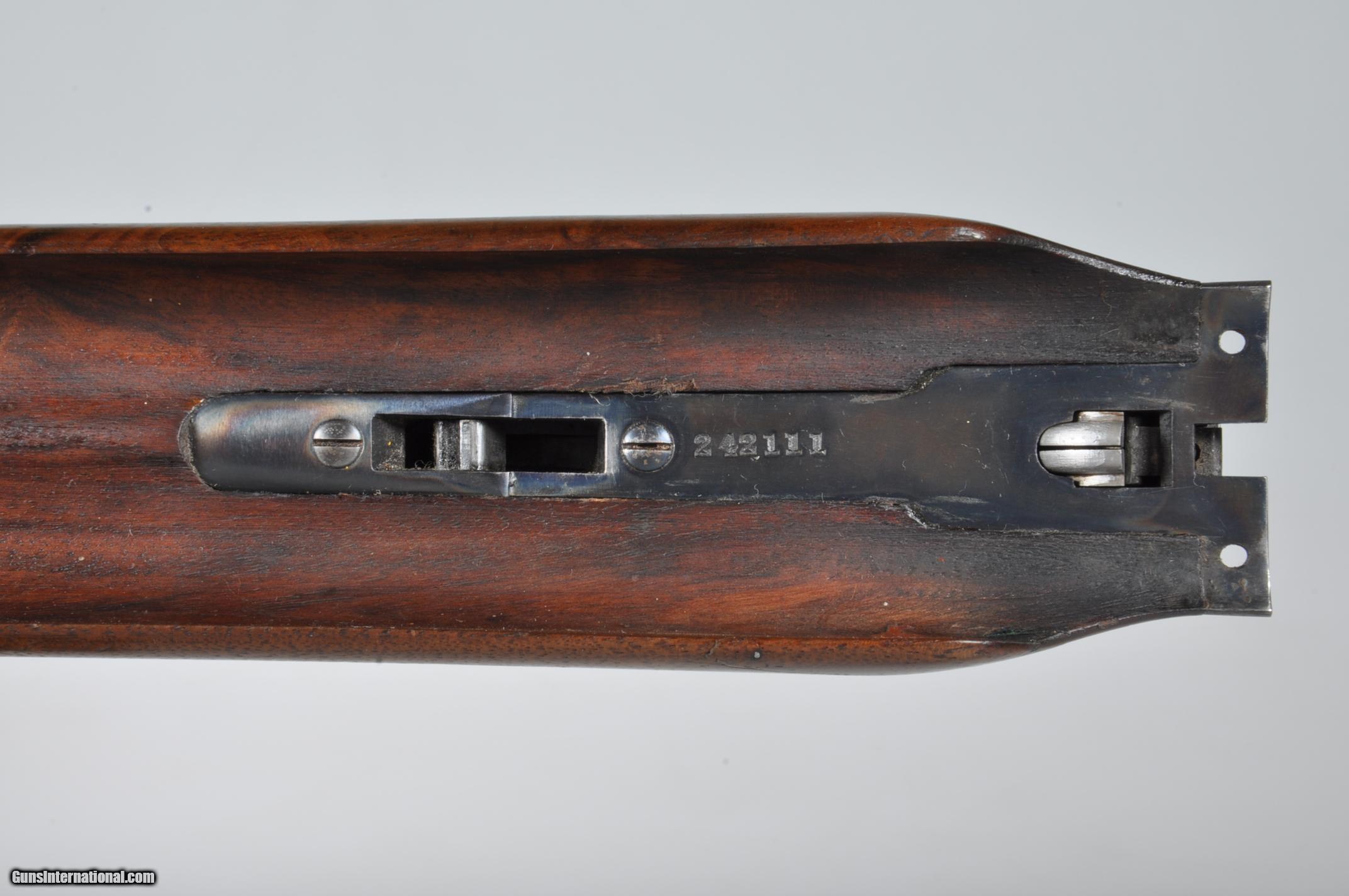 Description: 16 gauge, 28″ barrels, 2 3/4″ chambers. Chokes measure .012 right and .023 left. Full length matte rib with dual white beads. The rib is not marked. Bores are bright and shiny. Double triggers, ejectors, automatic safety. Pistol grip stock is has a 14 3/4” length of pull to the front trigger over a Hawkins recoil pad. Beavertail forearm with repaired crack at left rear. Condition: Barrels retain 95% original bluing with some light handling marks. The #1 frame retains 65% original color. Forend iron has little finish. Floorplate retains 65% original color. Trigger guard retains 50% original bluing. The wood retains most of its original finish with handling marks throughout. Drop at comb: 1 5/8”. Drop at heel: 2 3/4”. Weight: 7.5 lbs. Mechanics are excellent. We prefer to communicate by email. We can not accept credit cards for collectible firearms. We have more than 500 Winchester Model 21s in stock in every grade and gauge. We also have hundreds of Parkers, Fox and LC Smith Shotguns so feel free inquire other fine shotguns. SOLD Manufacturer: Parker Model: VHE Serial Number: 242111 Chambers: 2 3/4 Ejectors: Yes Barrels: 28 Triggers: Double Gauge Info: 16 Stock: Pistol Grip Fore End: Beavertail LOP: 14 3/4 |