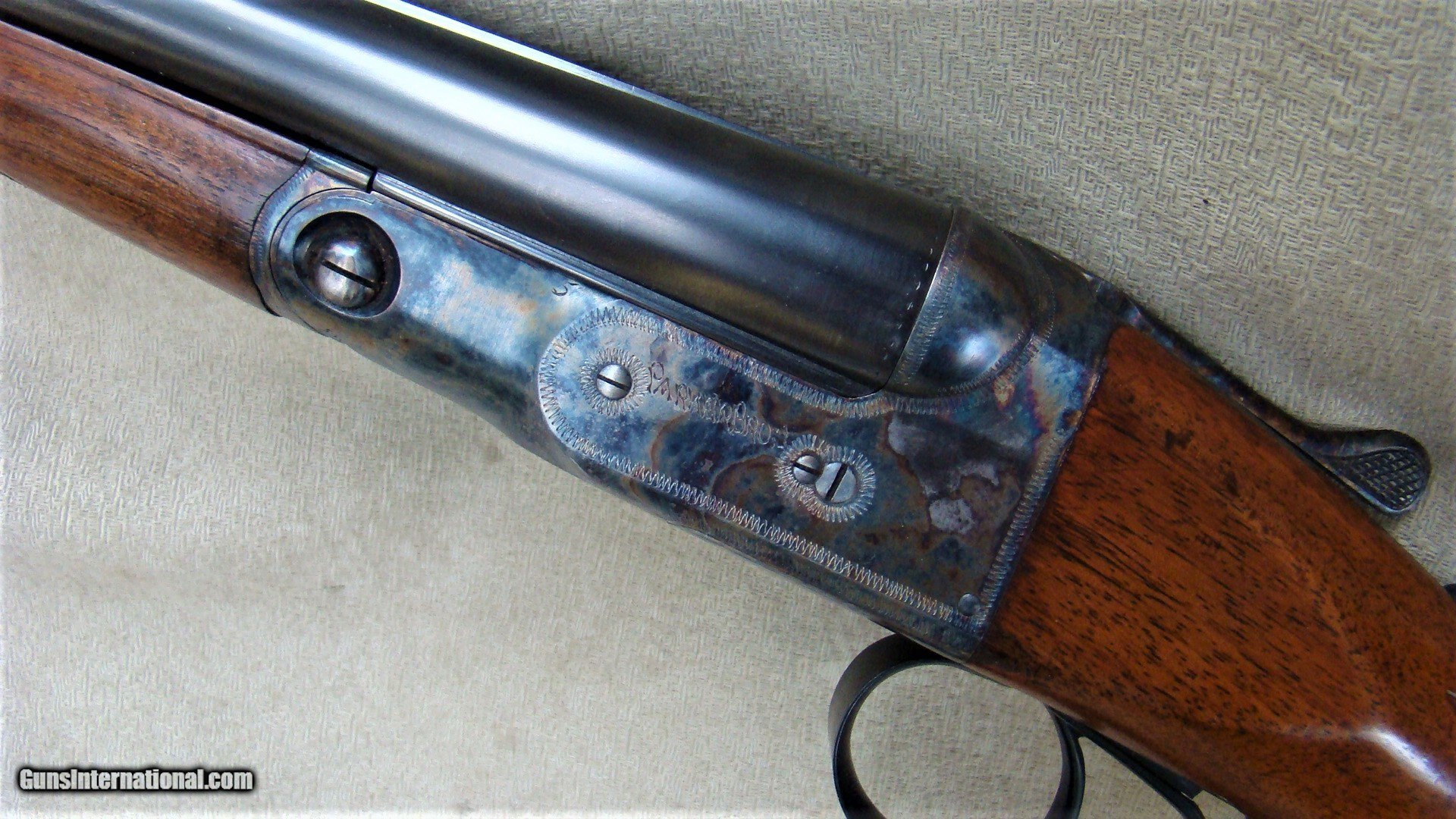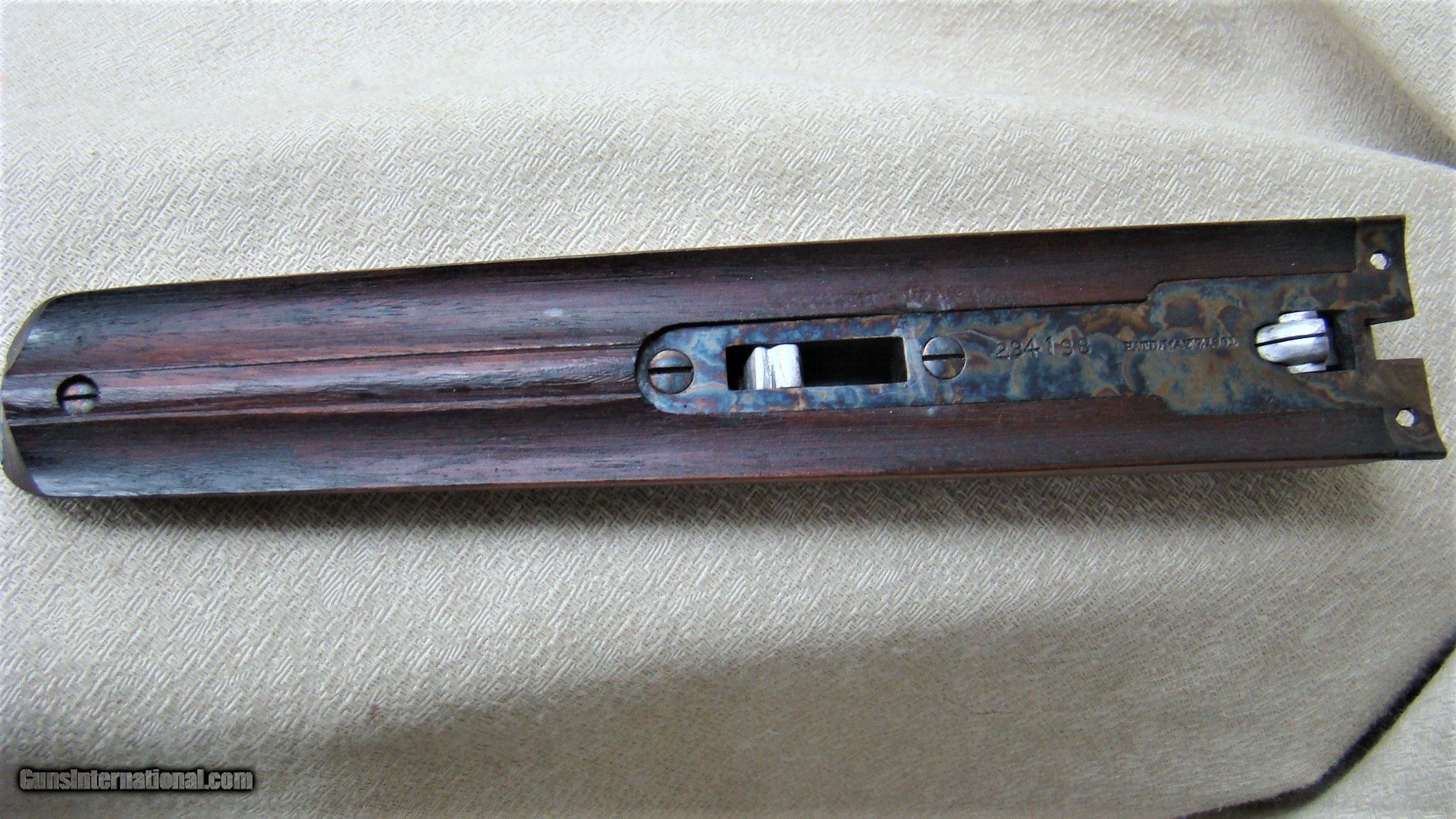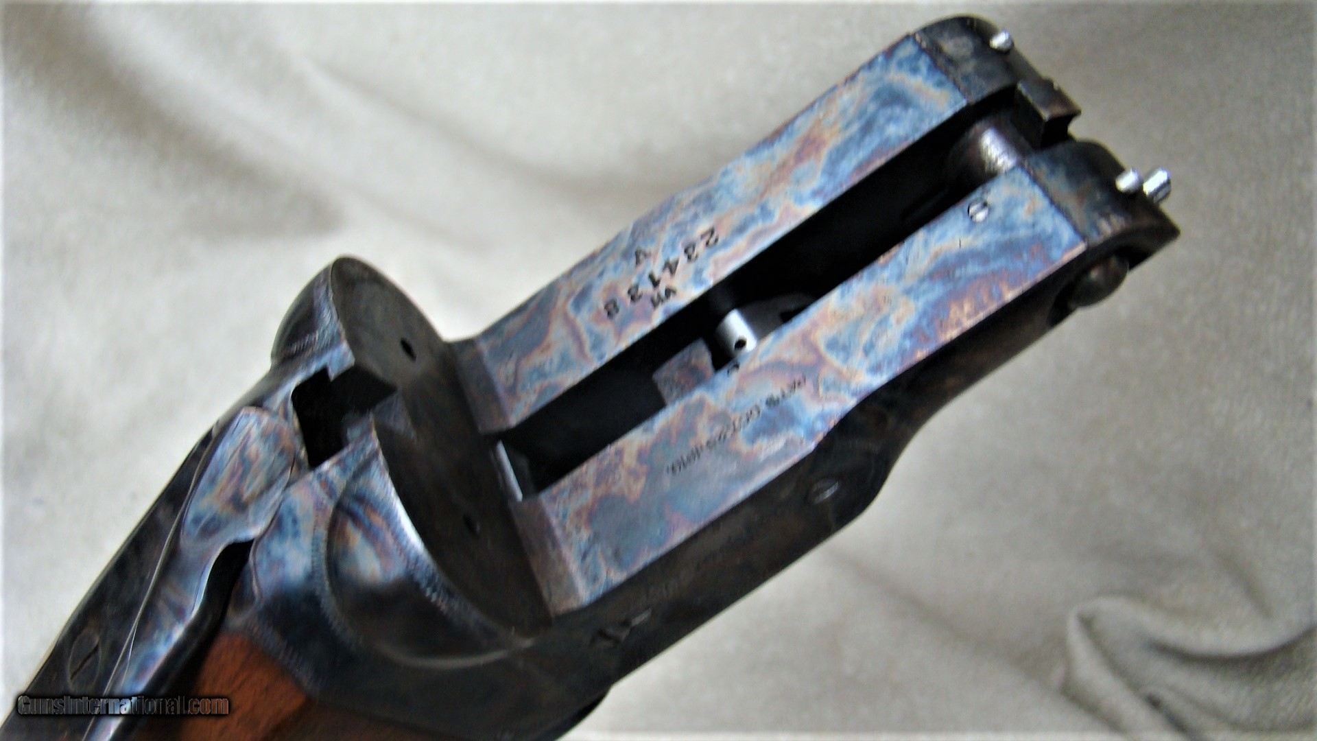Description: Parker Bros. VHE 20 gauge, 26" vulcan steel barrels, 2-3/4" chambers, choked open modified and improved modified (.009/.020). Barrels retain 100 % lustrous rich reblue and are free of dents, dings, etc. Bores are bright and shiny. Splinter forend, pistol grip stock with grip cap shows a nice contrast of color and figure. Stock measures 1-1/2" comb, 2-1/2" heel, 14" LOP over a DHBP. Desirable 20 ga. on the proper "O" frame, double triggers, auto ejectors. Completely renovated by LeFever Arms many years ago and appears about unused since. Weighs 6 lbs, 1 oz. A vintage American classic! SOLD |
