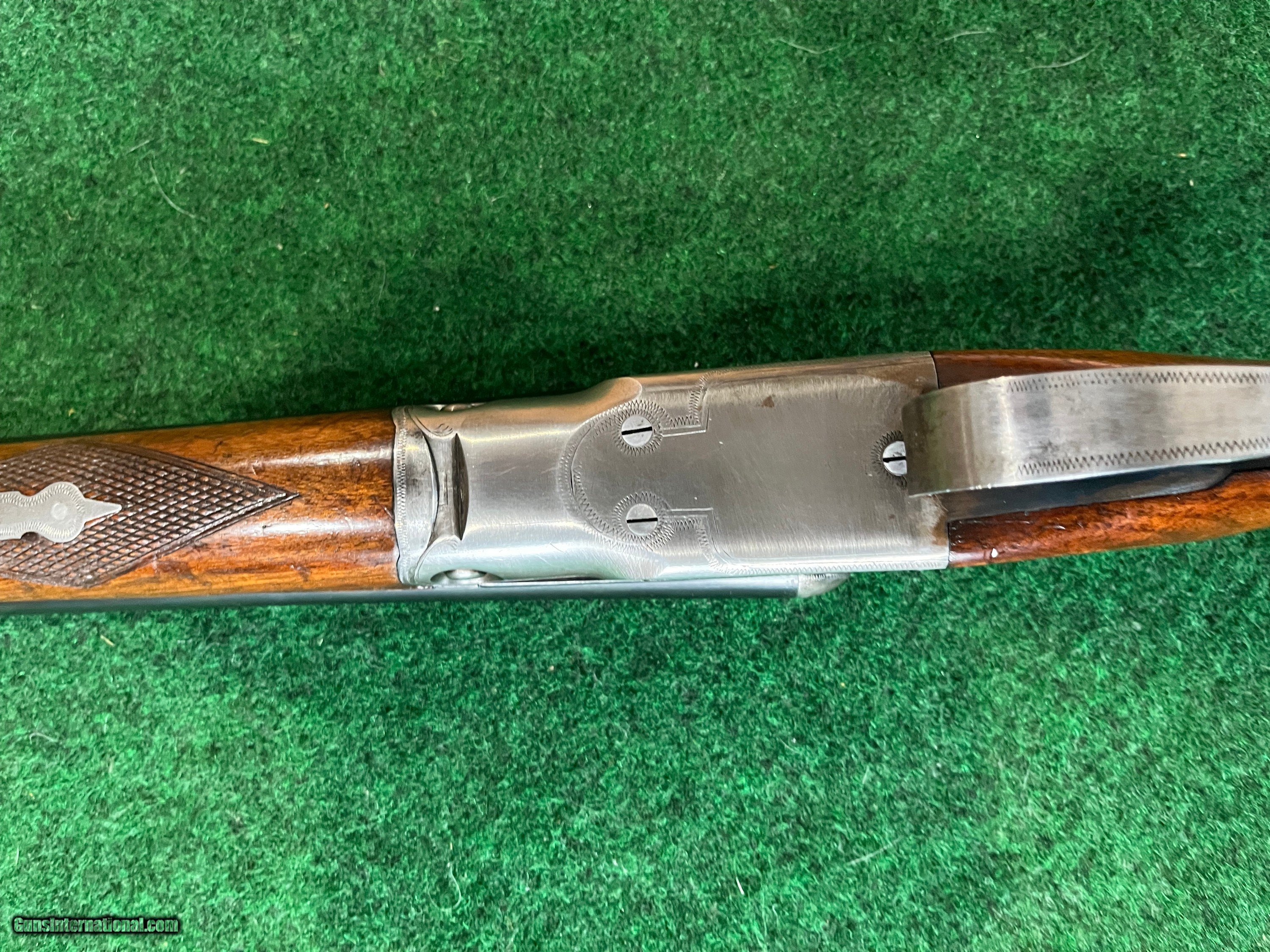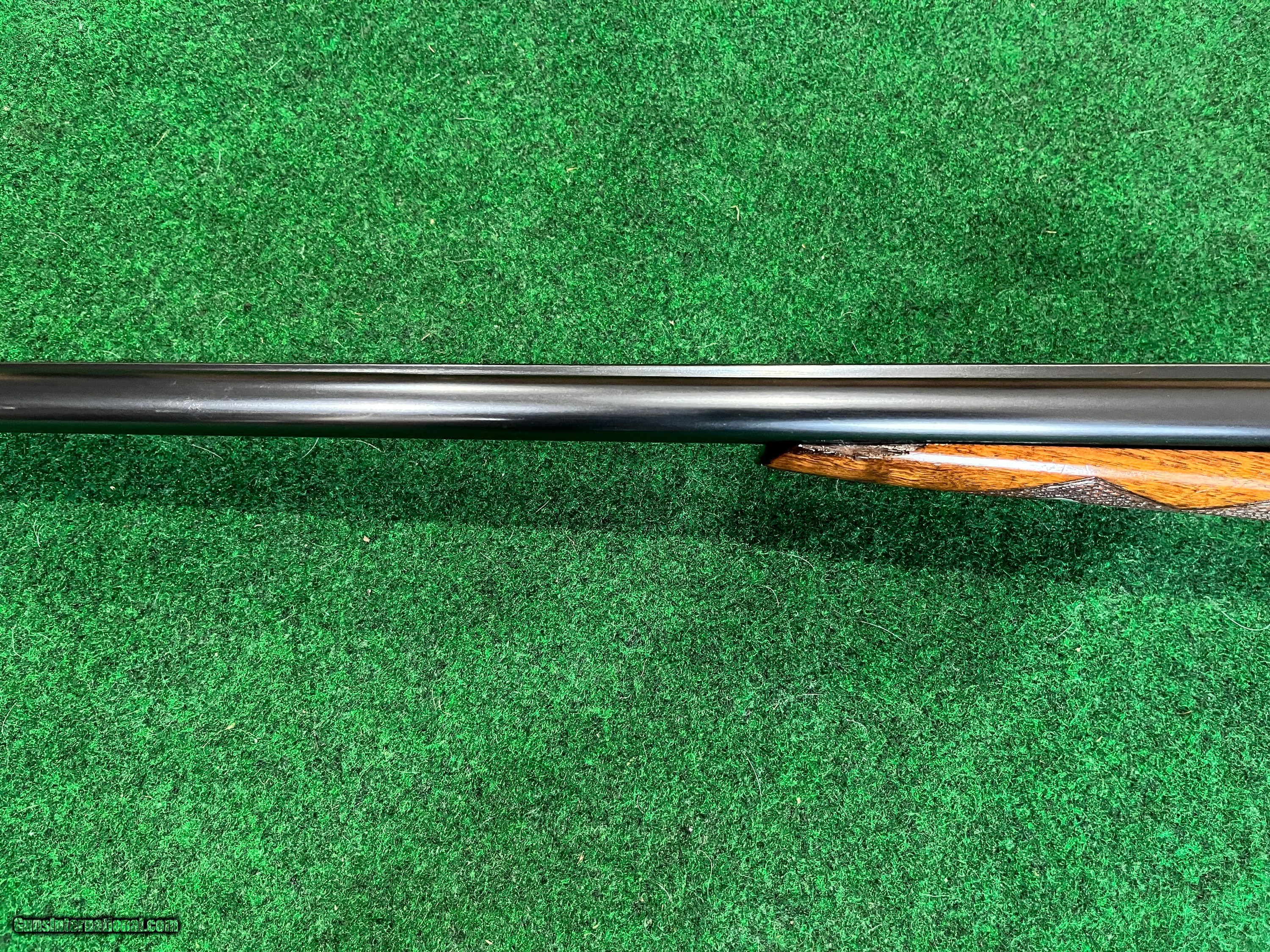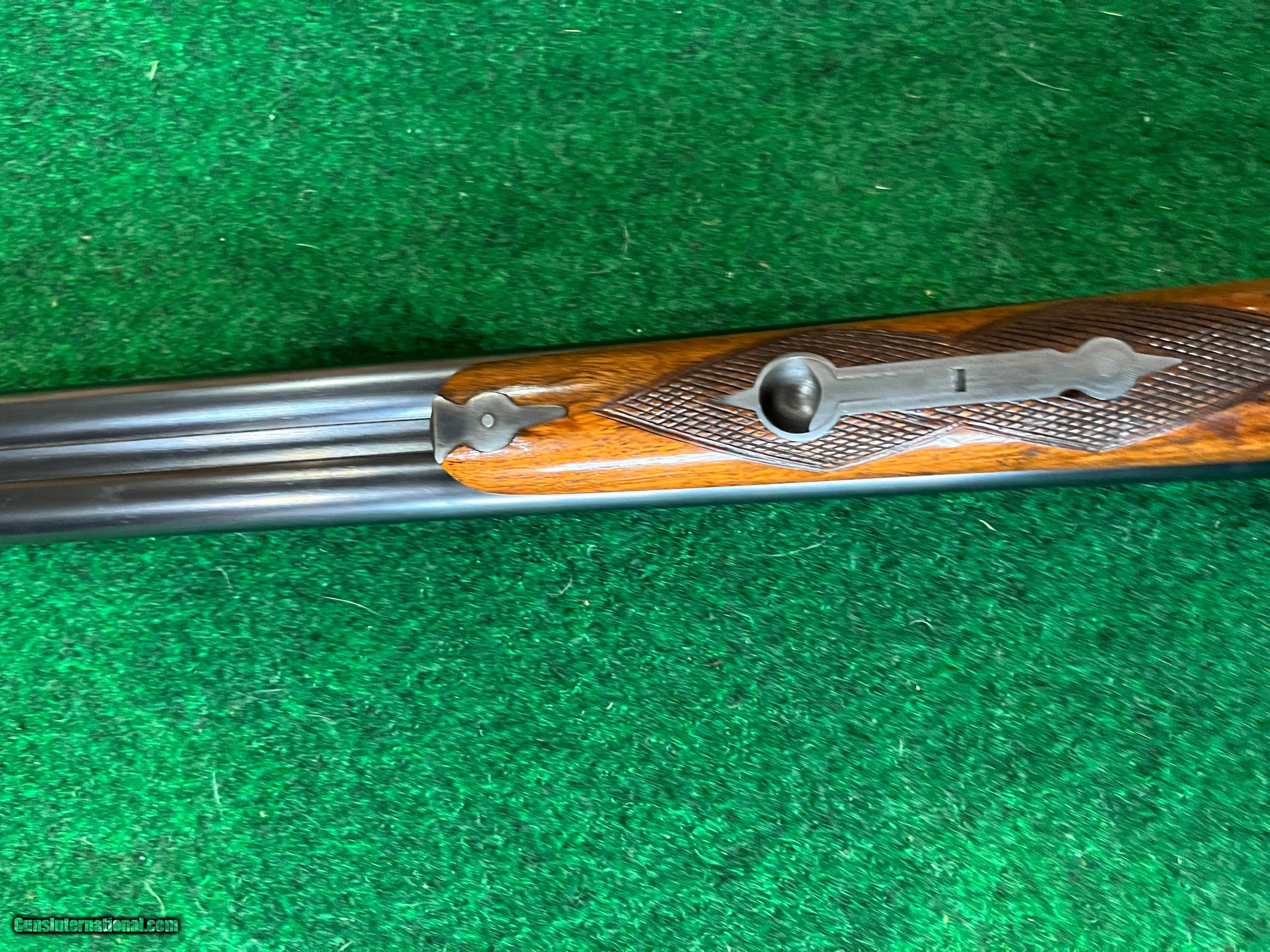 Description: This gun has a single trigger. Top lever in center. Gun is in excellent mechanical condition. It has a chip on the forend at the at the front left side. 28" barrels are choked .007 and .014. Gun weighs 6 lb 2 oz. Stock dims. are 1 1/2 X 2 3/8 X 13 3/8 to single trigger. 1/4" cast off. Excellent shootable dimensions. SOLD |