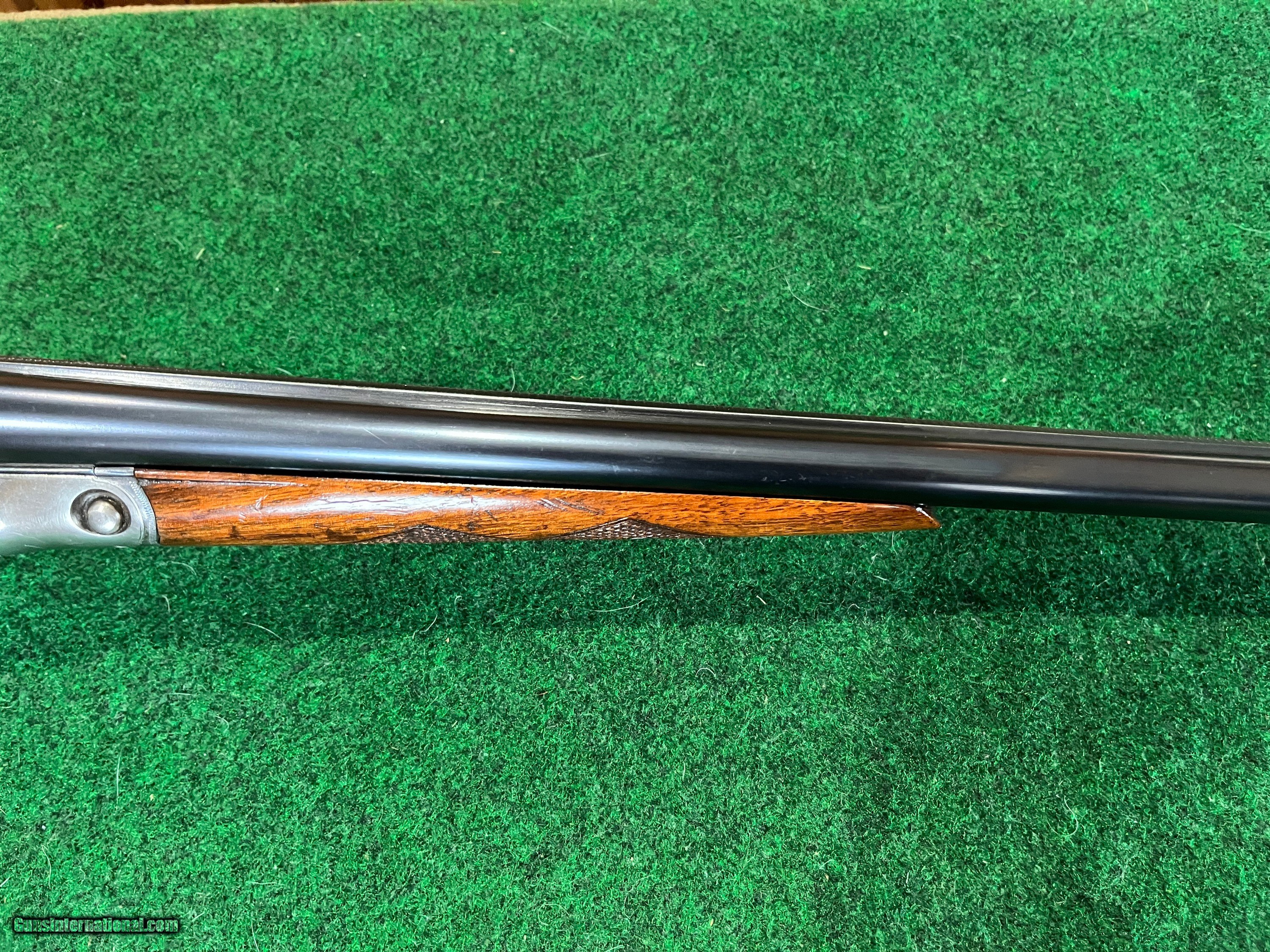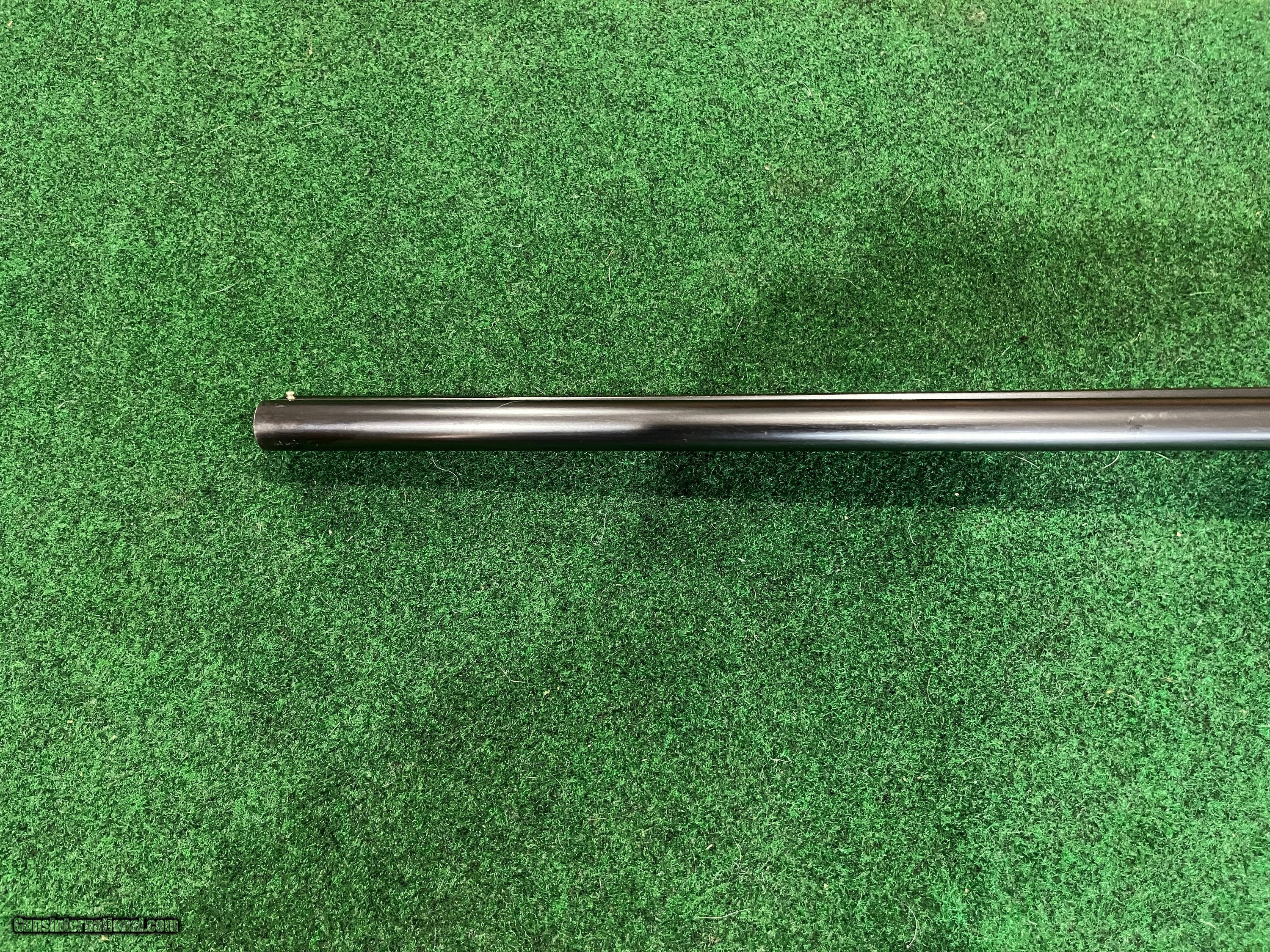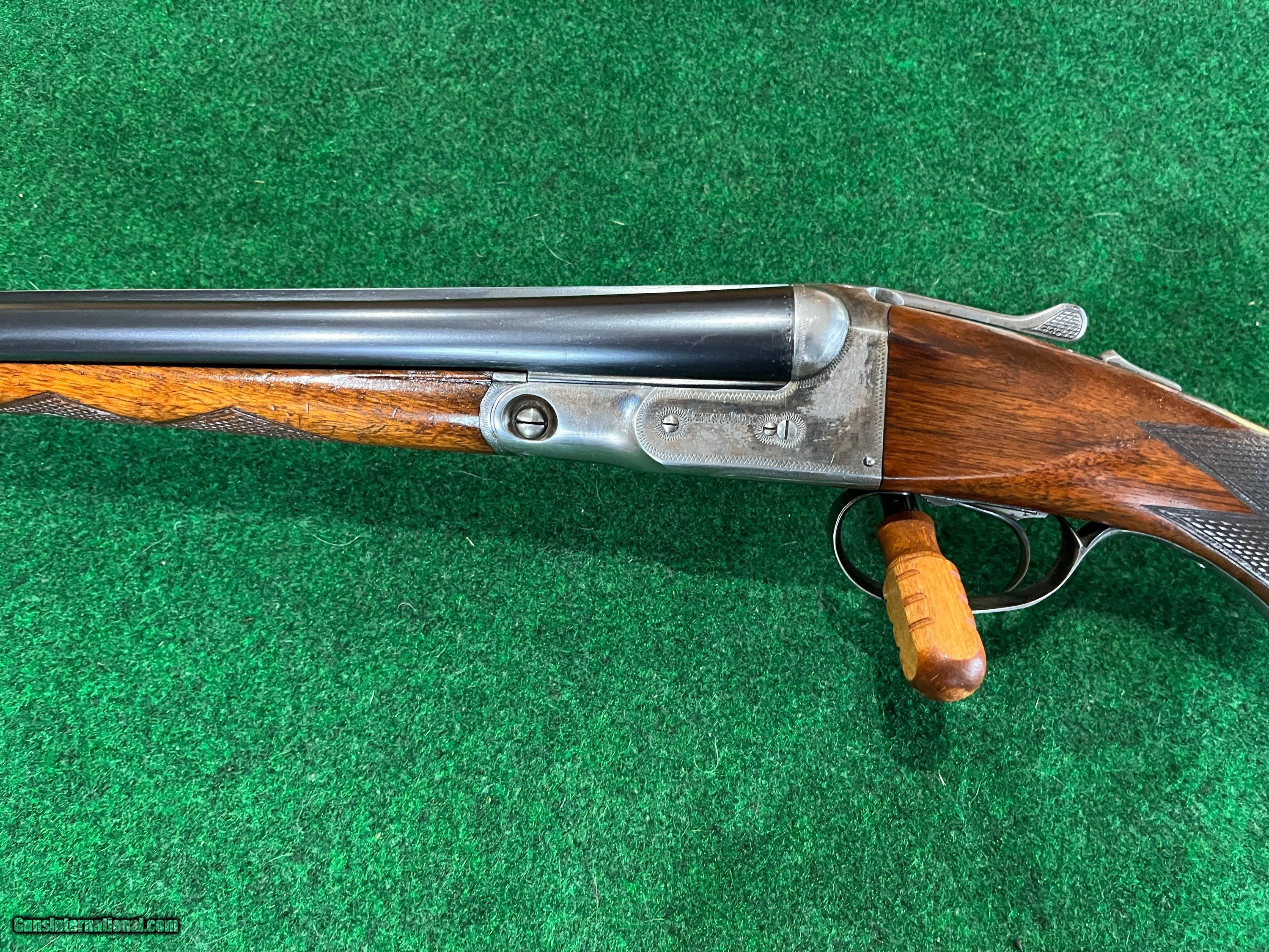 Description: This gun has a single trigger. Top lever in center. Gun is in excellent mechanical condition. It has a chip on the forend at the at the front left side. 28" barrels are choked .007 and .014. Gun weighs 6 lb 2 oz. Stock dims. are 1 1/2 X 2 3/8 X 13 3/8 to single trigger. 1/4" cast off. Excellent shootable dimensions. SOLD |
