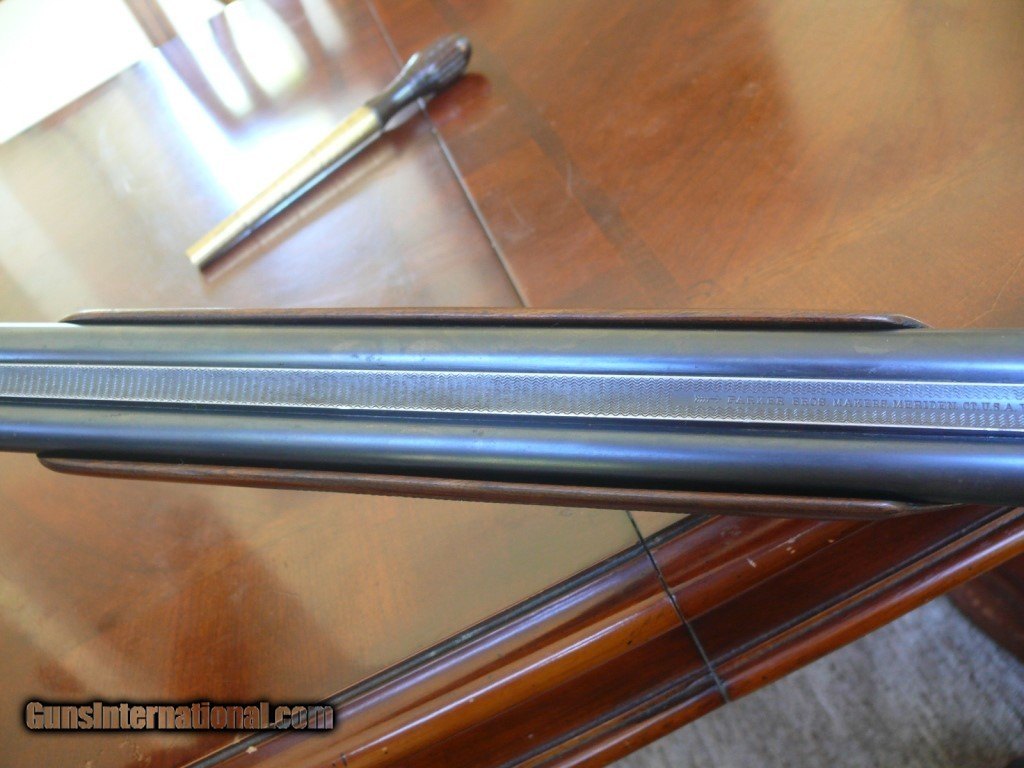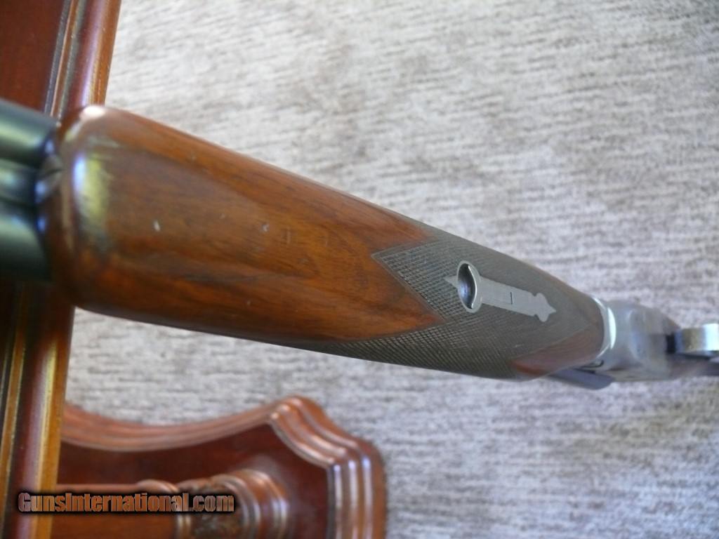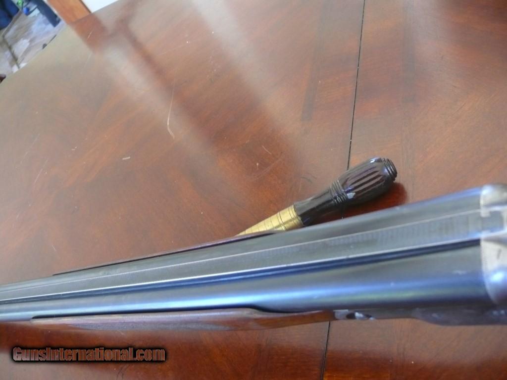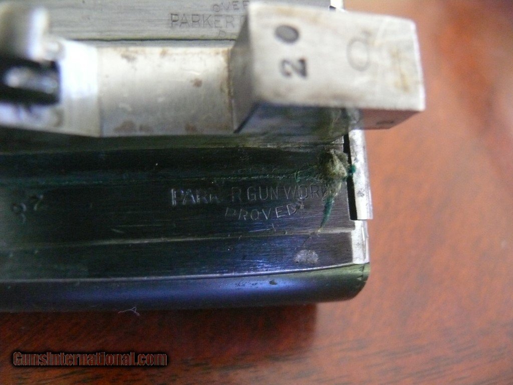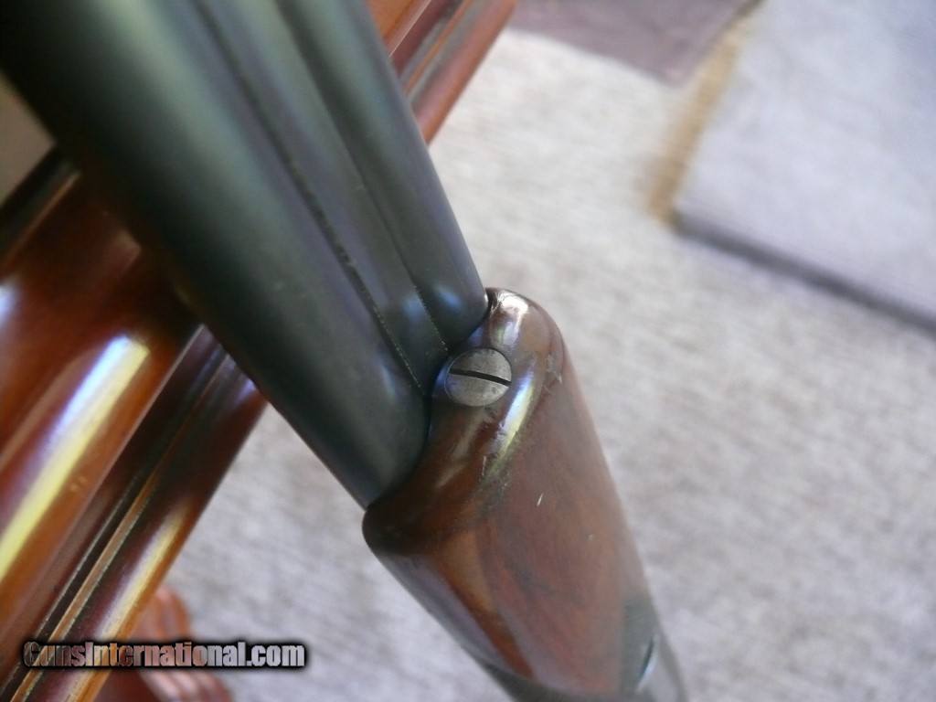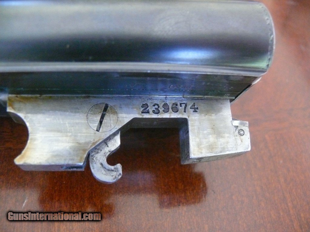 Description: Nice, (and scarce too), original condition Parker VHE 20 ga on an"0" frame with 30" barrels and ejectors ; It is choked f/f and features a factory beavertail. SN is 239674. It has an old "No Shock" pad,and with a LOP of 13.5" to the end of the pad. It is tight on face with nice shiny bores and very very minor scaling spot on the top of the right tube. Faded case colors with about 50% still remaining. "Parker" is engraved on the bottom of the action. It has great case color in the protected areas, and it has its proper grip cap. Checkering is very good but it needs some cleaning. No cracks, and the screws are perfect. Has a few handling spots as shown in the photos. It has a single ivory bead. Weighs 6.8 lbs. Must ship to an FFL, will ship via FEDEX and credit cards have to add the 3% service fee. SOLD |