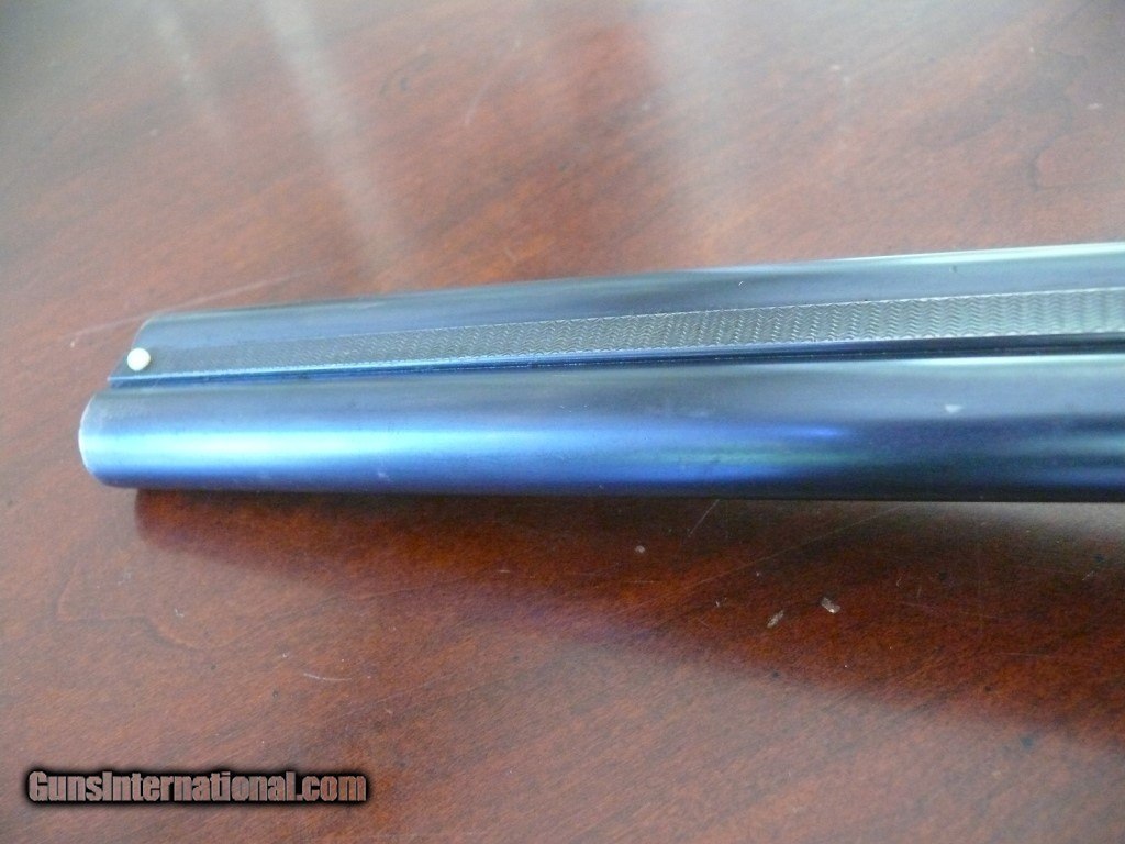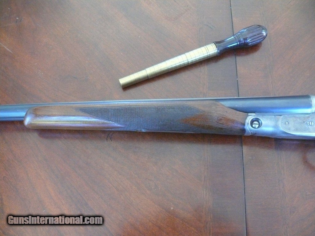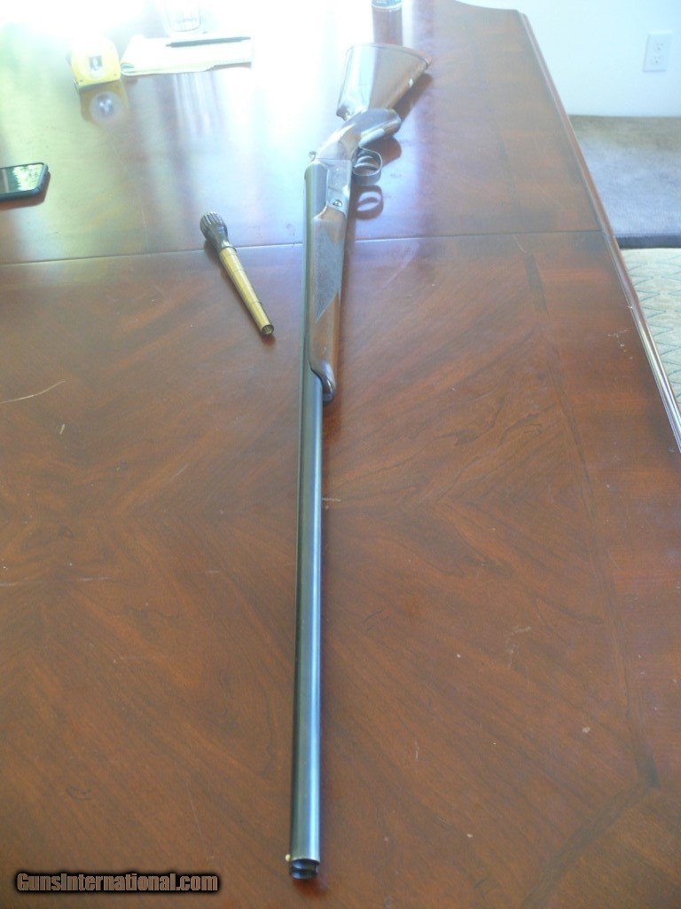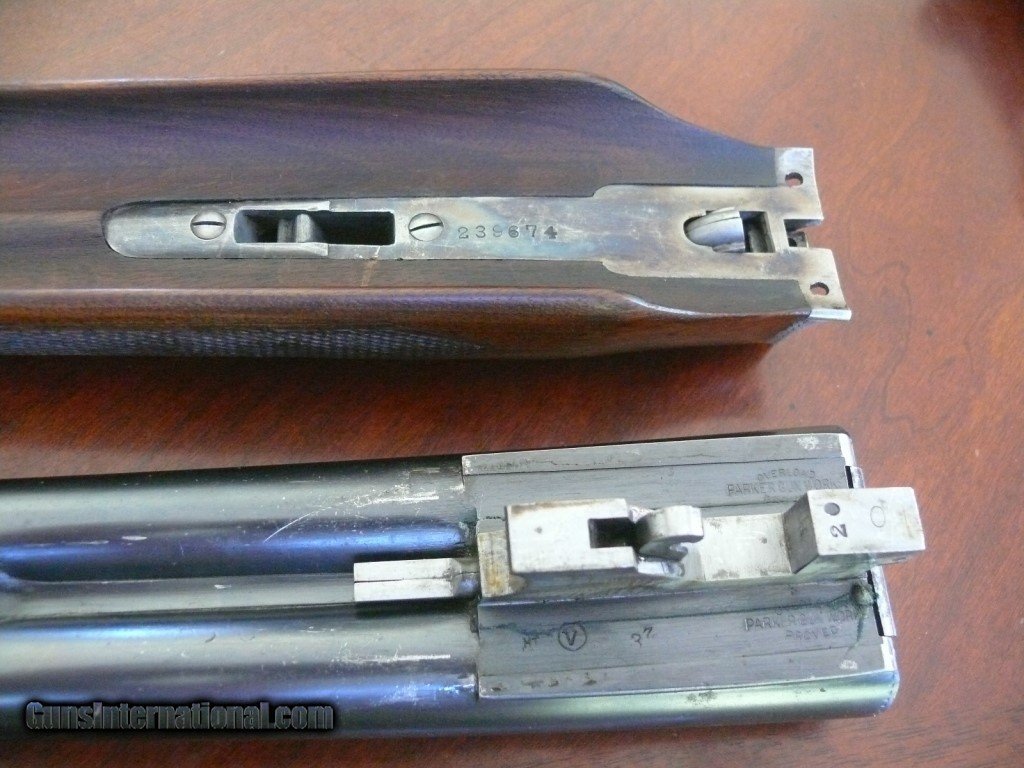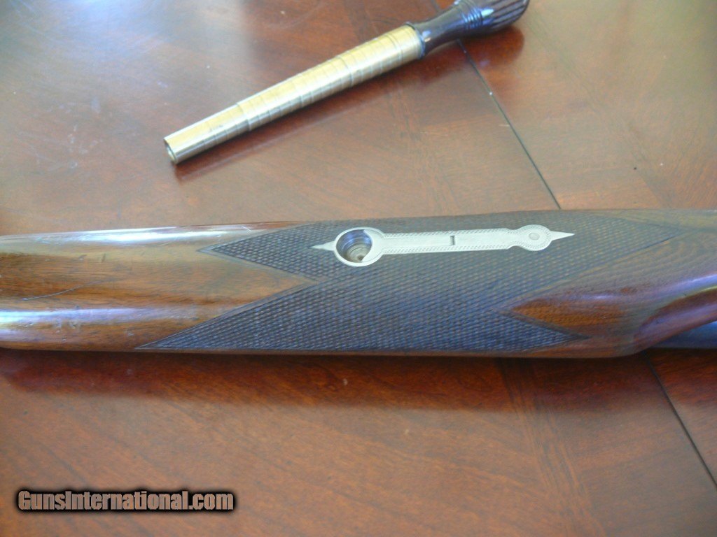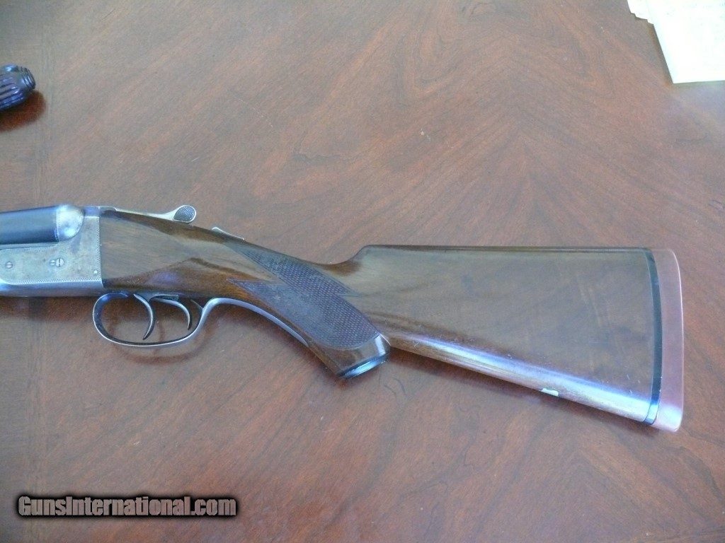Description: Nice, (and scarce too), original condition Parker VHE 20 ga on an"0" frame with 30" barrels and ejectors ; It is choked f/f and features a factory beavertail. SN is 239674. It has an old "No Shock" pad,and with a LOP of 13.5" to the end of the pad. It is tight on face with nice shiny bores and very very minor scaling spot on the top of the right tube. Faded case colors with about 50% still remaining. "Parker" is engraved on the bottom of the action. It has great case color in the protected areas, and it has its proper grip cap. Checkering is very good but it needs some cleaning. No cracks, and the screws are perfect. Has a few handling spots as shown in the photos. It has a single ivory bead. Weighs 6.8 lbs. Must ship to an FFL, will ship via FEDEX and credit cards have to add the 3% service fee. SOLD |