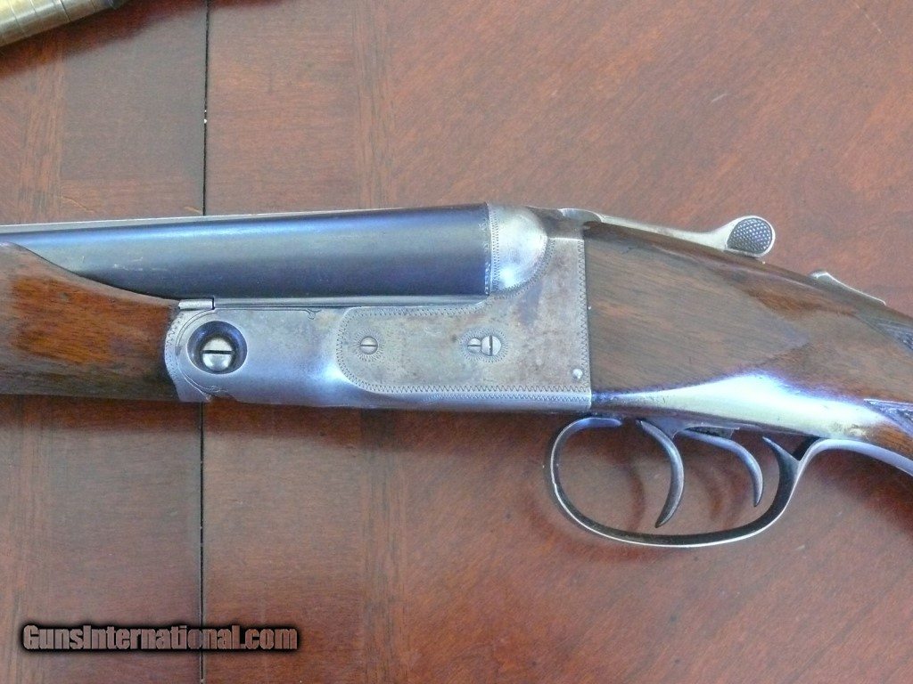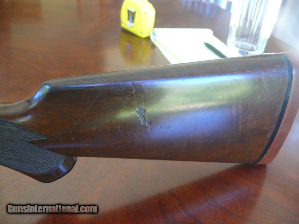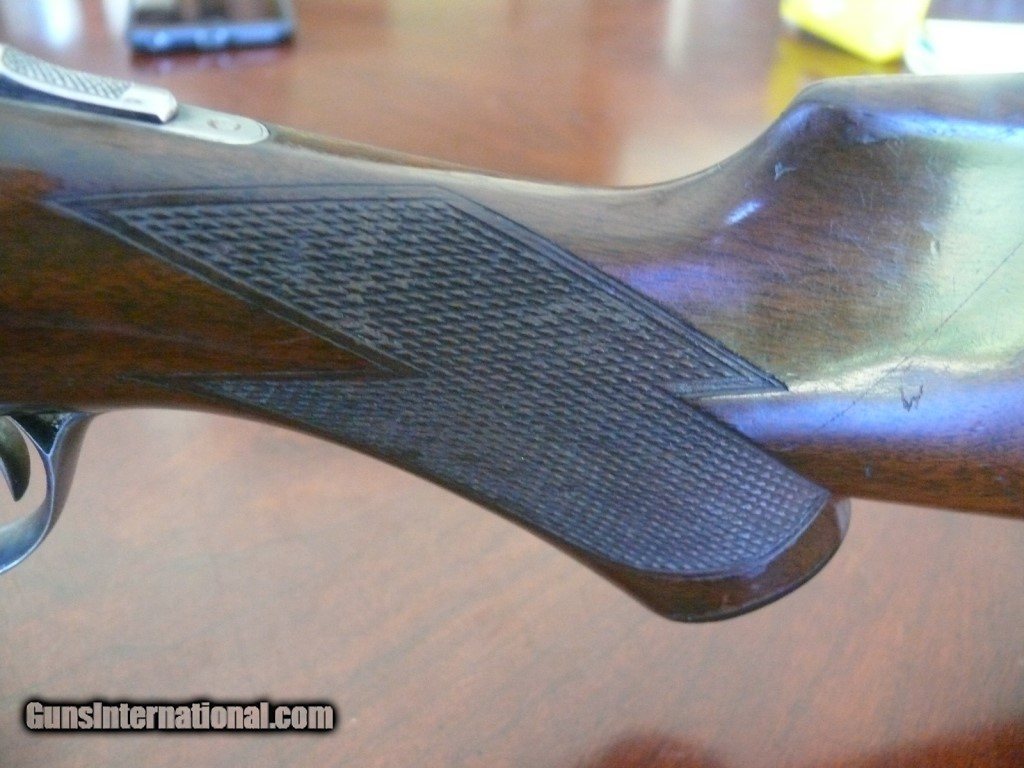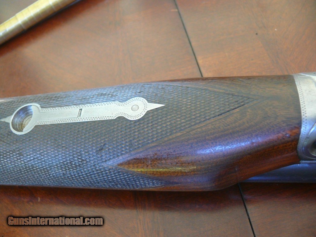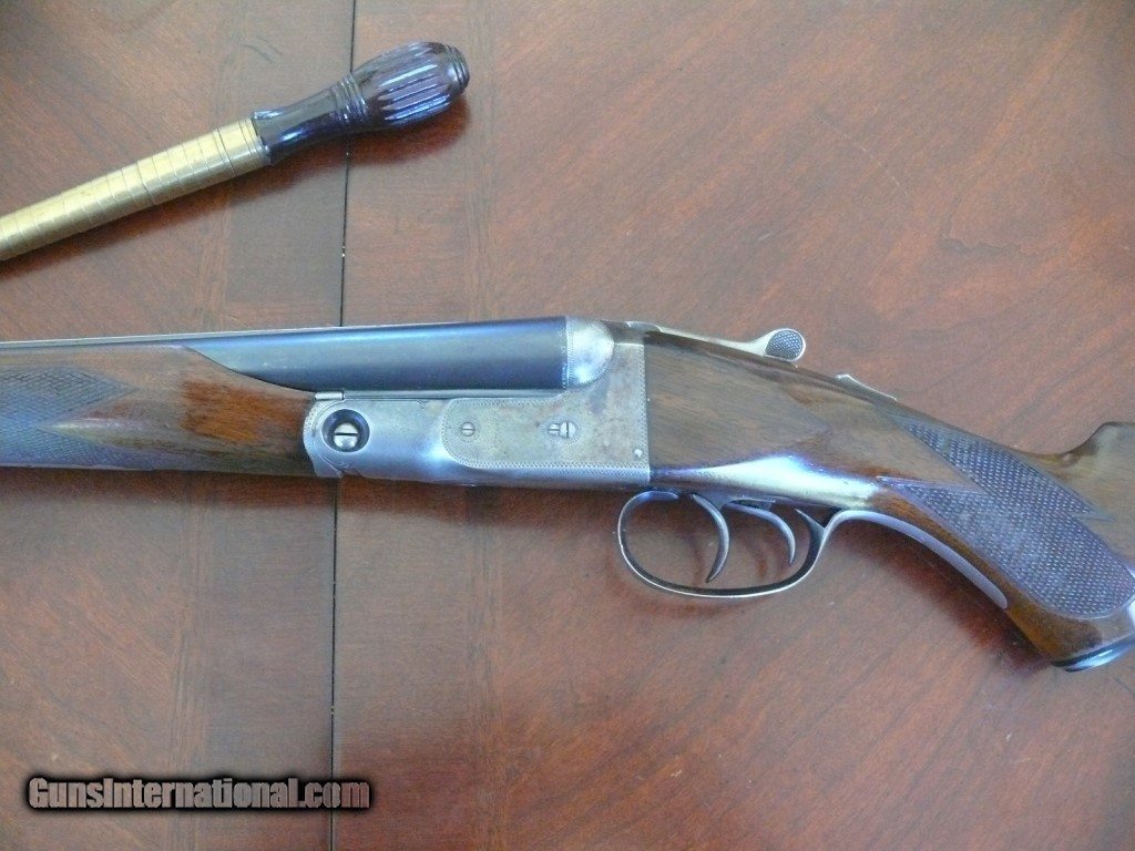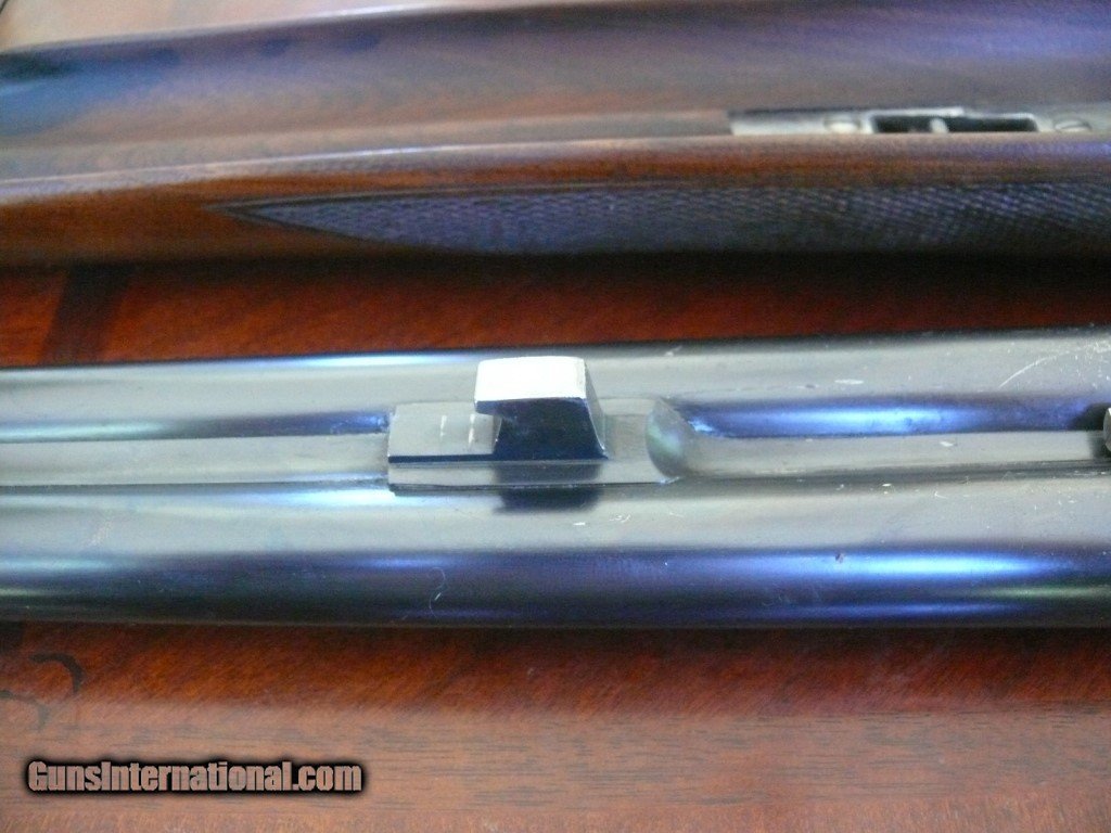 Description: Nice, (and scarce too), original condition Parker VHE 20 ga on an"0" frame with 30" barrels and ejectors ; It is choked f/f and features a factory beavertail. SN is 239674. It has an old "No Shock" pad,and with a LOP of 13.5" to the end of the pad. It is tight on face with nice shiny bores and very very minor scaling spot on the top of the right tube. Faded case colors with about 50% still remaining. "Parker" is engraved on the bottom of the action. It has great case color in the protected areas, and it has its proper grip cap. Checkering is very good but it needs some cleaning. No cracks, and the screws are perfect. Has a few handling spots as shown in the photos. It has a single ivory bead. Weighs 6.8 lbs. Must ship to an FFL, will ship via FEDEX and credit cards have to add the 3% service fee. SOLD |