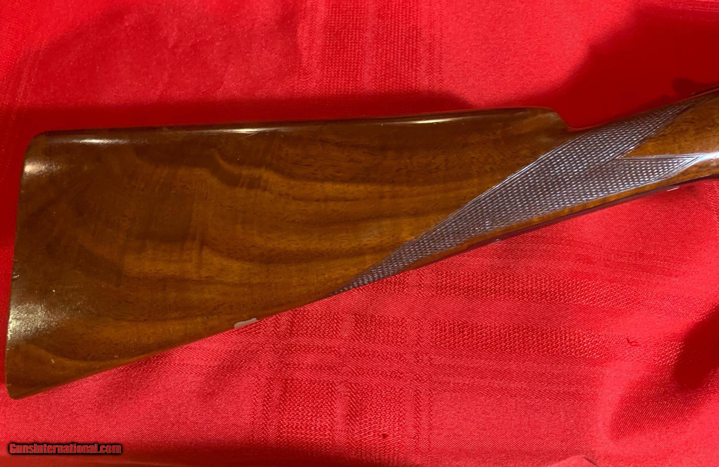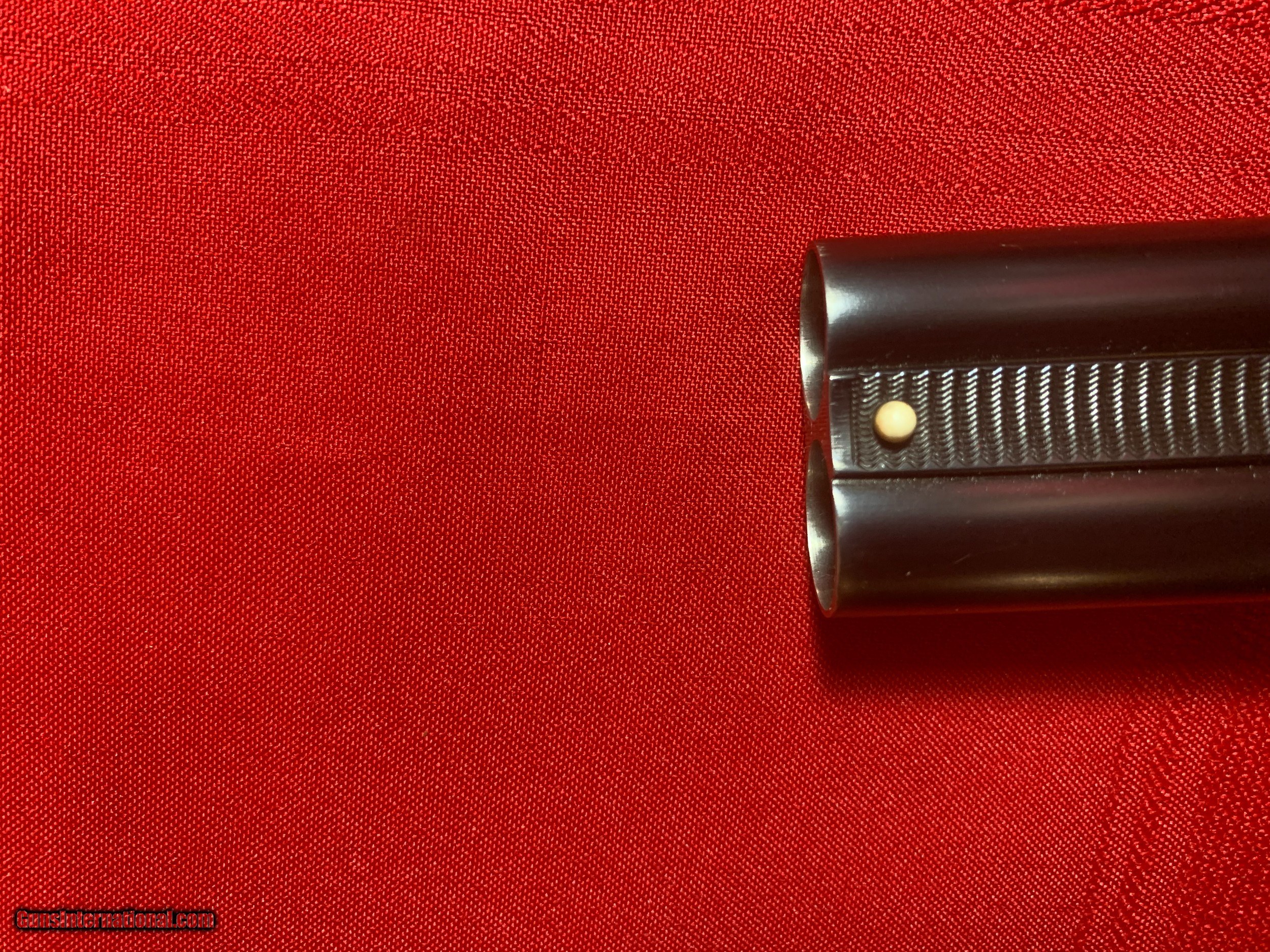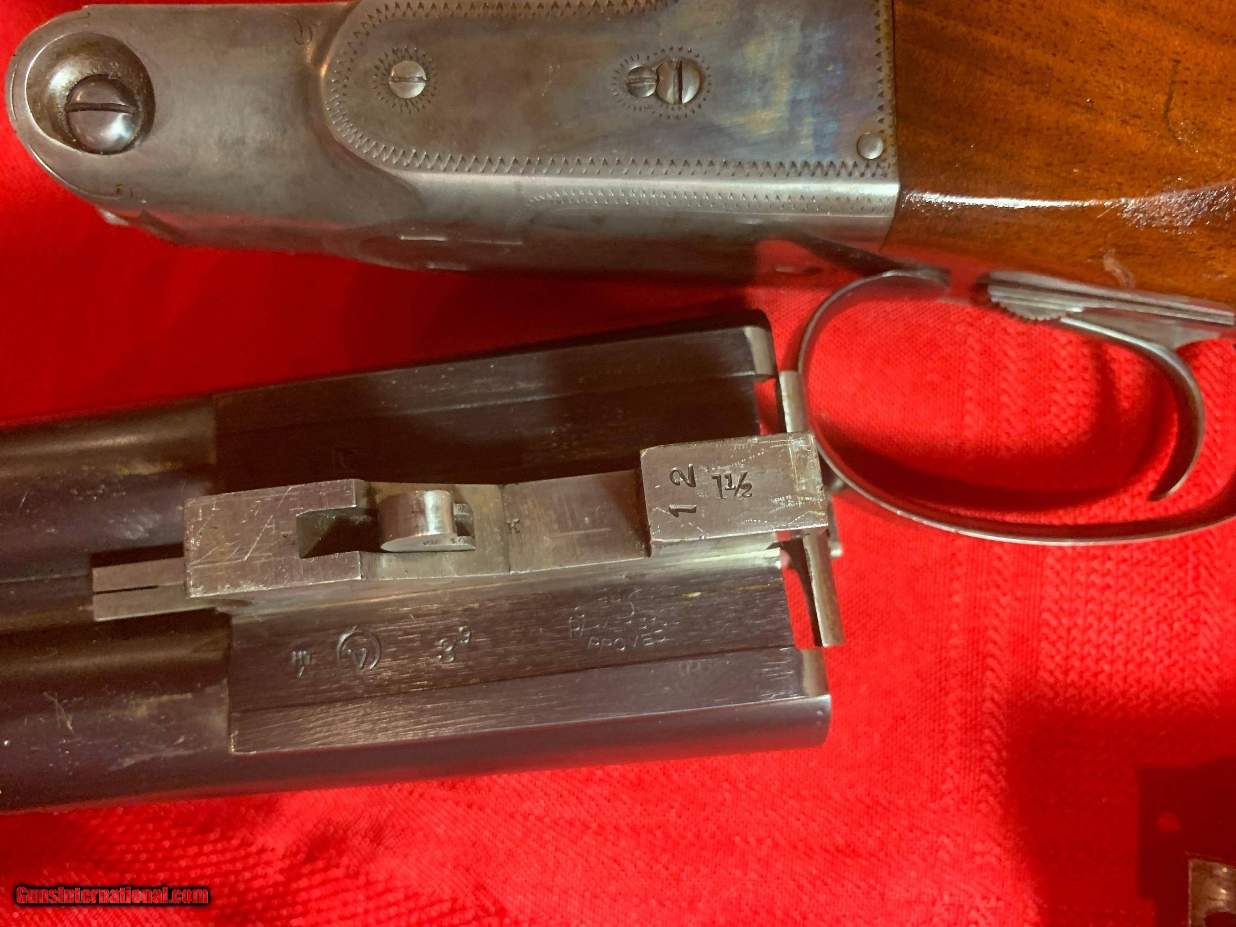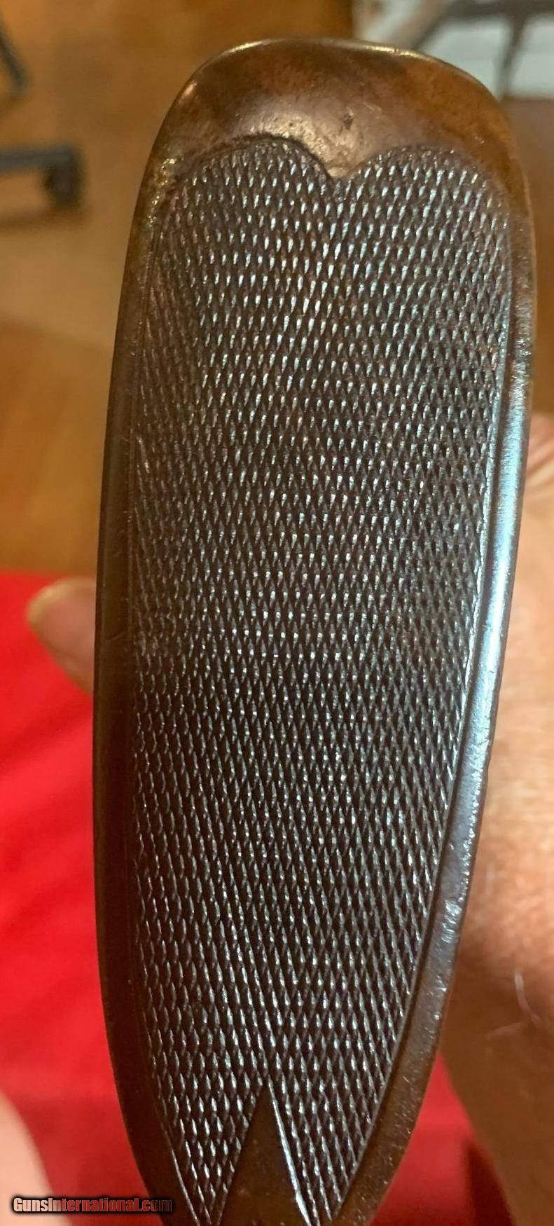 Description: First time I've seen this configuration. English straight grip stock, Checkered butt, single selective trigger, twin beads, ejectors, 26" barrels ckocked .005/.010. Stock measures 2 X 2 3/4 X 14. weight 7 lbs. 15 oz. Nicely figured wood in excellent shape. Much case color remains. Barrel blue is all there. Much of the nitre blue emains in trigger guard. All in all an unusual gun in original great condition. SOLD Curio/Relic: Yes Shotgun Gauge: 12 Gauge |