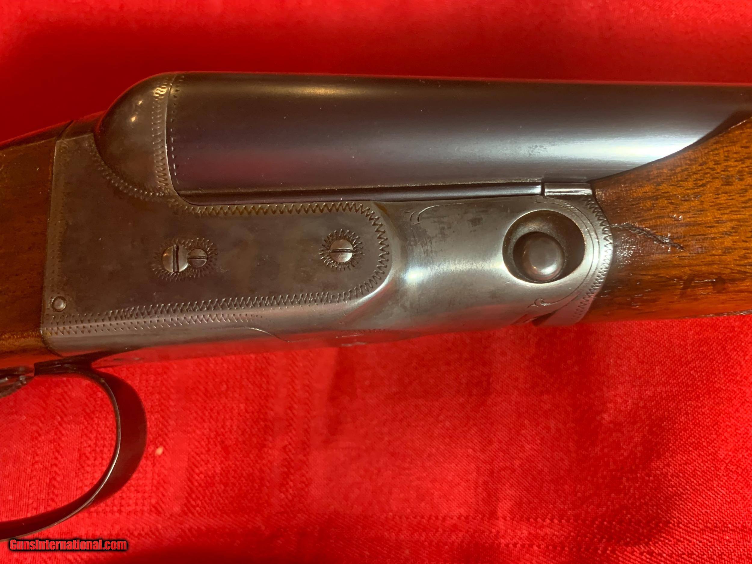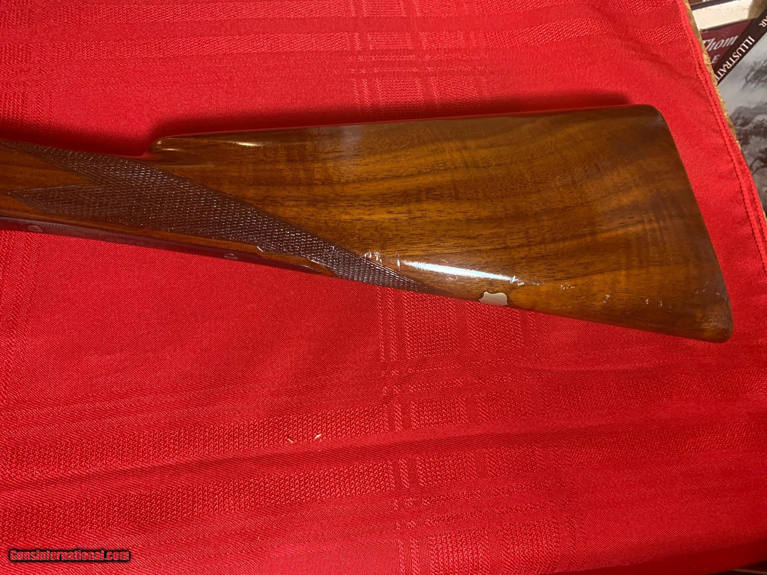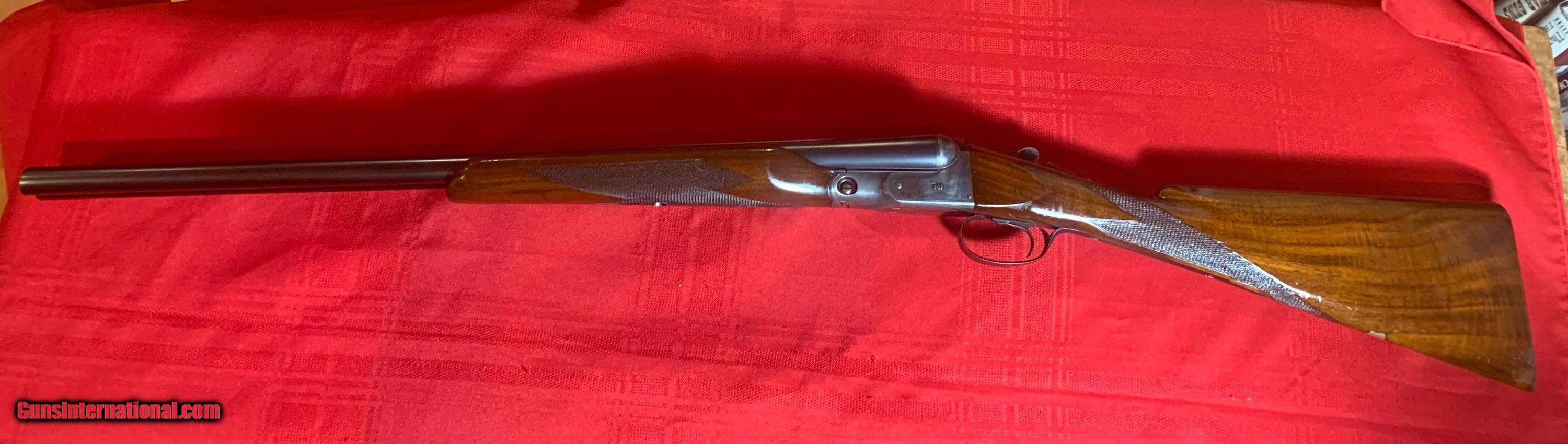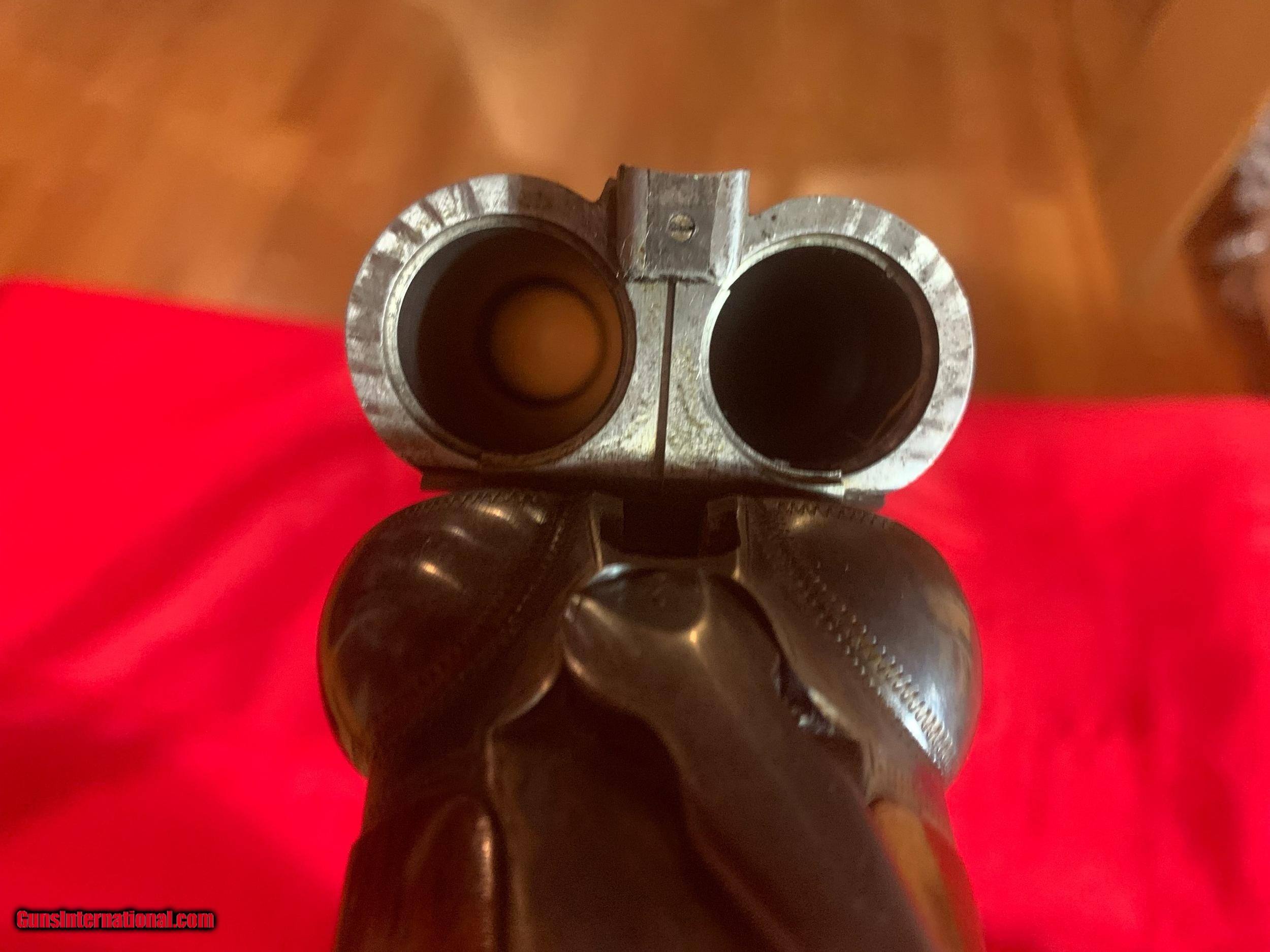 Description: First time I've seen this configuration. English straight grip stock, Checkered butt, single selective trigger, twin beads, ejectors, 26" barrels ckocked .005/.010. Stock measures 2 X 2 3/4 X 14. weight 7 lbs. 15 oz. Nicely figured wood in excellent shape. Much case color remains. Barrel blue is all there. Much of the nitre blue emains in trigger guard. All in all an unusual gun in original great condition. SOLD Curio/Relic: Yes Shotgun Gauge: 12 Gauge |