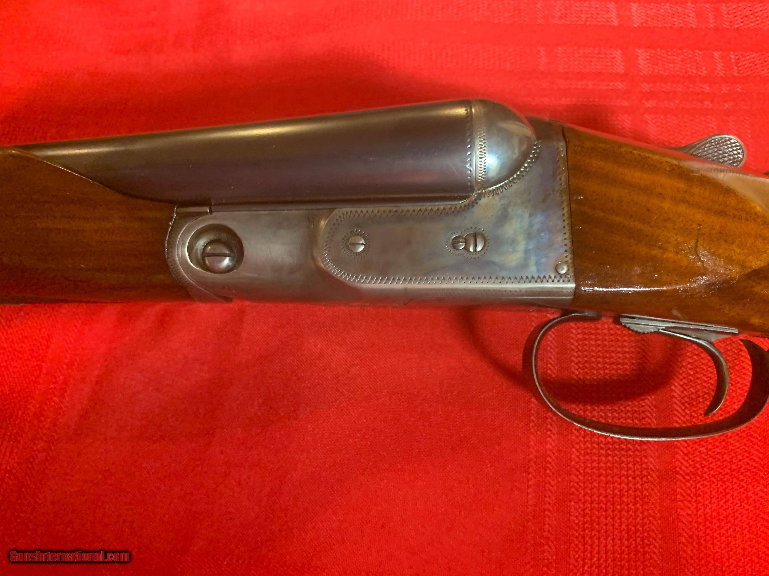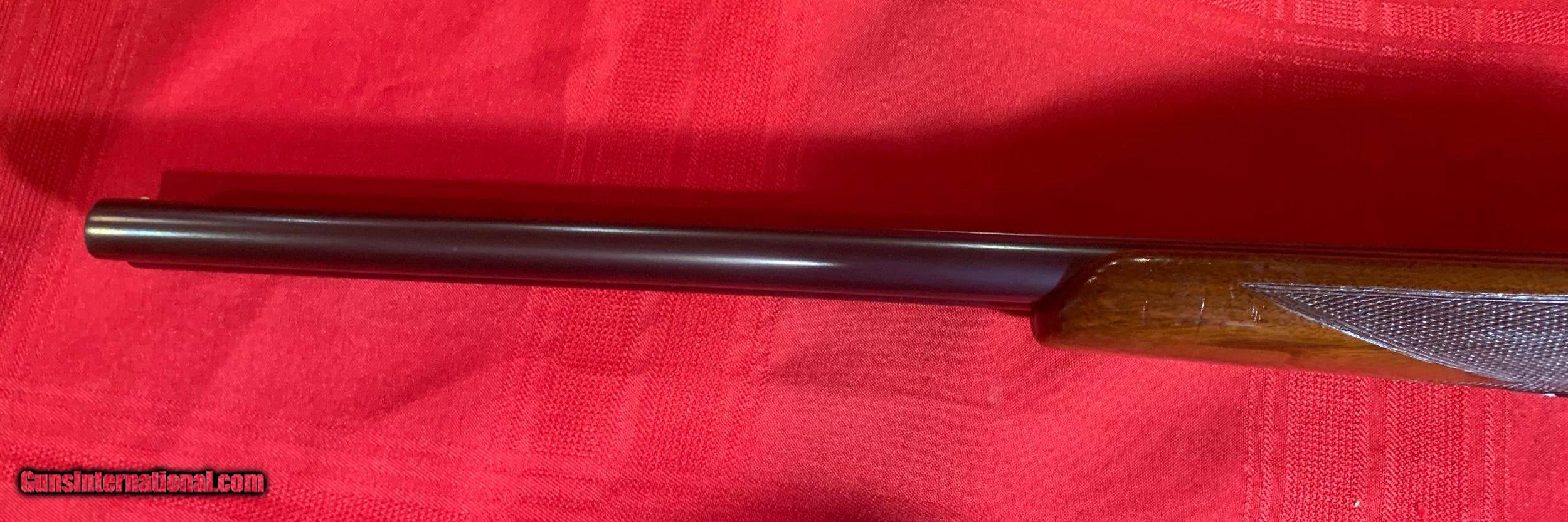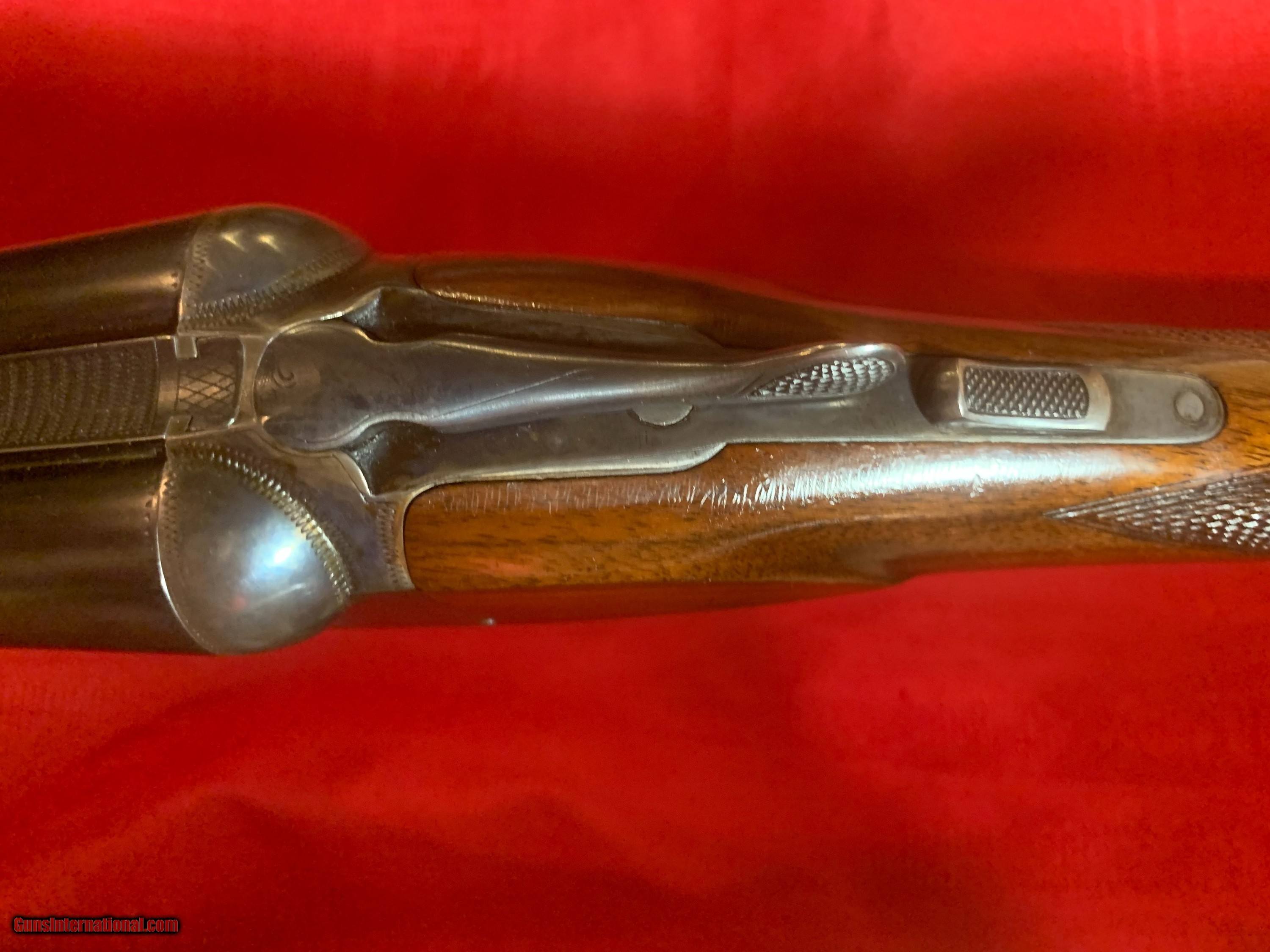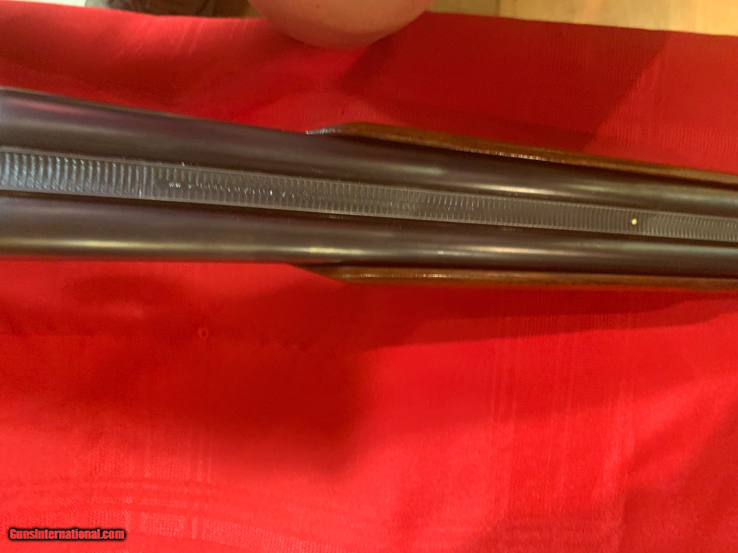 Description: First time I've seen this configuration. English straight grip stock, Checkered butt, single selective trigger, twin beads, ejectors, 26" barrels ckocked .005/.010. Stock measures 2 X 2 3/4 X 14. weight 7 lbs. 15 oz. Nicely figured wood in excellent shape. Much case color remains. Barrel blue is all there. Much of the nitre blue emains in trigger guard. All in all an unusual gun in original great condition. SOLD Curio/Relic: Yes Shotgun Gauge: 12 Gauge |