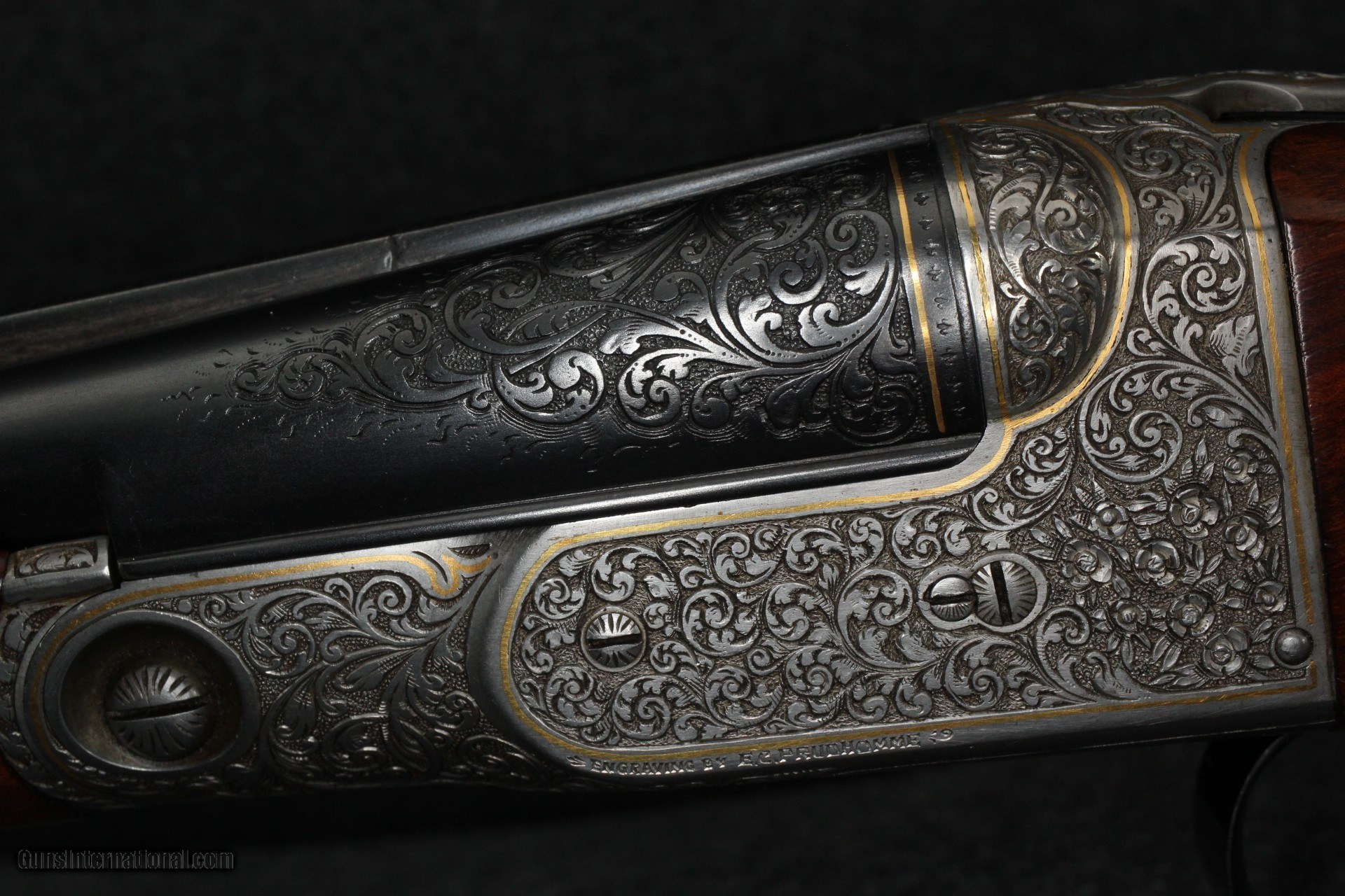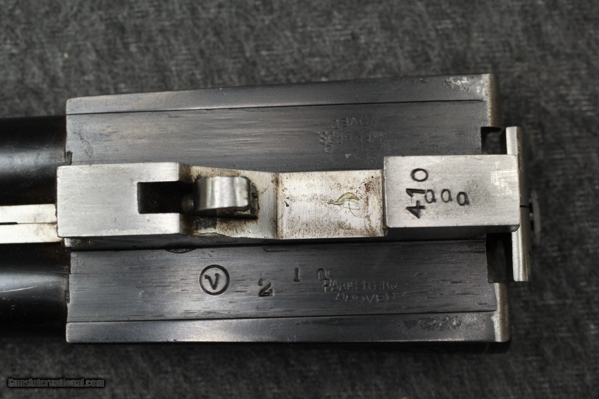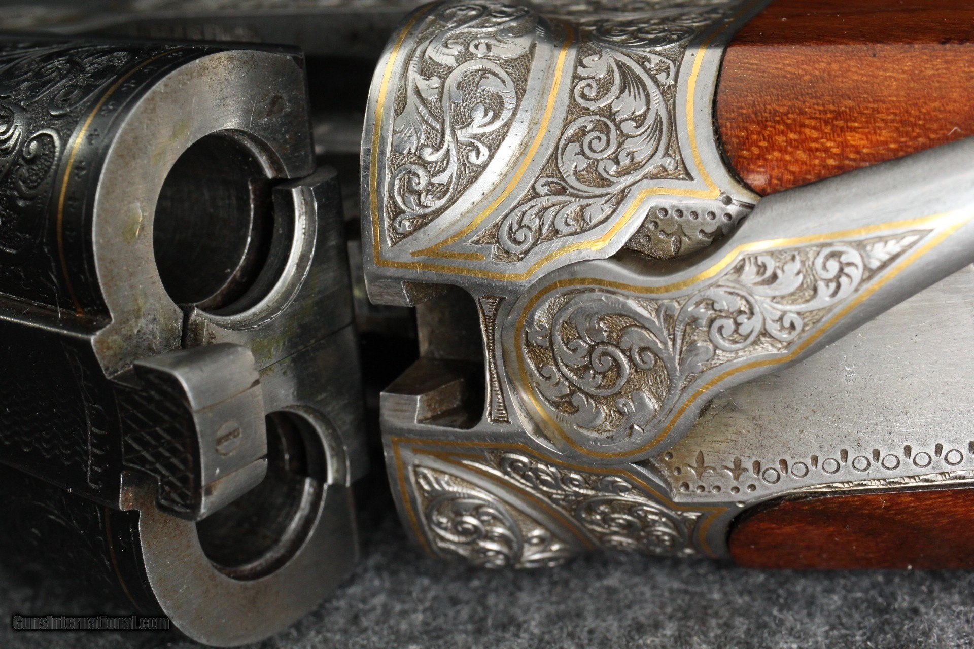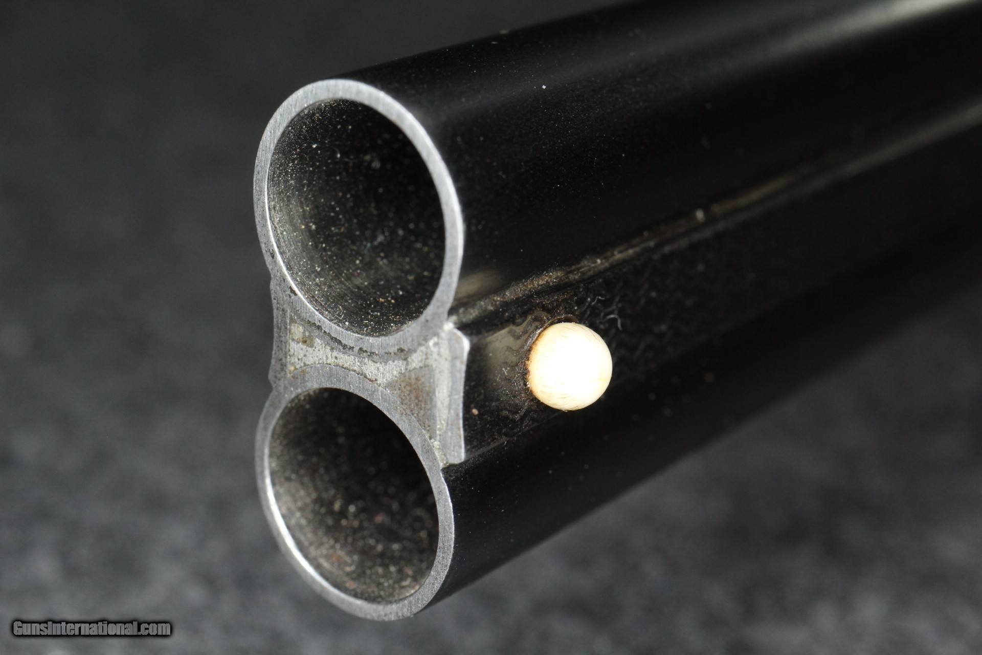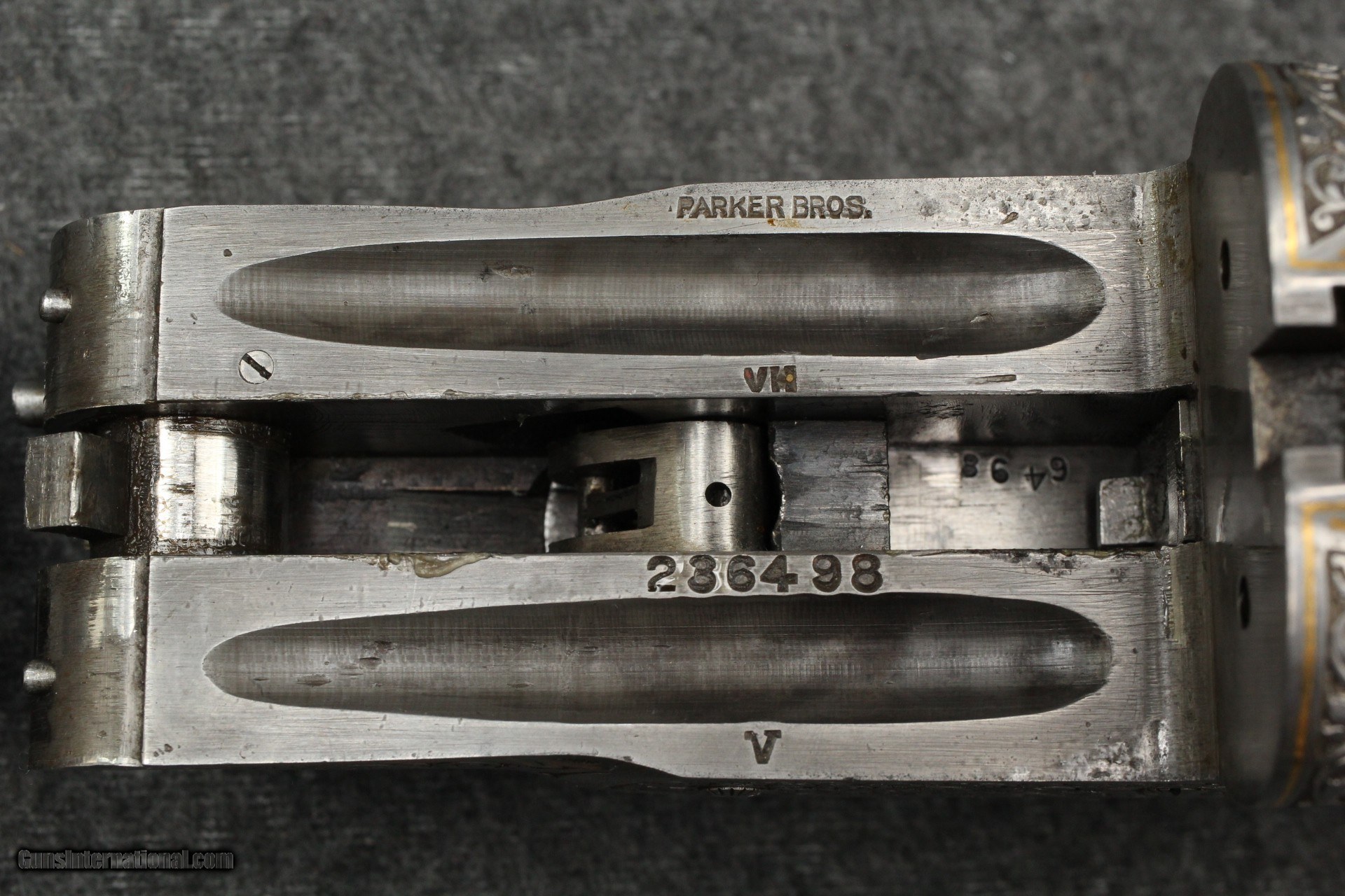 Description: Date of mfg April 6, 1935. 410ga, 3" chambers, serial number 2364XX. 26" barrels, factory single trigger. Choked light full (.399) right barrel, modified (.404) left barrel. 000 frame. Factory spec letter included. Barrels show 97% blue marked with "Parker Bros makers Meriden Ct USA vulcan steel". See photos for watertable markings. Engraving pattern over chambers to wedding band gold at breech. Ivory fore and mid bead. Bores excellent. Action shows high percentage medium rose and scroll by master engraver EC Prudhomme, with gold boarders. Blue trigger guard bow retains 95% original blue with 40 % open scroll engraving. Selectable factory single trigger functions correctly. Mechanically excellent overall. Well figured beavertail forend shows multi-point checkering pattern, Deely & Edge catch in French grey shows high percentage open engraving. Nicely figured flame crotch buttstock, matches letter. 14 1/8" LOP to recoil pad. Checkering crisp, overall excellent condition. Please call for shipping and insurance amount. More photos on request. SOLD Curio/Relic: Yes Shotgun Gauge: .410 Gauge |