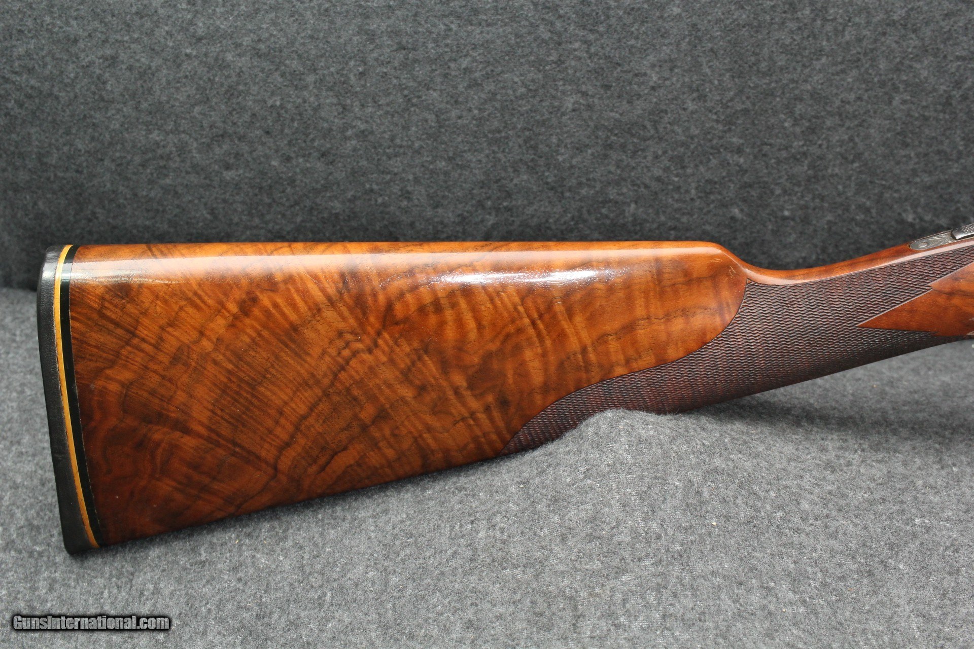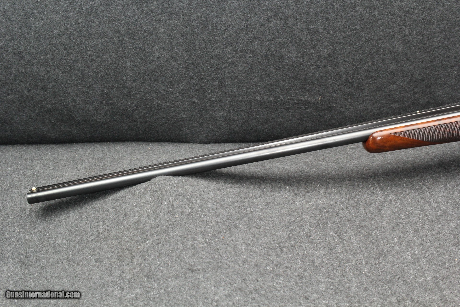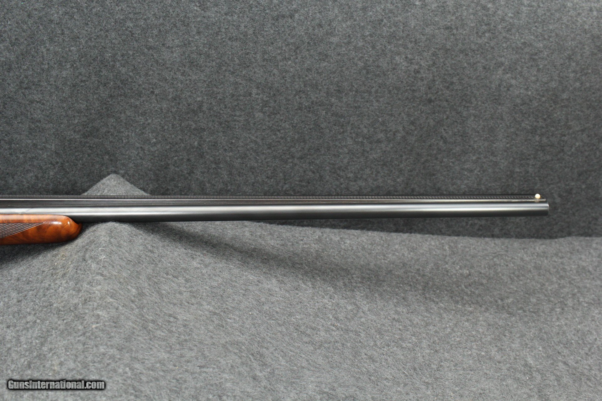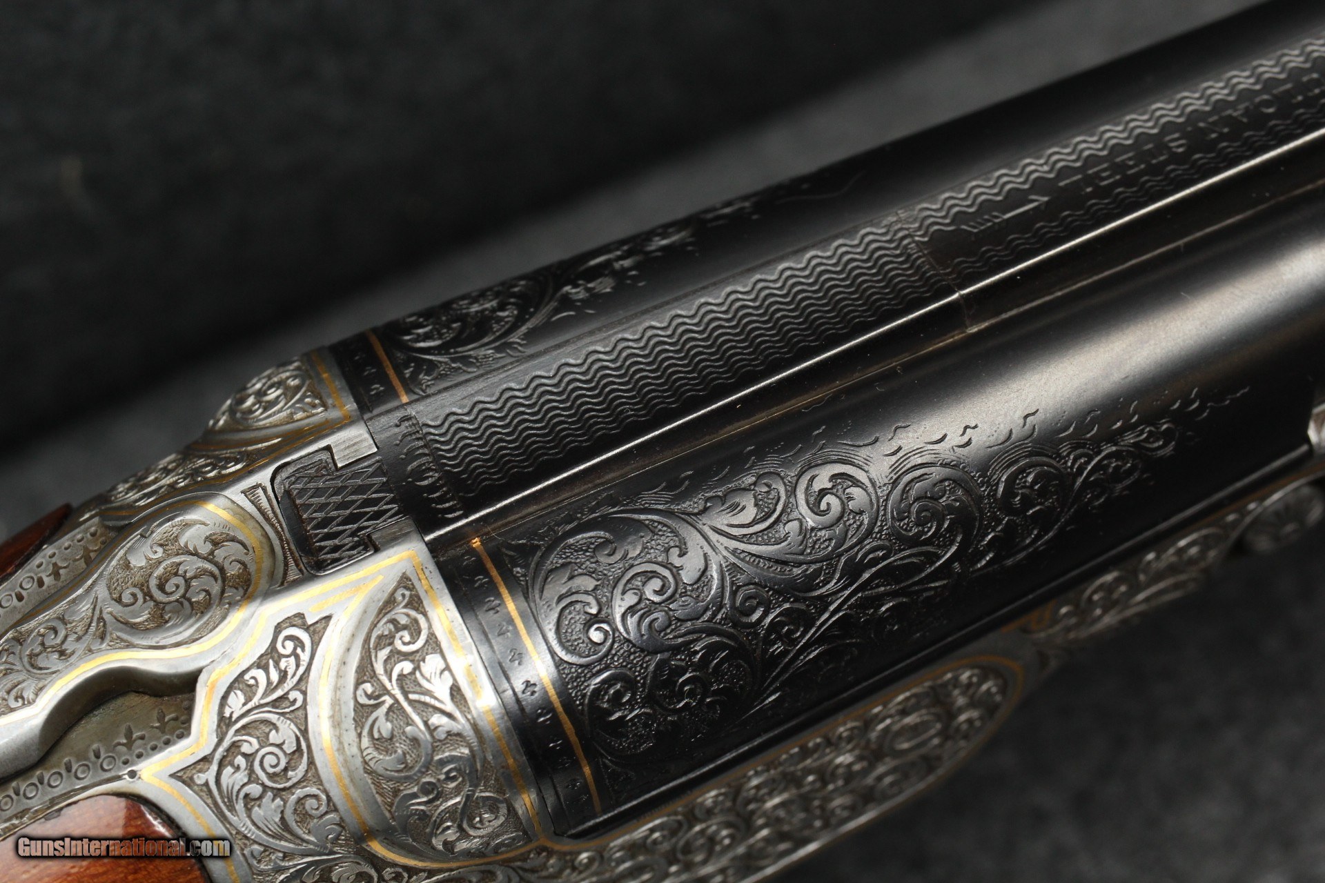 Description: Date of mfg April 6, 1935. 410ga, 3" chambers, serial number 2364XX. 26" barrels, factory single trigger. Choked light full (.399) right barrel, modified (.404) left barrel. 000 frame. Factory spec letter included. Barrels show 97% blue marked with "Parker Bros makers Meriden Ct USA vulcan steel". See photos for watertable markings. Engraving pattern over chambers to wedding band gold at breech. Ivory fore and mid bead. Bores excellent. Action shows high percentage medium rose and scroll by master engraver EC Prudhomme, with gold boarders. Blue trigger guard bow retains 95% original blue with 40 % open scroll engraving. Selectable factory single trigger functions correctly. Mechanically excellent overall. Well figured beavertail forend shows multi-point checkering pattern, Deely & Edge catch in French grey shows high percentage open engraving. Nicely figured flame crotch buttstock, matches letter. 14 1/8" LOP to recoil pad. Checkering crisp, overall excellent condition. Please call for shipping and insurance amount. More photos on request. SOLD Curio/Relic: Yes Shotgun Gauge: .410 Gauge |