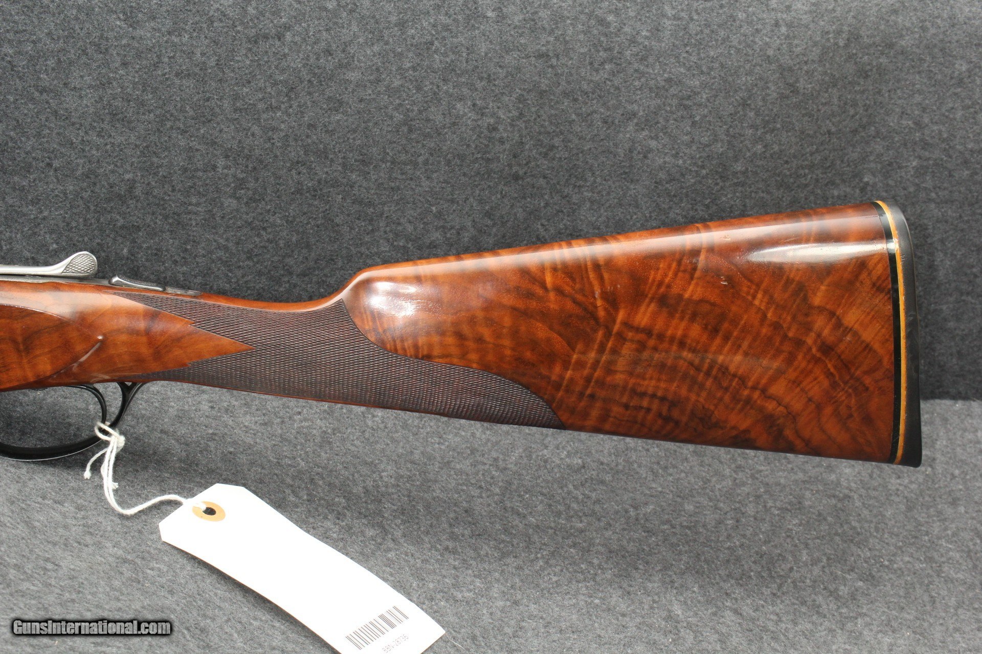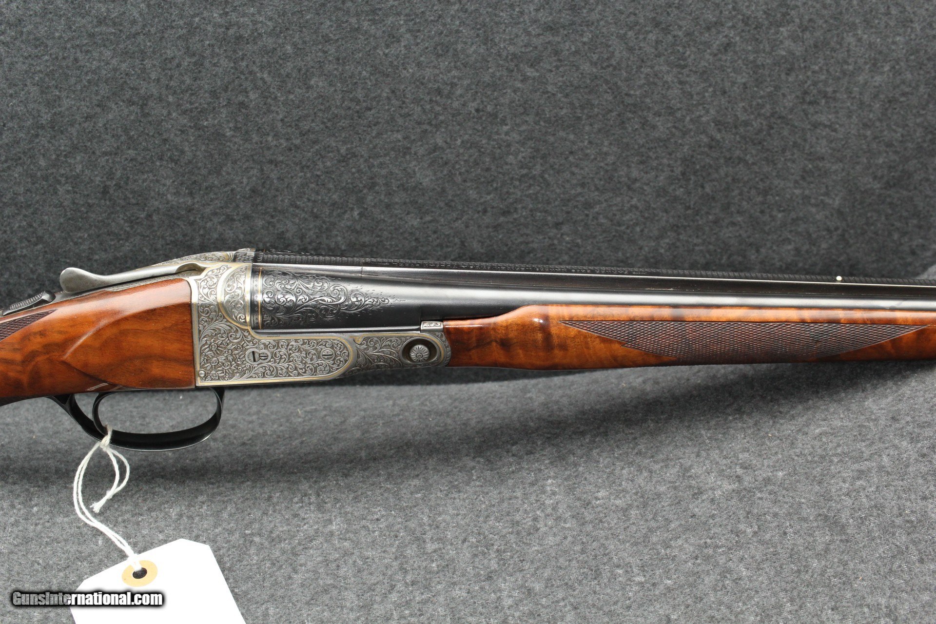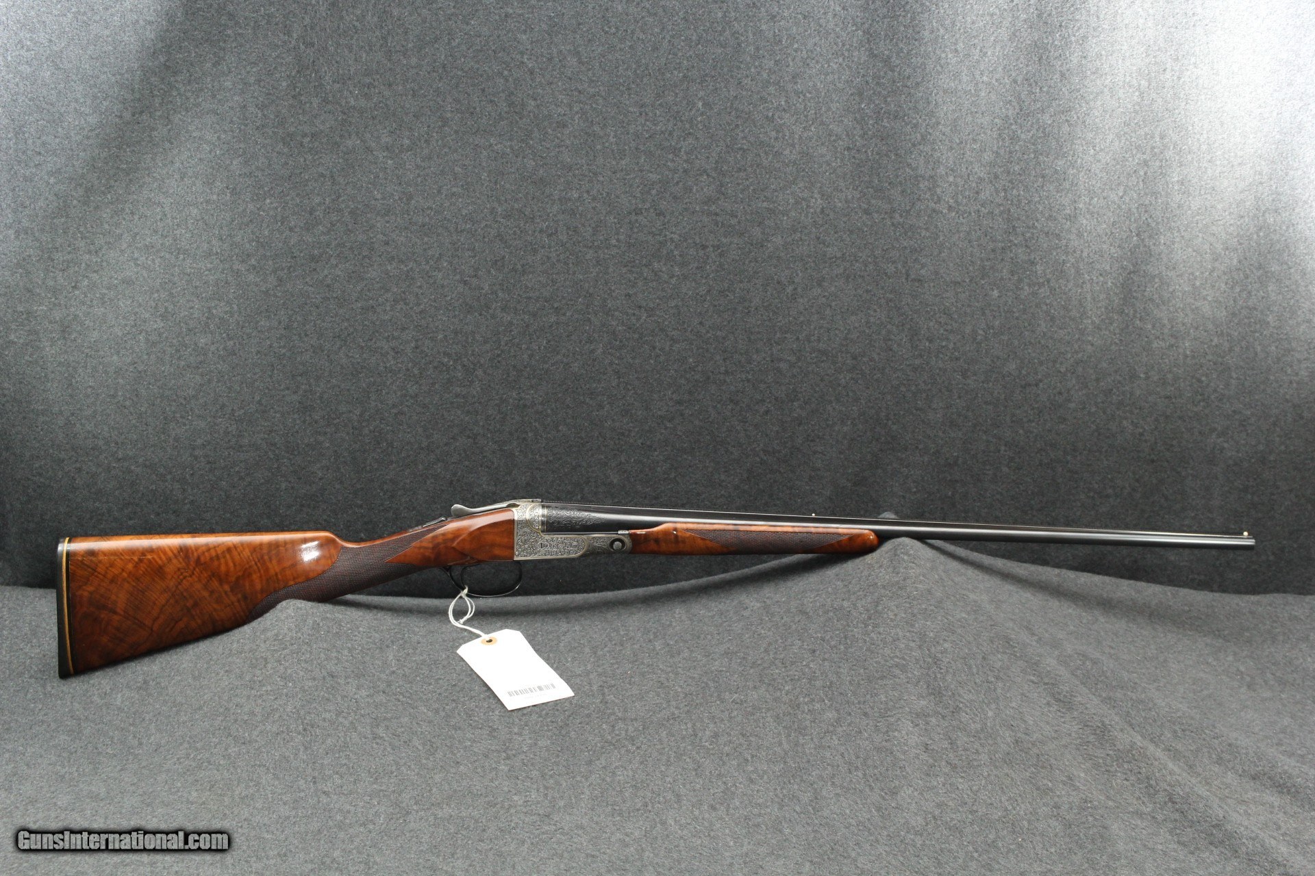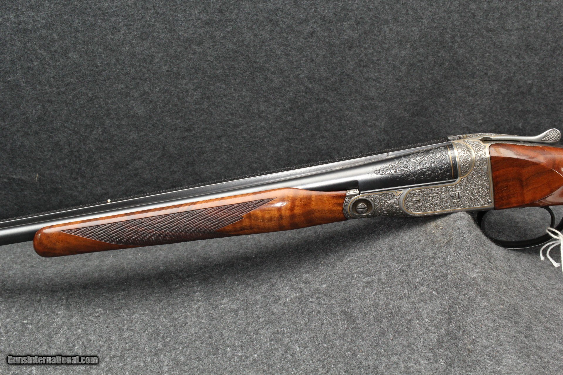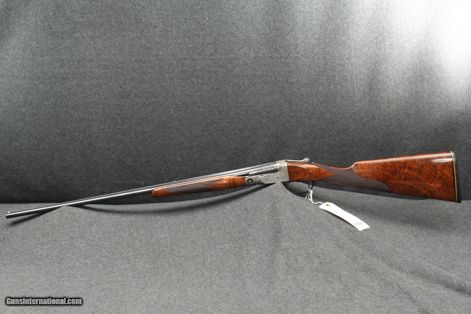 Description: Date of mfg April 6, 1935. 410ga, 3" chambers, serial number 2364XX. 26" barrels, factory single trigger. Choked light full (.399) right barrel, modified (.404) left barrel. 000 frame. Factory spec letter included. Barrels show 97% blue marked with "Parker Bros makers Meriden Ct USA vulcan steel". See photos for watertable markings. Engraving pattern over chambers to wedding band gold at breech. Ivory fore and mid bead. Bores excellent. Action shows high percentage medium rose and scroll by master engraver EC Prudhomme, with gold boarders. Blue trigger guard bow retains 95% original blue with 40 % open scroll engraving. Selectable factory single trigger functions correctly. Mechanically excellent overall. Well figured beavertail forend shows multi-point checkering pattern, Deely & Edge catch in French grey shows high percentage open engraving. Nicely figured flame crotch buttstock, matches letter. 14 1/8" LOP to recoil pad. Checkering crisp, overall excellent condition. Please call for shipping and insurance amount. More photos on request. SOLD Curio/Relic: Yes Shotgun Gauge: .410 Gauge |