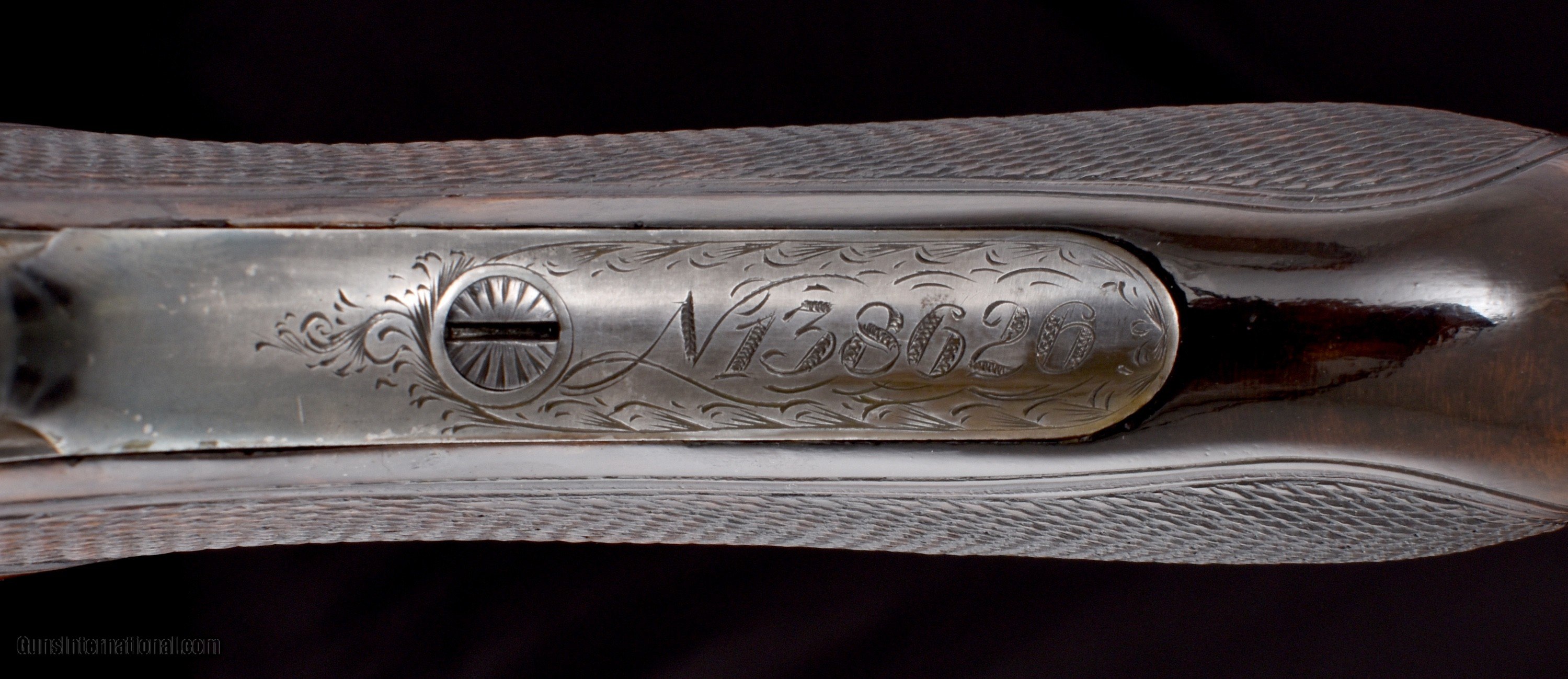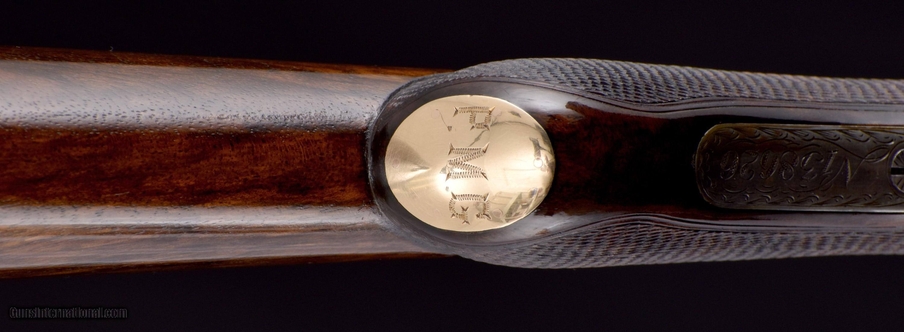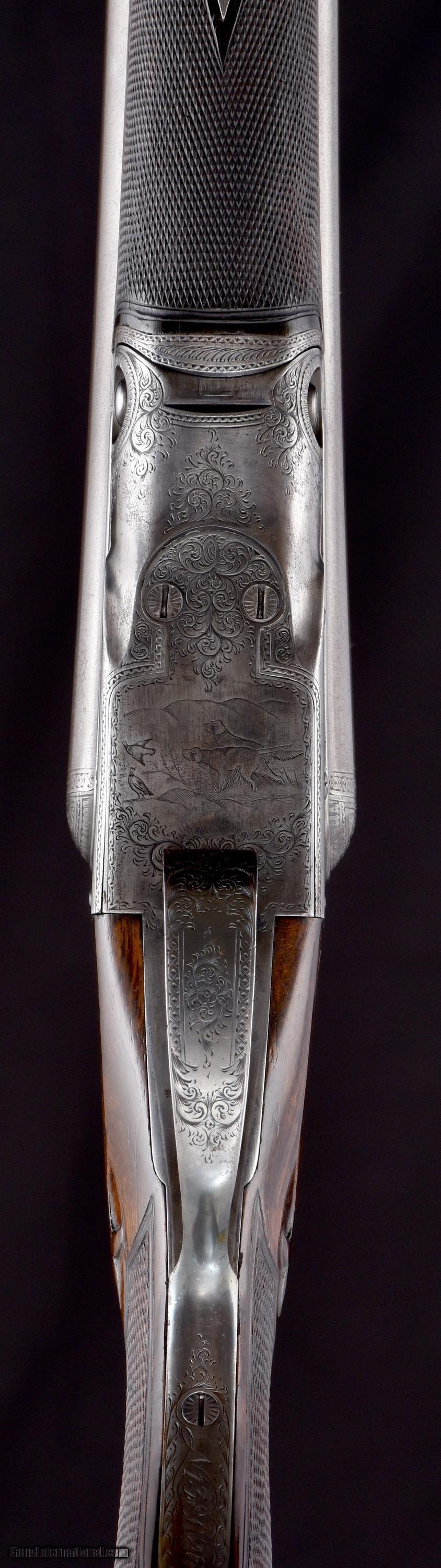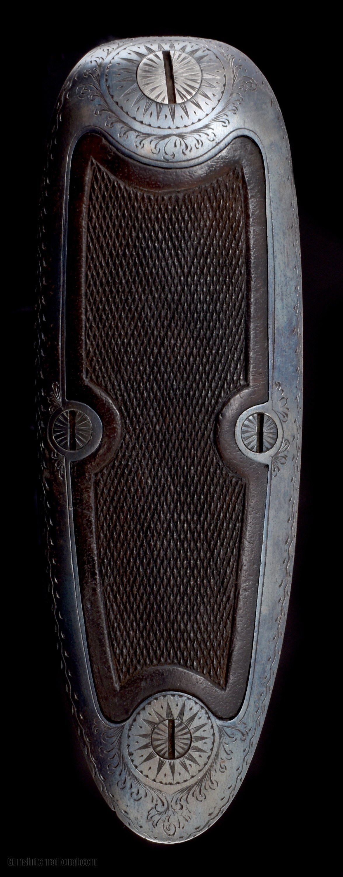 Description: Made on a 0 frame with 28” Damascus steel brls, 2-5/8” chambers, that have matted concave top rib with small brass front bead. Brls with small ring of engraving at breech ends and flats with unstruck brl weight of 3lbs. 2oz. Splinter forearm is near full coverage checkered with scroll engraved steel tip Deeley, latch release, and iron. Casehardened boxlock receiver is nicely engraved. Left side with 2 Pointers in oval, right side with 2 Setters, remainder of sides with fine scroll, and “PARKER BROS” in rectangle banner. Brl fences are scroll engraved and beaded. Top lever is sculpted and scroll engraved. Front of frame with scroll and trigger plate with beautiful game scene showing Setter and Pointer flushing 2 birds surrounded by scroll. The blued trigger guard with floral scroll on bow. The beautifully figured French Walnut round knob pistol grip buttstock has checkered side panels and fleur-de-lis carving behind receiver, is checkered in flowing wave mullered border patter through the wrist and terminates with its original engraved blued skeleton steel buttplate. Ball grip is capped with gold inlaid oval and is engraved with initials “PMG”. Gun remains in excellent overall condition as partially restored. Barrels with 95-97% restored Damascus pattern. Engraving remains excellent. Stocks are sound and excellent with nearly all of a superb professional restored finish. Bores are bright and shiny, mechanics are perfect. This rare Parker is priced at $19950 plus shipping to your FFL. Please don't hesitate to contact me with any questions or reasonable offers at (704) 280-2382 or via PM on this site. SOLD Curio/Relic: Yes Shotgun Gauge: 20 Gauge Manufacturer: Parker Bros. Model: BHE Serial Number: 138626 Barrel Length: 28 Chambers: 2-5/8 Condition: Excellent Metal Condition: Excellent Wood Condition: Excellent as restored Bore Condition: Bright and shiny Barrel Type: Damascus Triggers: Double triggers Stock Comb: 1-3/4 Stock Heel: 2-13/16 Fore End: Splinter Butt Pad: Original Skeleton BP LOP: 14-1/4 Weight: 5lbs. 13oz. Choke Left: .019 Choke Right: .032 |