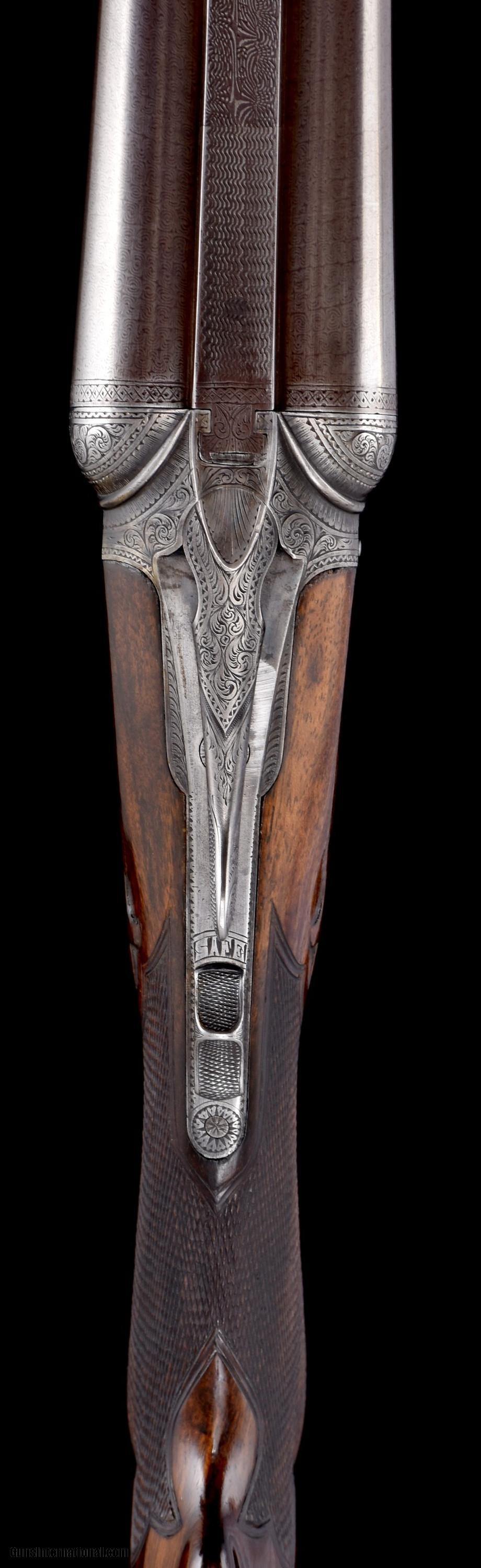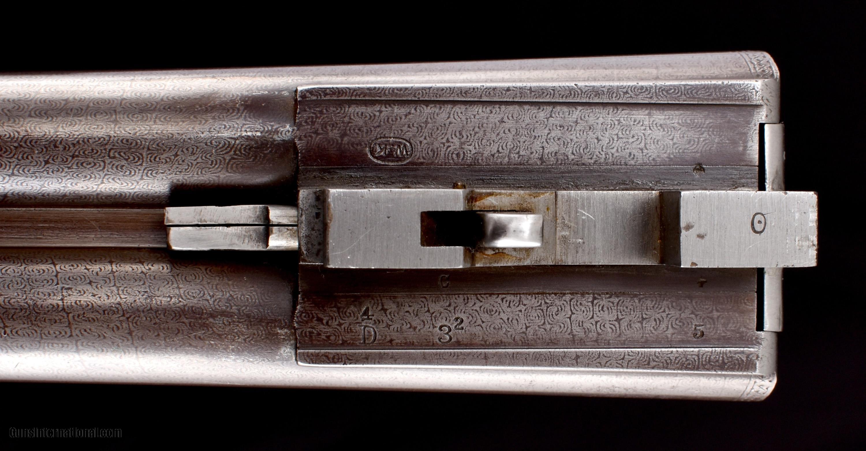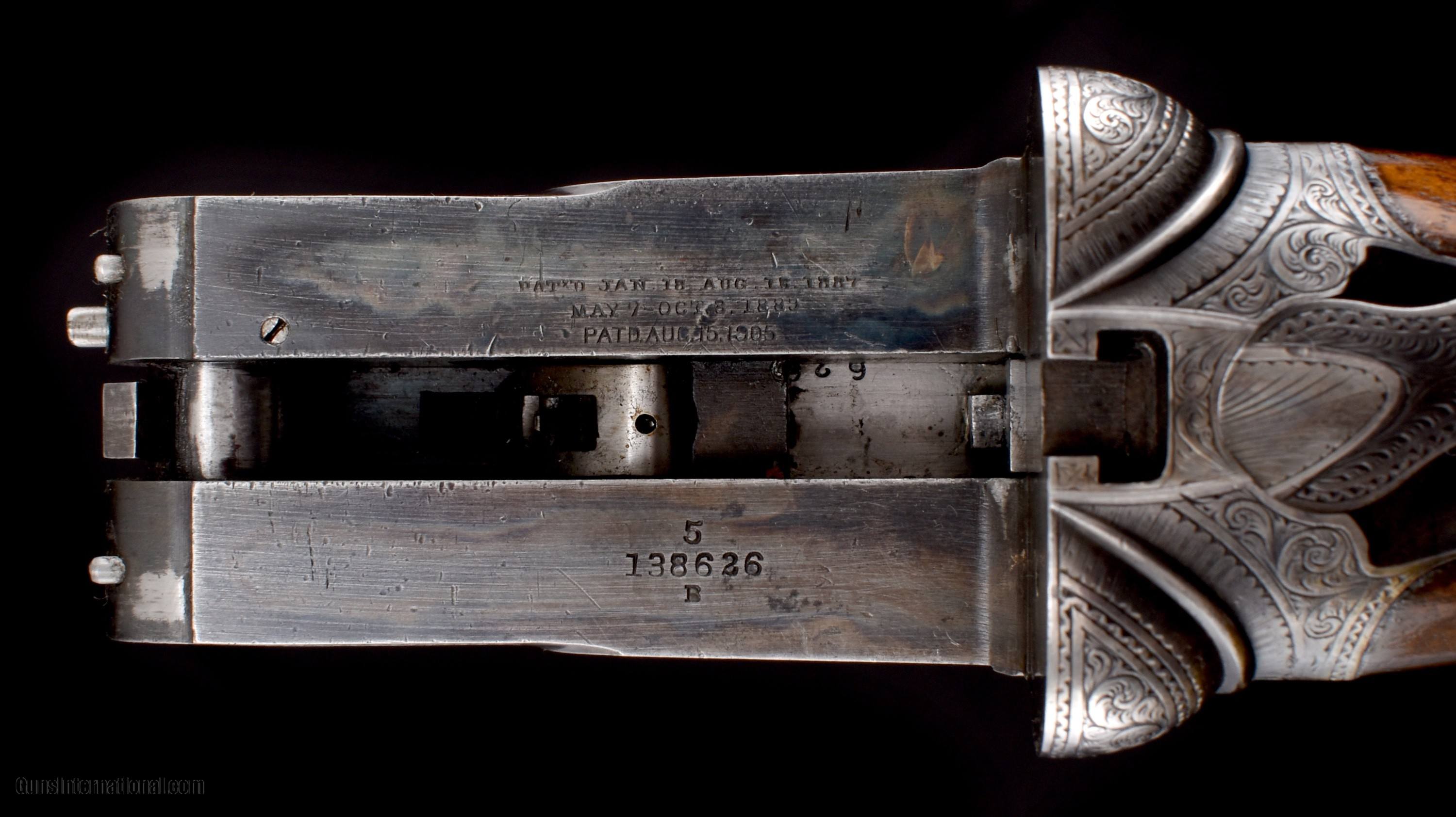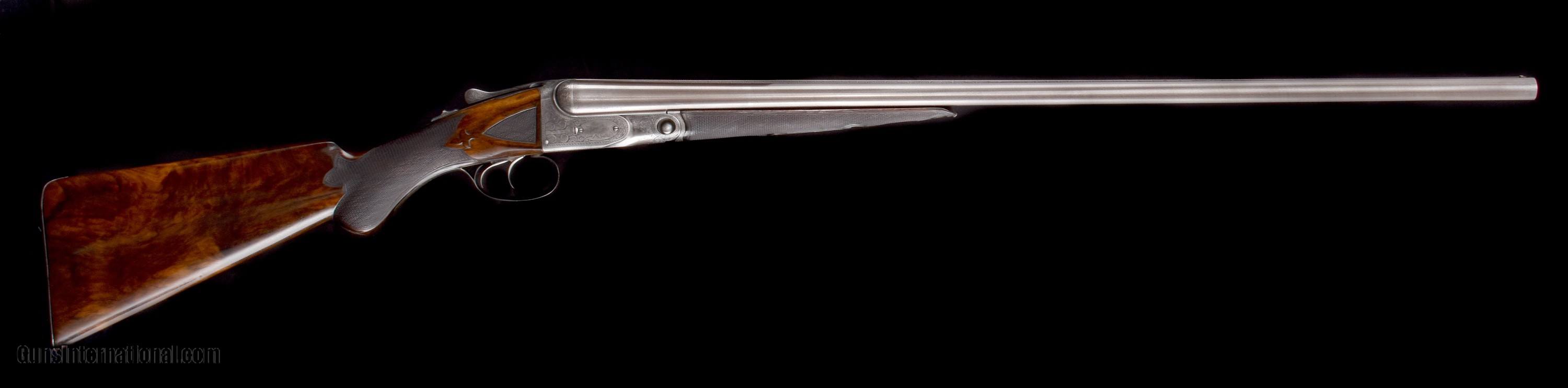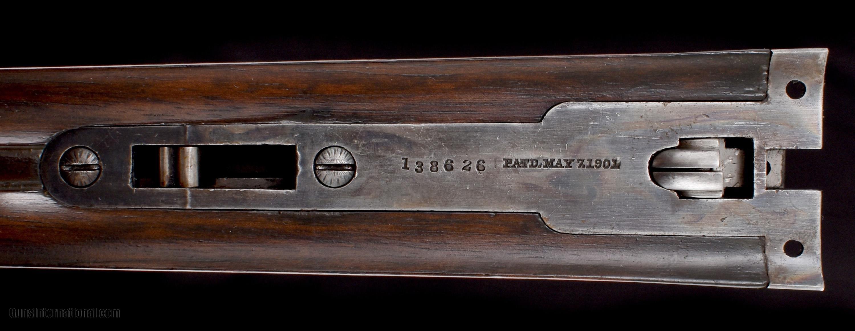 Description: Made on a 0 frame with 28” Damascus steel brls, 2-5/8” chambers, that have matted concave top rib with small brass front bead. Brls with small ring of engraving at breech ends and flats with unstruck brl weight of 3lbs. 2oz. Splinter forearm is near full coverage checkered with scroll engraved steel tip Deeley, latch release, and iron. Casehardened boxlock receiver is nicely engraved. Left side with 2 Pointers in oval, right side with 2 Setters, remainder of sides with fine scroll, and “PARKER BROS” in rectangle banner. Brl fences are scroll engraved and beaded. Top lever is sculpted and scroll engraved. Front of frame with scroll and trigger plate with beautiful game scene showing Setter and Pointer flushing 2 birds surrounded by scroll. The blued trigger guard with floral scroll on bow. The beautifully figured French Walnut round knob pistol grip buttstock has checkered side panels and fleur-de-lis carving behind receiver, is checkered in flowing wave mullered border patter through the wrist and terminates with its original engraved blued skeleton steel buttplate. Ball grip is capped with gold inlaid oval and is engraved with initials “PMG”. Gun remains in excellent overall condition as partially restored. Barrels with 95-97% restored Damascus pattern. Engraving remains excellent. Stocks are sound and excellent with nearly all of a superb professional restored finish. Bores are bright and shiny, mechanics are perfect. This rare Parker is priced at $19950 plus shipping to your FFL. Please don't hesitate to contact me with any questions or reasonable offers at (704) 280-2382 or via PM on this site. SOLD Curio/Relic: Yes Shotgun Gauge: 20 Gauge Manufacturer: Parker Bros. Model: BHE Serial Number: 138626 Barrel Length: 28 Chambers: 2-5/8 Condition: Excellent Metal Condition: Excellent Wood Condition: Excellent as restored Bore Condition: Bright and shiny Barrel Type: Damascus Triggers: Double triggers Stock Comb: 1-3/4 Stock Heel: 2-13/16 Fore End: Splinter Butt Pad: Original Skeleton BP LOP: 14-1/4 Weight: 5lbs. 13oz. Choke Left: .019 Choke Right: .032 |