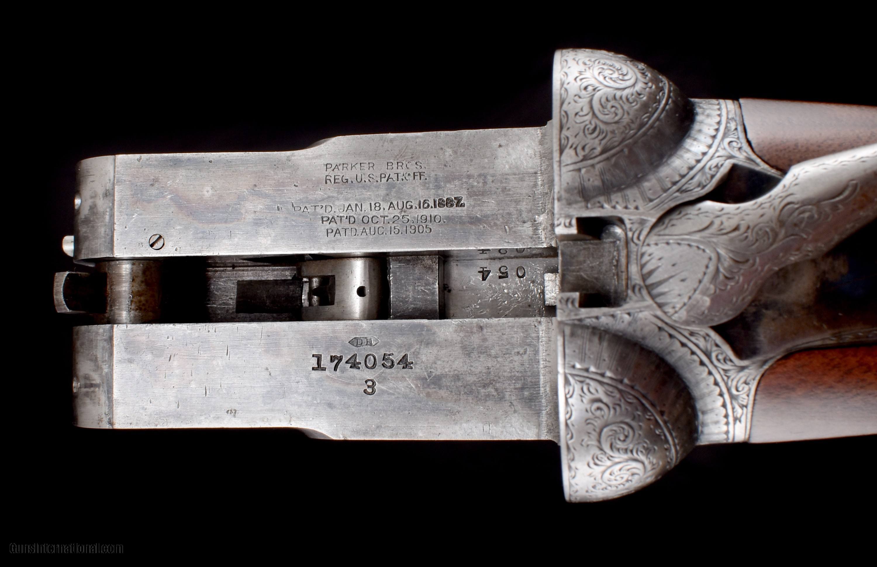 Description: Interesting special order DH 12ga. This gun with 32" barrels, splinter forend (numbers are 900 numbers off), double triggers. Gun special ordered without safety as a live bird or competition gun as seen in the photos. Capped pistol grip buttstock with modern Silvers type pad. Gun remains in very good overall shape. Barrels with about 70% speckeled original blue. Frame with traces of original color, engraving is fine. Stocks have been restored. Bores are bright and shiny and the gun is mechanically very good. This fine Parker is priced at $1950 plus shipping to your FFL. Please dont hesitate to contact me with any questions or reasonable offers via PM on this site or at (704) 280-2382. SOLD Curio/Relic: Yes Shotgun Gauge: 12 Gauge Manufacturer: Parker Bros. Model: DHE Serial Number: 174054 Barrel Length: 32 Chambers: 2-3/4 Ejectors: Yes Condition: Very good Metal Condition: Very good Wood Condition: Very good as restored Bore Condition: Very good Barrels: Titanic Triggers: Double Triggers Stock Comb: 1-3/4 Stock Heel: 2-7/8 Fore End: Splinter Butt Pad: Modern Silvers Type LOP: 14-3/8 Weight: 7lbs 13oz Choke Left: .042 Choke Right: .038 Minimum Wall Thickness Left: Over .025 Minimum Wall Thickness Right: Over .025 |
