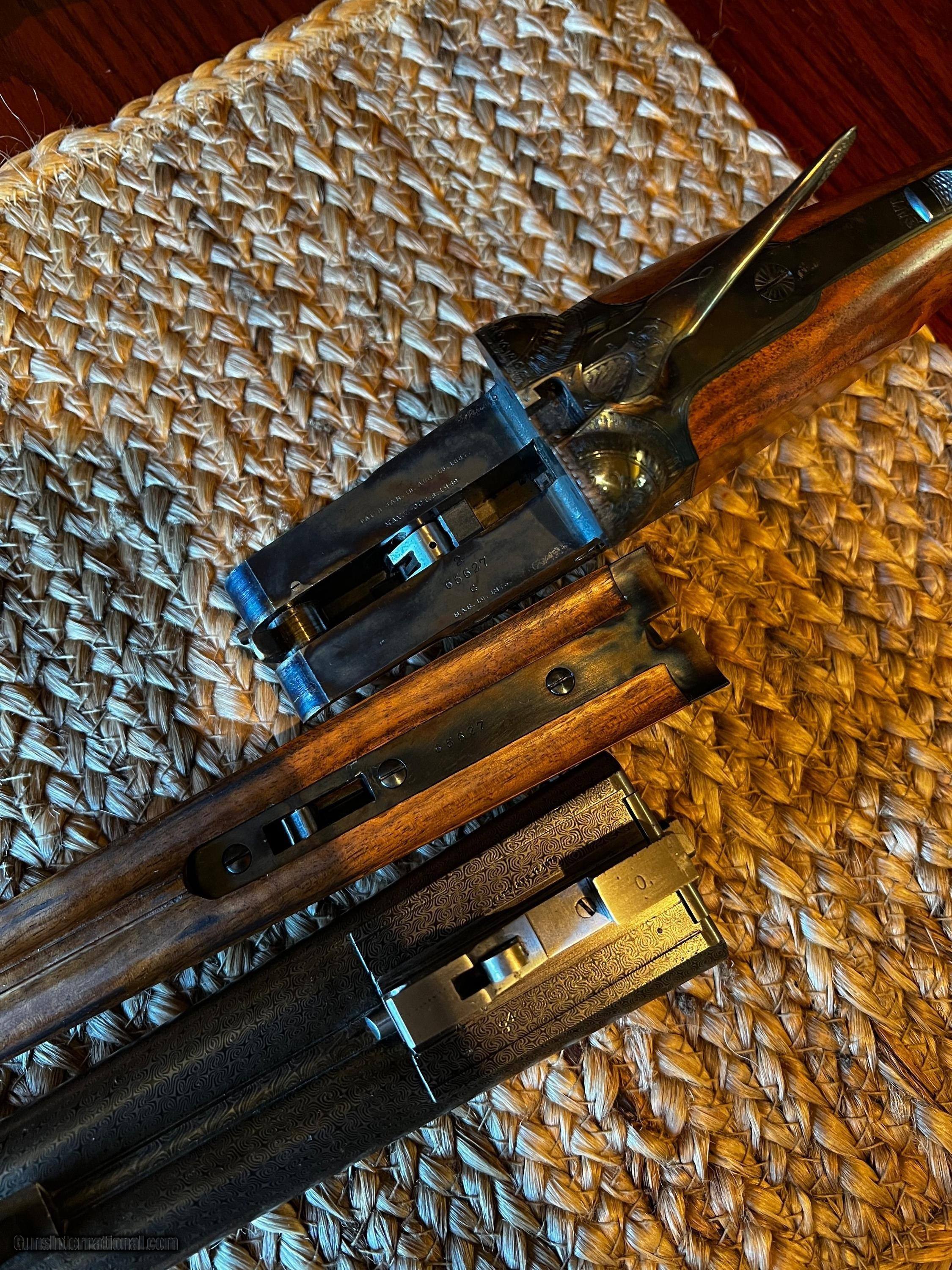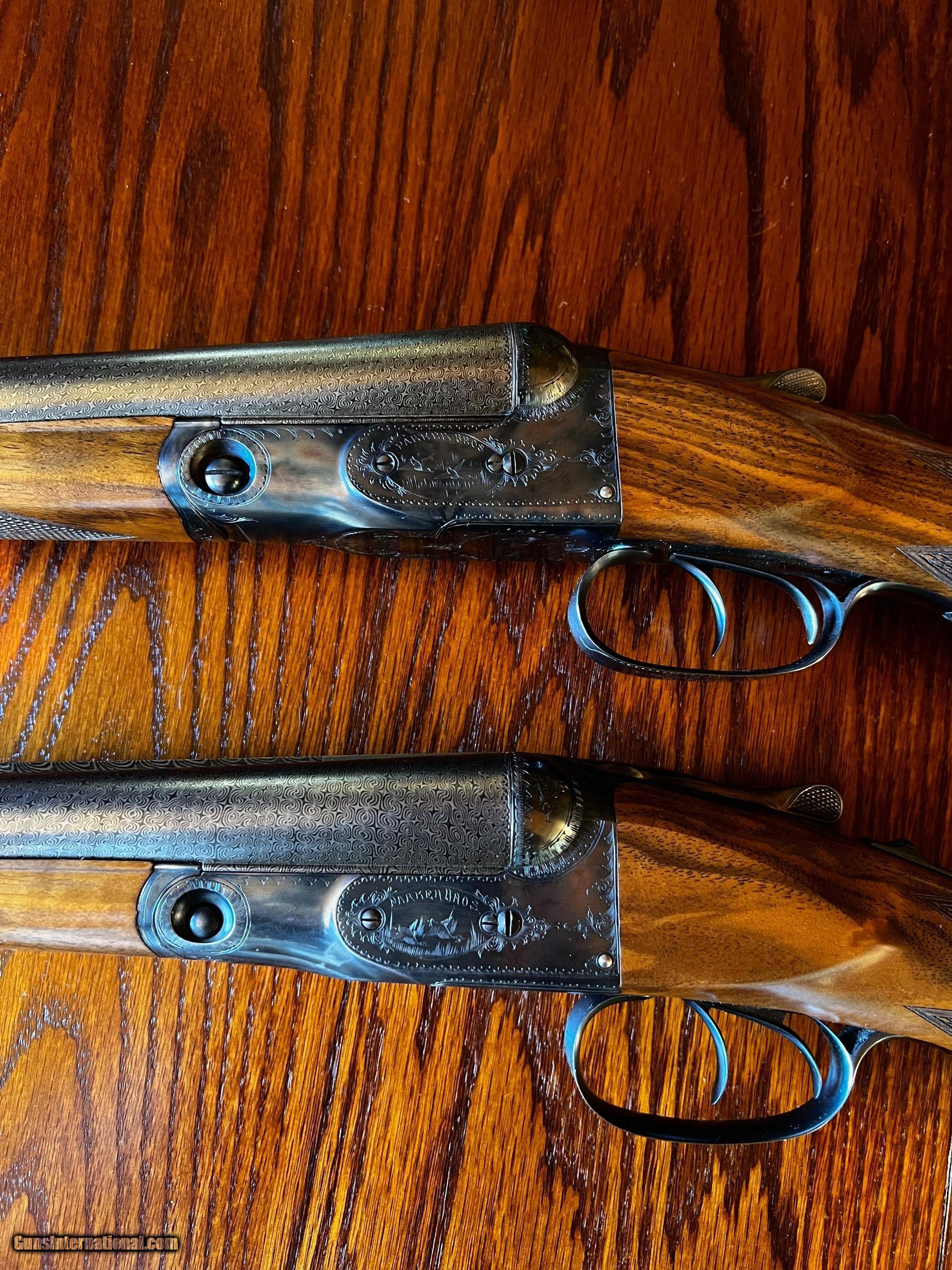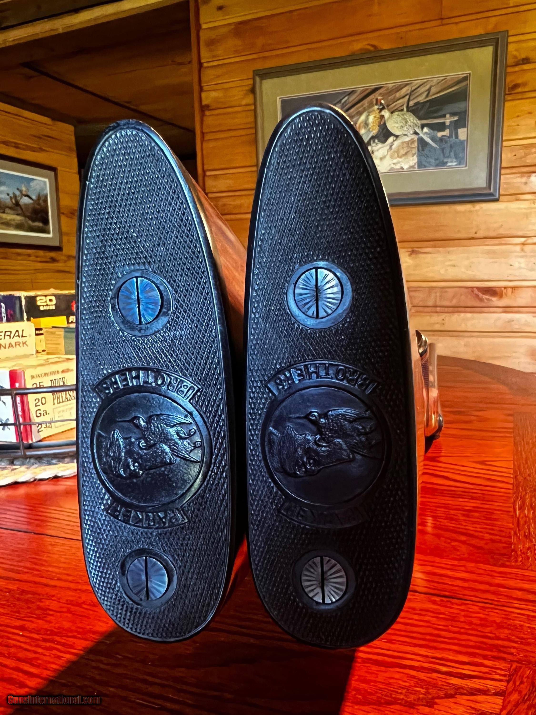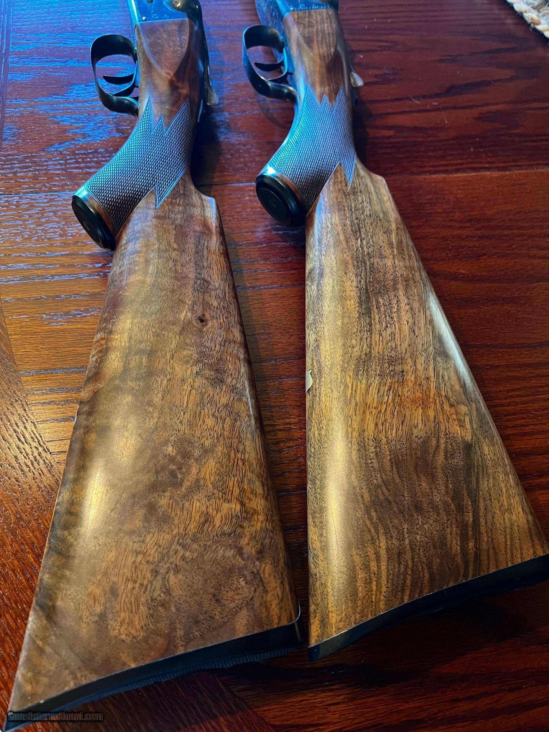 Description: Price Reduced. $7000.00 Each Here is a composed pair of 16 ga. On 0 frames I had completely restored to new. A process that took 2.5 years to complete. Both are GH grades, with incredible Damascus barrels. Brian Dudley handled the whole restoration, and nothing was spared. Turnbull case colors, Geoffrey Gournet completely recut all engraving and added tail fans on the 26" gun and completely removed the scene on the 28" gun and added Sharptail grouse from pictures I sent. Incredible craftsmanship is an understatement as the 28" gun was missing all action screws and most internal parts! Both guns are stocked in Circassian walnut at 1 7/16"x2 7/16"x15" lop. The 26" gun weighs 6.4 due to the higher figure in that stock, the 28" gun weighs 6.3. Both cast off 1/4". Made in 1891 and 1893 they truly are working pieces of art. Being antique status, I can ship directly to your door. The 26" gun is choked .003 and .015 and has taken its share of grouse and woodcock over my Setters, and shows a little wear from carry. The 28" gun is choked .018 and .025 and has had less than a few boxes of shells through it since restoration. If interested, make offer. SOLD Antique: Yes Shotgun Gauge: 16 Gauge Manufacturer: Parker Brothers Model: GH Serial Number: 65627 & 79417 Chambers: 2.5 Ejectors: N/a Condition: 98 Metal Condition: 98 Wood Condition: 98 Bore Condition: Bright and shiny Barrels: Damascus Barrel Type: SxS Action: Boxlock Triggers: Double Stock: Circassian Walnut Stock Dimensions: 1 7/16x2 7/16x15 Stock Comb: 1 7/16” Stock Heel: 2 7/16” Stock Cast: 1/4” Fore End: Splinter Butt Pad: #1 dhbp LOP: 15” Rib: Concave Weight: 6.3 and 6.4 Sights: Single Factory bead Manufacture Date: 1891 and 1893 Chokes: See above Engraving: Completely recut to new Proof:Black: Damascus |