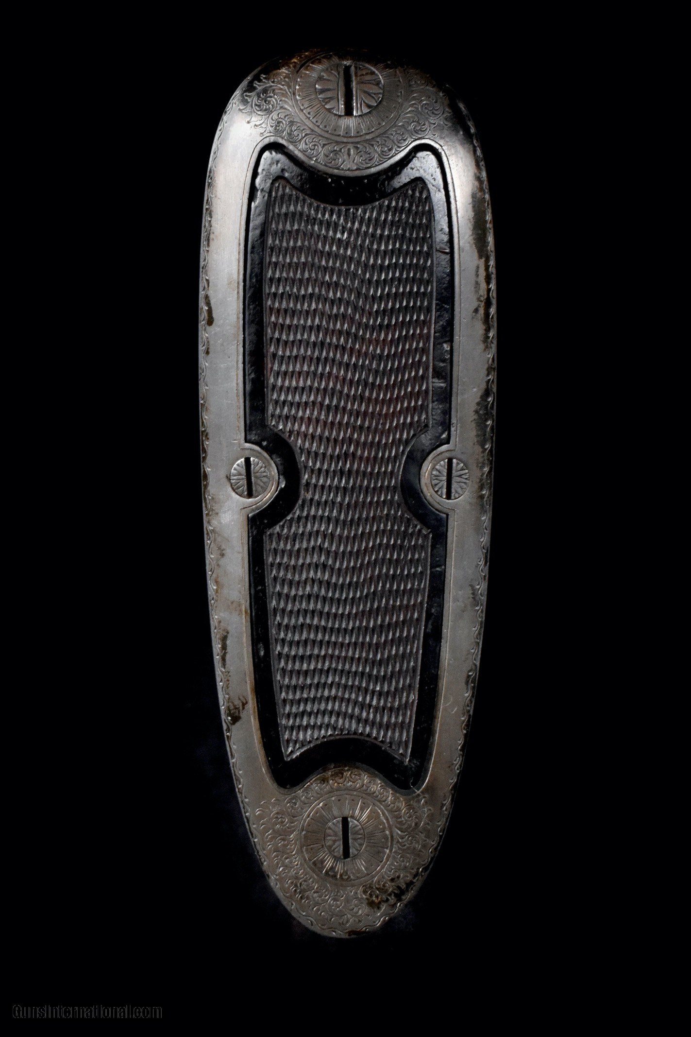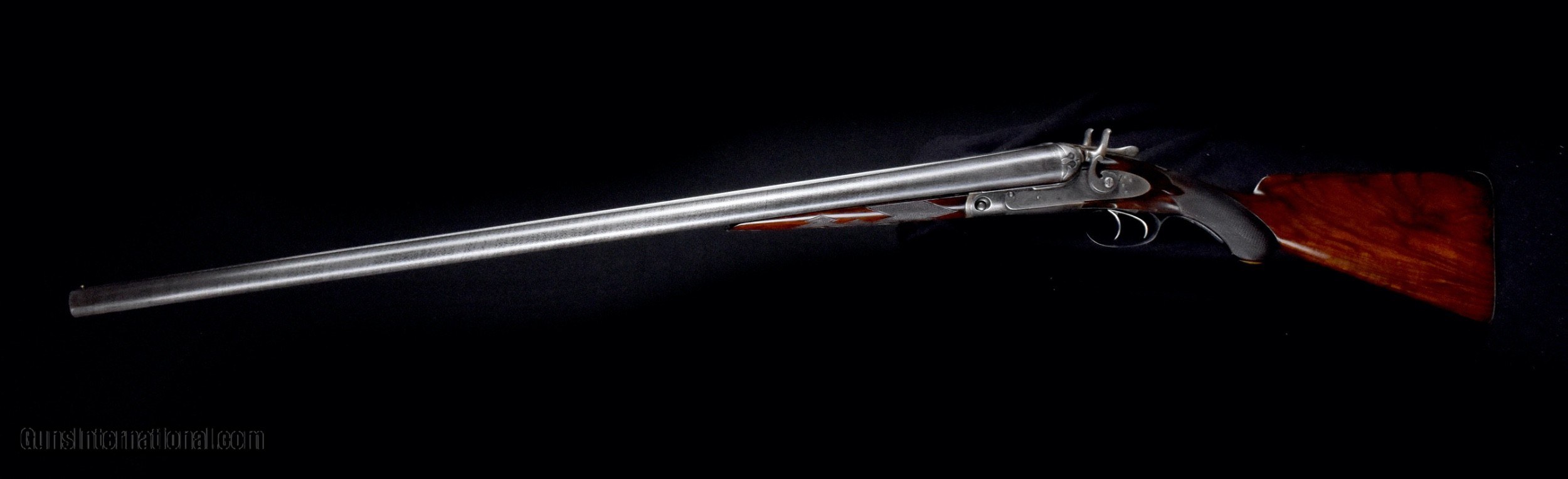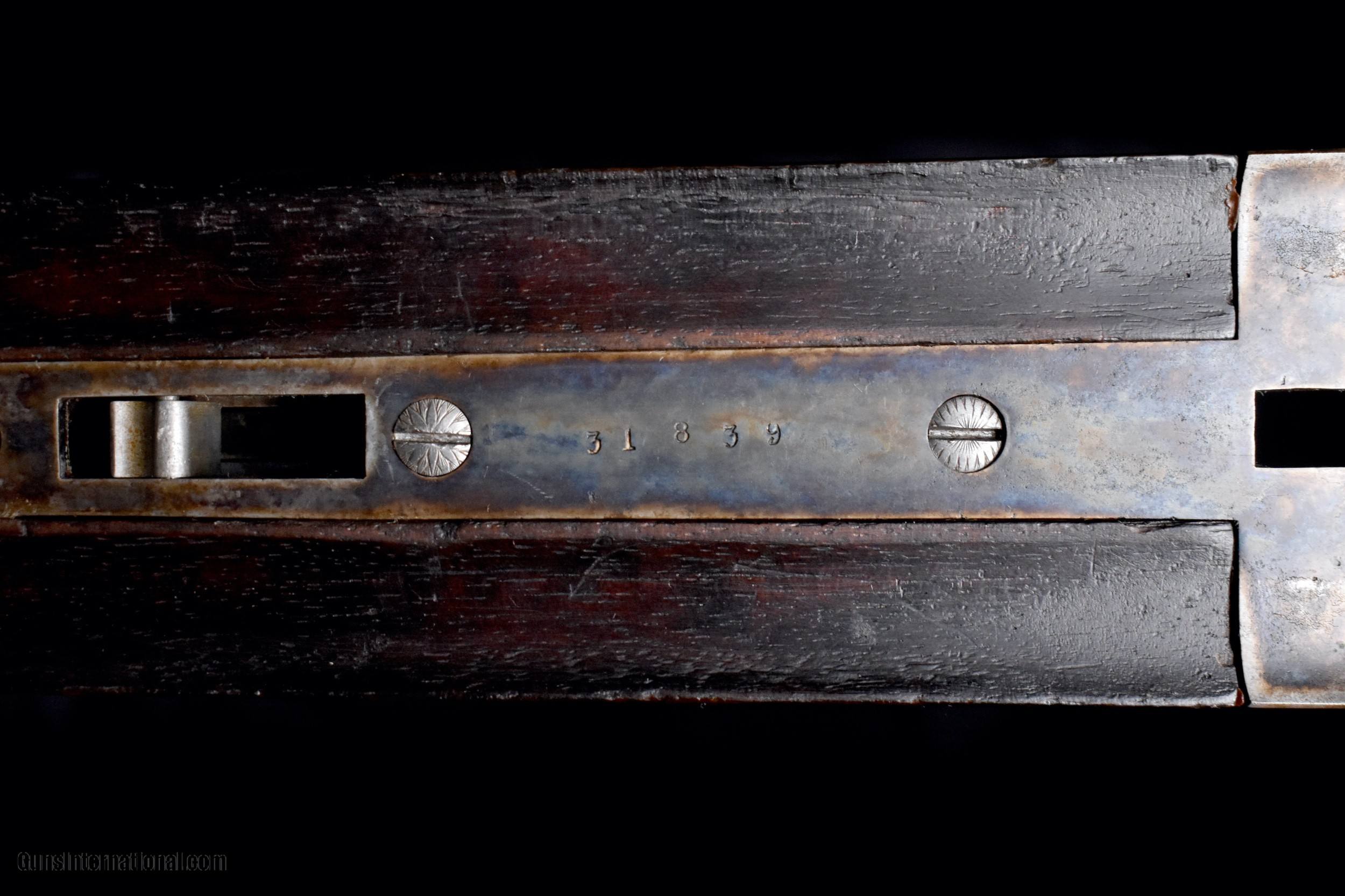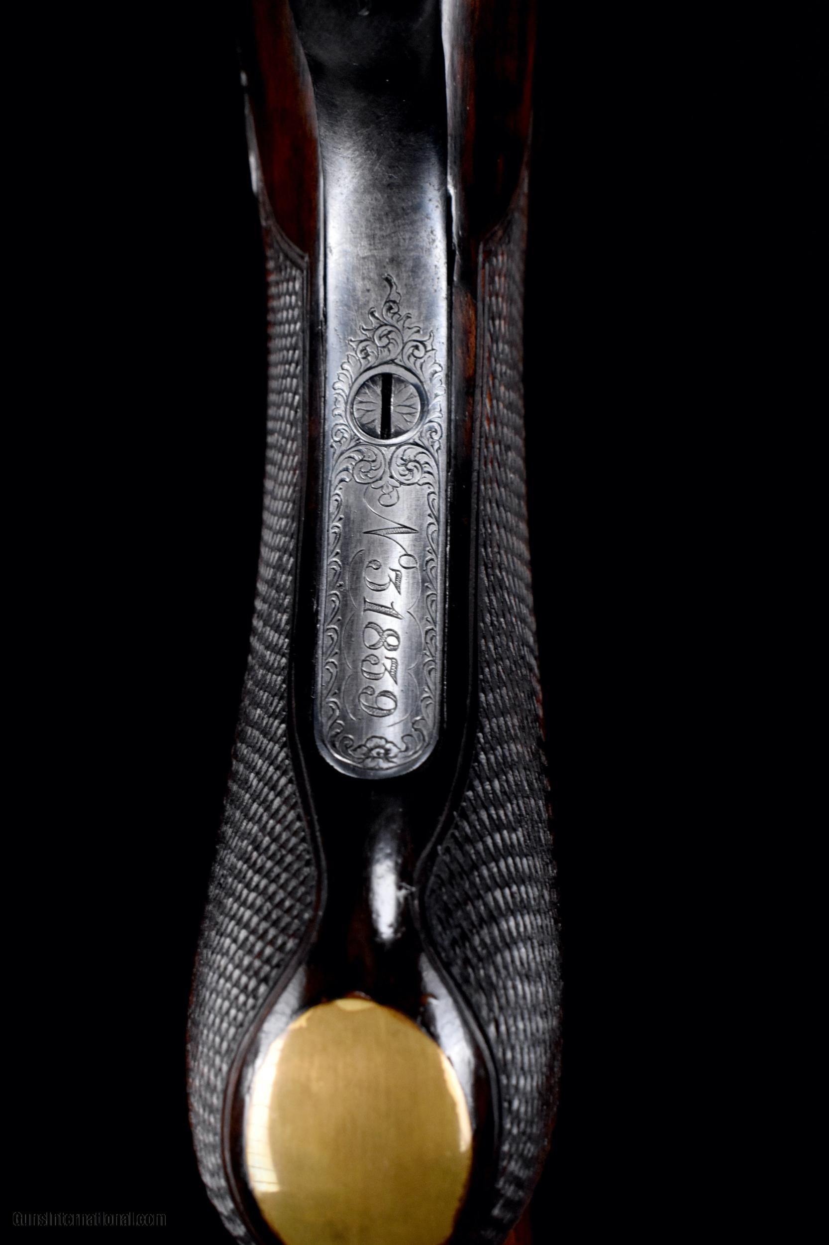 Description: This gun was part of a set of 8 Grade 6 (A Grade) Hammer guns, all 10ga guns, ordered by E.C. Meachem Arms Co. of At. Louis in early 1883. These guns are known to advanced collectors as the "Meachem Arms Set" and are the only grouping of high grade hammer guns like this known to exist! The guns, all labeled "PREMIER QUALITY" in the Parker records are all 10ga guns made with 32" barrels. I have 3 of the guns from that order for sale now- this one being the first SN 31839. This gun, made with 32" Damascus barrels, checkered splinter forend with fully engraved latch release. The case hardened action is absolutely full coverage engraved with scroll and fine game scenes throughout. Tear drops sculpted on the barrel bolsters which are also fully engraved. Trigger guard is near fully engraved with SN at tang. Stocks are beautifully figured finest quality European Walnut with round pistol grip with gold oval cap and terminate with the original engraved skeleton buttplate. I have attached a photo of the original order from the original order books to show this incredible order! Overall, this gun remains in excellent overall condition. Barrels retain about 90%++ of their bold damascus pattern. Action retains a flash or two of case color, engraving still clear and fine all the way around. Stocks are sound, checkering is fine and they retain nearly all of a professionally restored hand rubbed finish. Bores do show some orange peel and minor pitting but overall fine. Mechanics are crisp. These #4 Frame 10ga guns dont come along everyday and this is literally a once in a generation opportunity to purchase a trio of Grade 6 hammer guns from the same order (see my other listings for the other two guns). This gun can be purchased individually for $19,500 or as part of the trio for a volume discount price. Please dont hesitate to contact me with any questions or reasonable offers at (704) 280-2382 or via PM on this site. SOLD Antique: Yes Shotgun Gauge: 10 Gauge Manufacturer: Parker Bros. Model: Grade 6 (A Grade) Serial Number: 38139 Chambers: 3" (For Brass) Condition: Excellent Metal Condition: Excellent Wood Condition: Excellent Bore Condition: Very good Barrel Type: Finest Damascus Triggers: Double Triggers Stock Comb: 2-1/8 Stock Heel: 3 Fore End: Splinter Butt Pad: Original Skeleton BP LOP: 14-3/8 Weight: 9lbs 9oz Minimum Wall Thickness Left: Over .030 Minimum Wall Thickness Right: Over .030 |