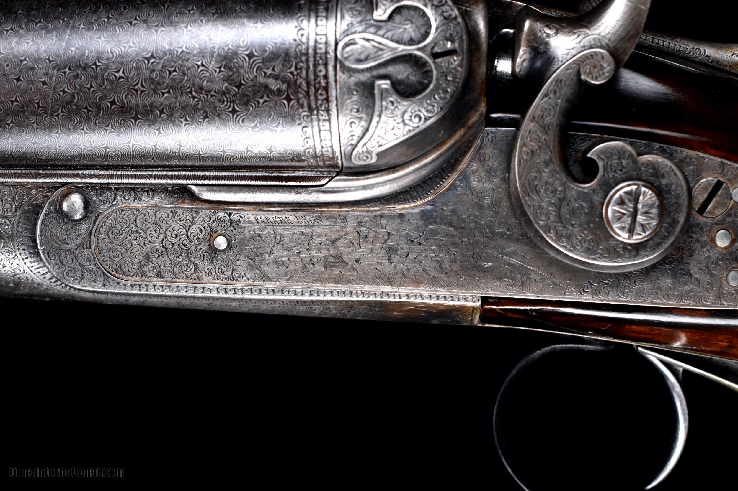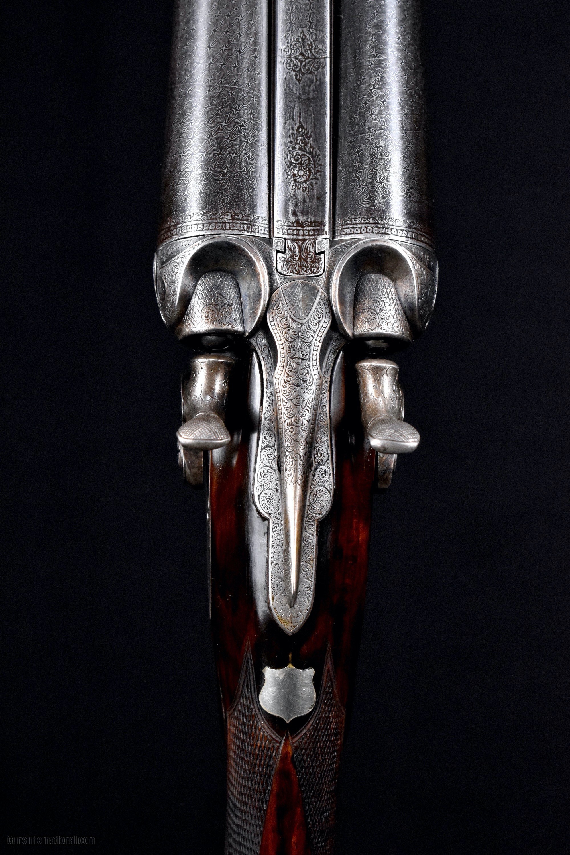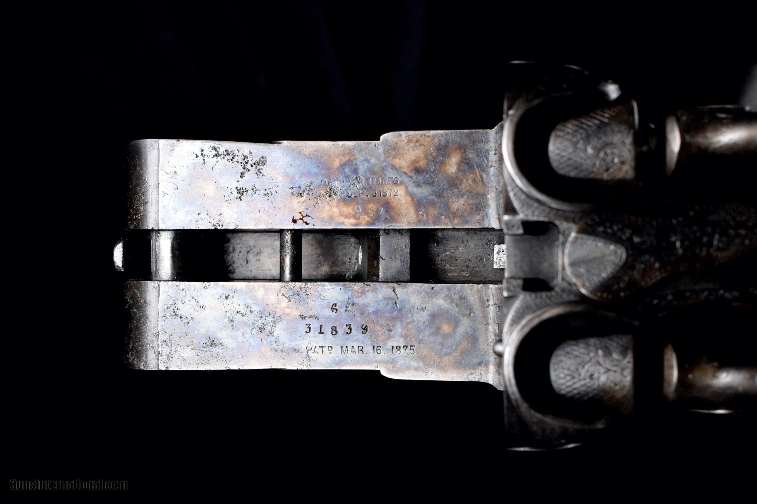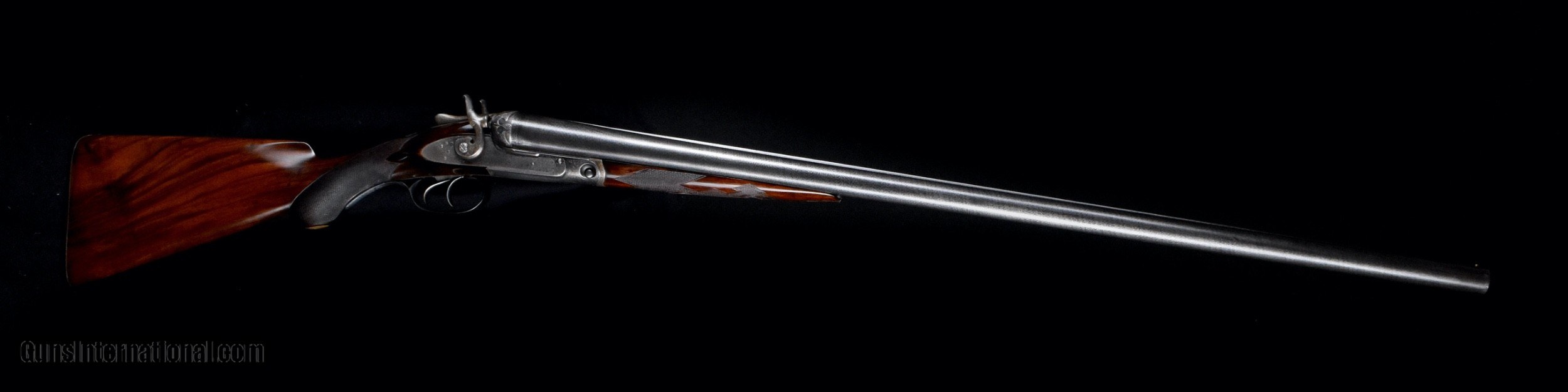 Description: This gun was part of a set of 8 Grade 6 (A Grade) Hammer guns, all 10ga guns, ordered by E.C. Meachem Arms Co. of At. Louis in early 1883. These guns are known to advanced collectors as the "Meachem Arms Set" and are the only grouping of high grade hammer guns like this known to exist! The guns, all labeled "PREMIER QUALITY" in the Parker records are all 10ga guns made with 32" barrels. I have 3 of the guns from that order for sale now- this one being the first SN 31839. This gun, made with 32" Damascus barrels, checkered splinter forend with fully engraved latch release. The case hardened action is absolutely full coverage engraved with scroll and fine game scenes throughout. Tear drops sculpted on the barrel bolsters which are also fully engraved. Trigger guard is near fully engraved with SN at tang. Stocks are beautifully figured finest quality European Walnut with round pistol grip with gold oval cap and terminate with the original engraved skeleton buttplate. I have attached a photo of the original order from the original order books to show this incredible order! Overall, this gun remains in excellent overall condition. Barrels retain about 90%++ of their bold damascus pattern. Action retains a flash or two of case color, engraving still clear and fine all the way around. Stocks are sound, checkering is fine and they retain nearly all of a professionally restored hand rubbed finish. Bores do show some orange peel and minor pitting but overall fine. Mechanics are crisp. These #4 Frame 10ga guns dont come along everyday and this is literally a once in a generation opportunity to purchase a trio of Grade 6 hammer guns from the same order (see my other listings for the other two guns). This gun can be purchased individually for $19,500 or as part of the trio for a volume discount price. Please dont hesitate to contact me with any questions or reasonable offers at (704) 280-2382 or via PM on this site. SOLD Antique: Yes Shotgun Gauge: 10 Gauge Manufacturer: Parker Bros. Model: Grade 6 (A Grade) Serial Number: 38139 Chambers: 3" (For Brass) Condition: Excellent Metal Condition: Excellent Wood Condition: Excellent Bore Condition: Very good Barrel Type: Finest Damascus Triggers: Double Triggers Stock Comb: 2-1/8 Stock Heel: 3 Fore End: Splinter Butt Pad: Original Skeleton BP LOP: 14-3/8 Weight: 9lbs 9oz Minimum Wall Thickness Left: Over .030 Minimum Wall Thickness Right: Over .030 |
