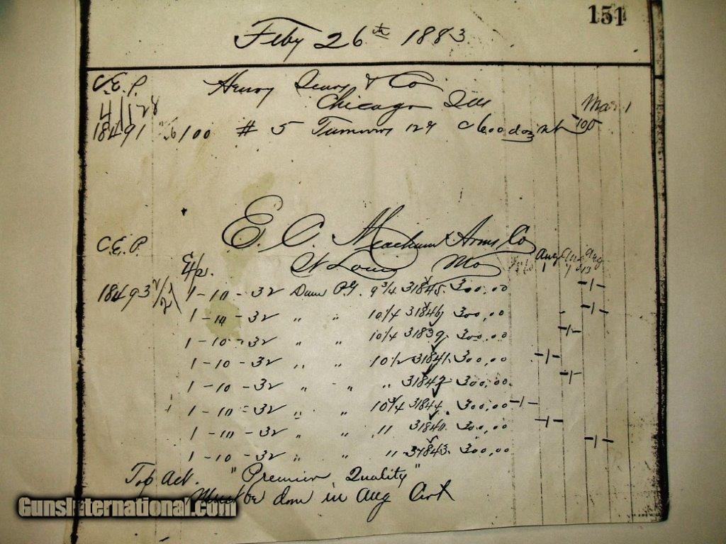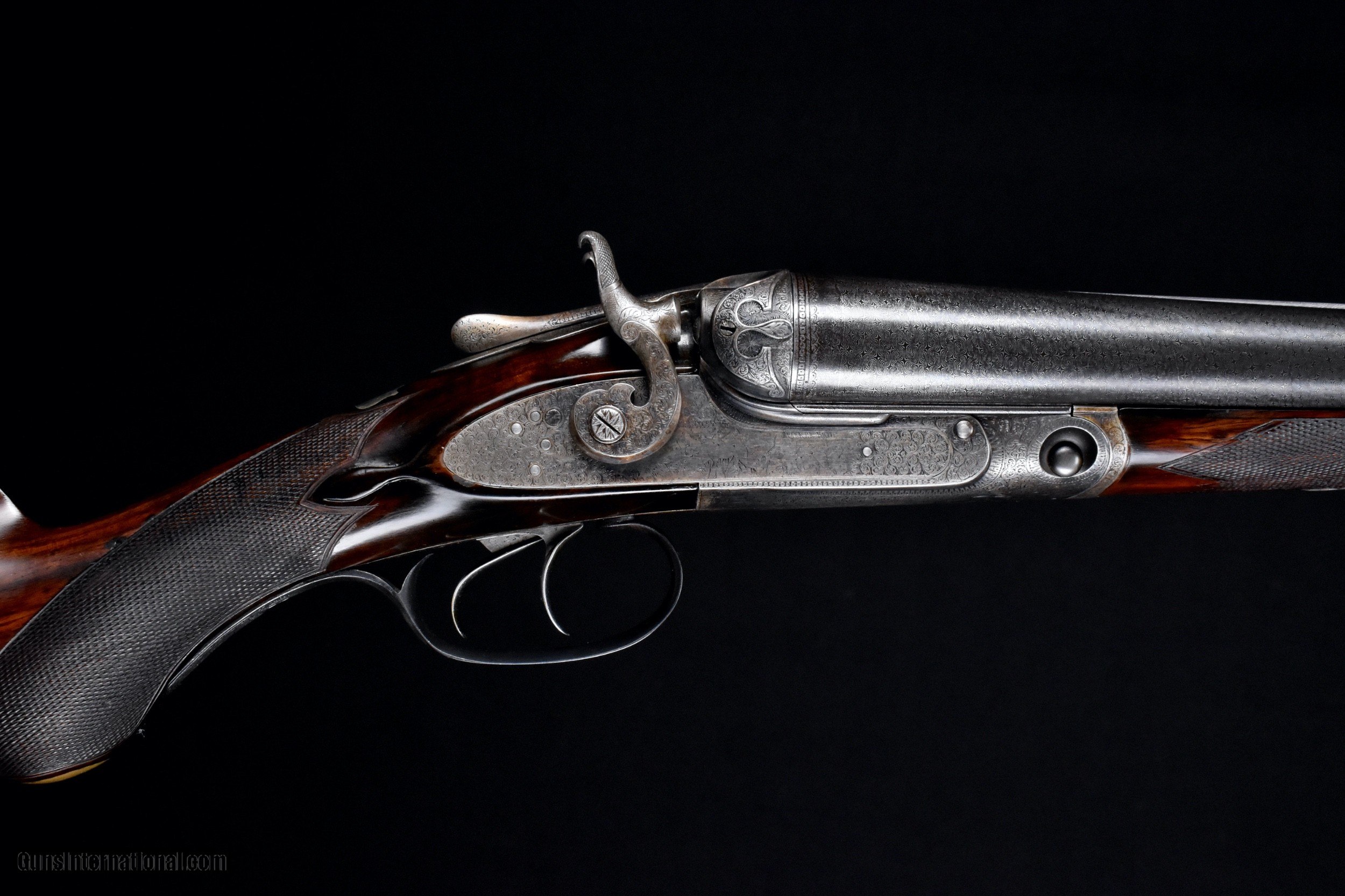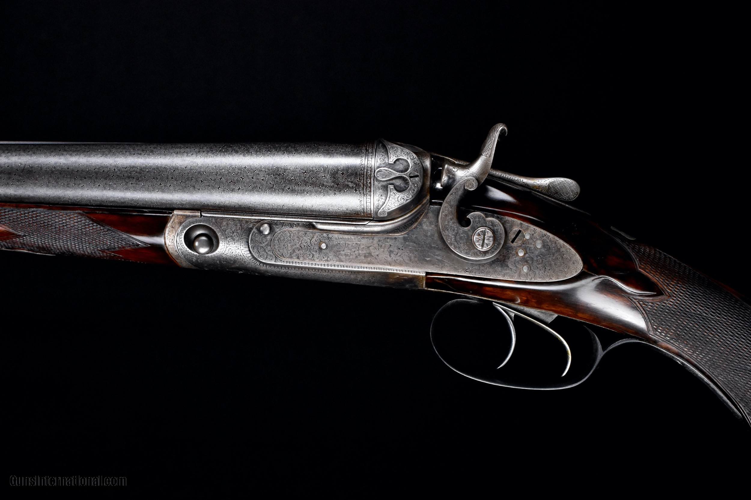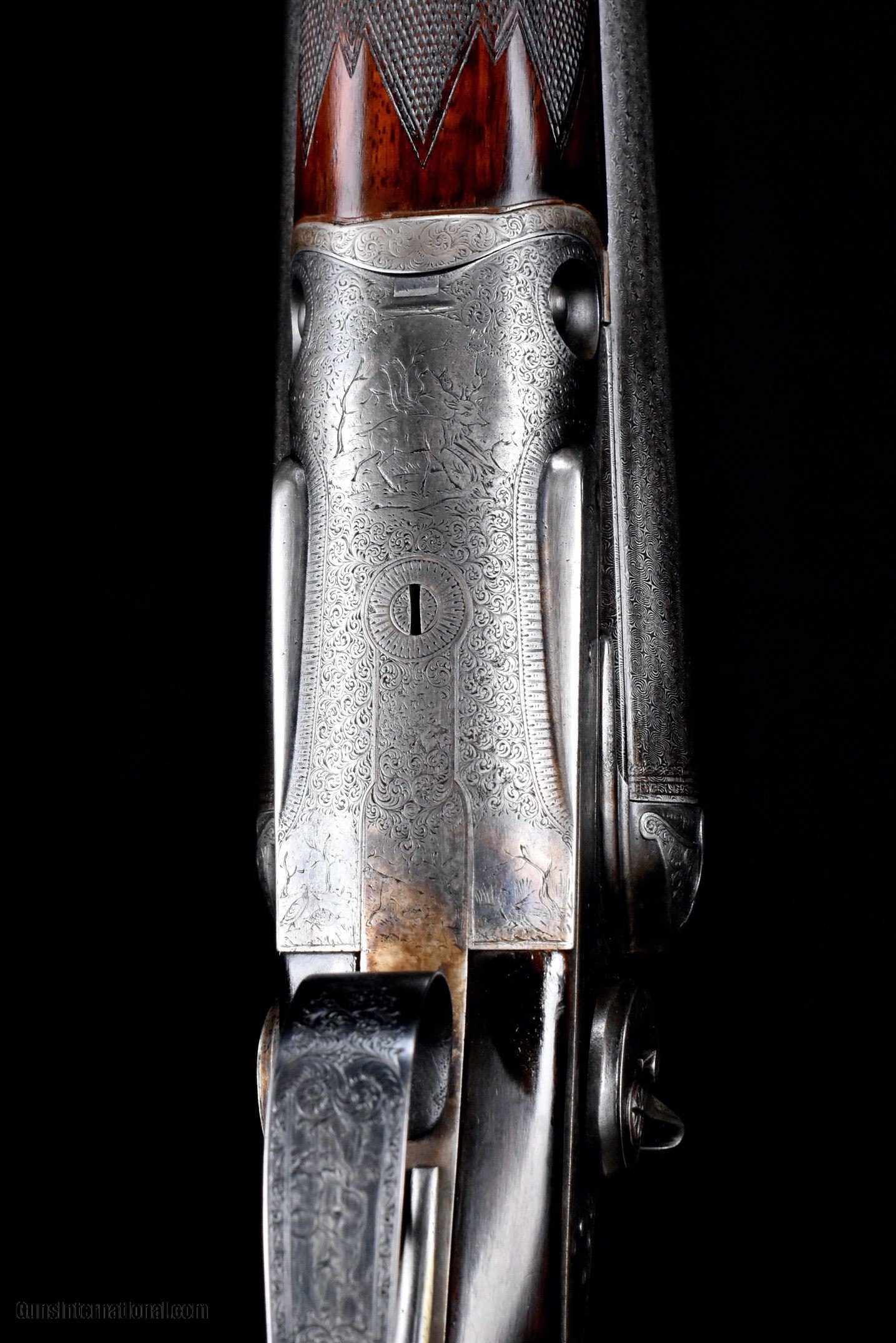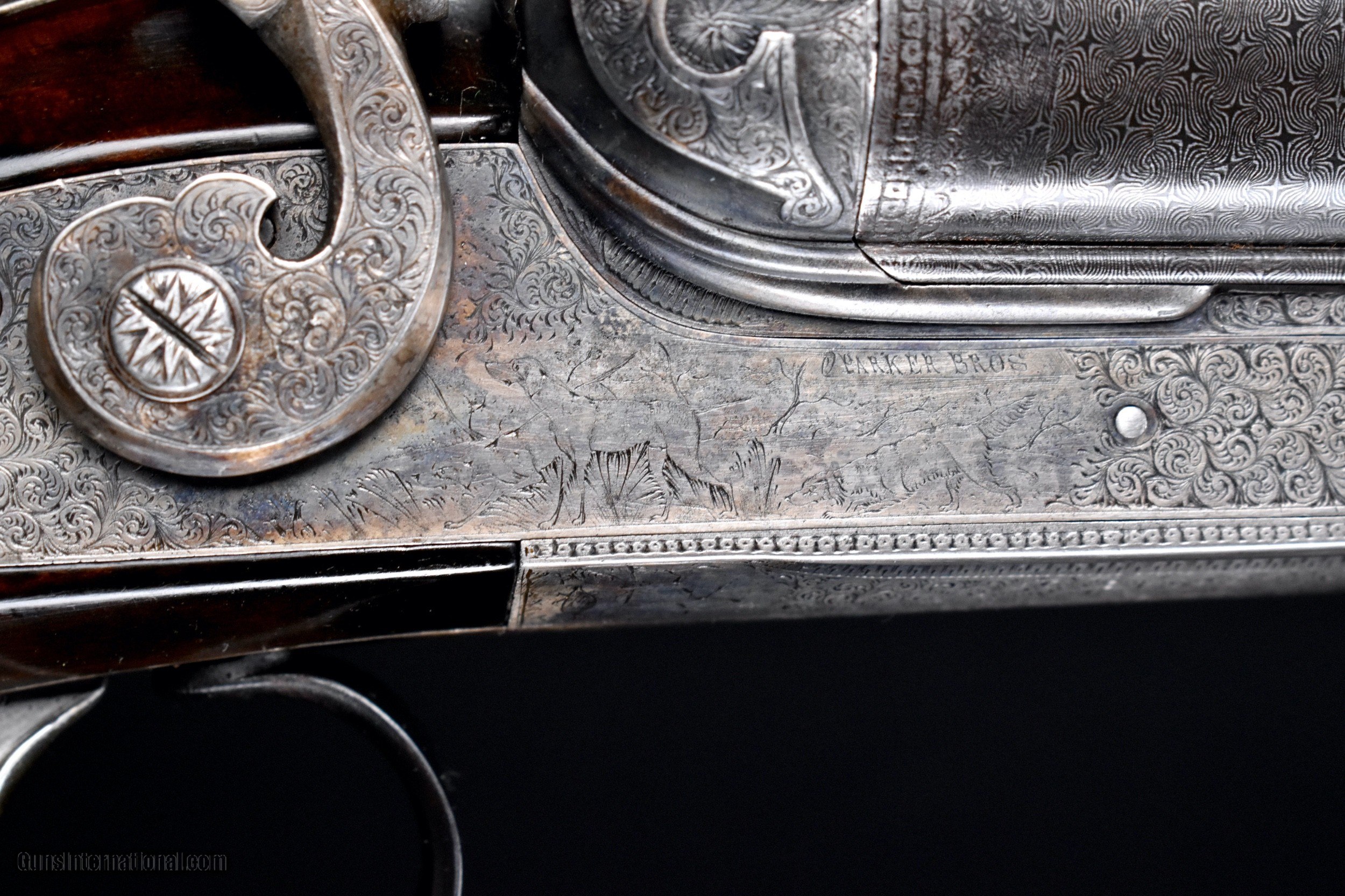 Description: This gun was part of a set of 8 Grade 6 (A Grade) Hammer guns, all 10ga guns, ordered by E.C. Meachem Arms Co. of At. Louis in early 1883. These guns are known to advanced collectors as the "Meachem Arms Set" and are the only grouping of high grade hammer guns like this known to exist! The guns, all labeled "PREMIER QUALITY" in the Parker records are all 10ga guns made with 32" barrels. I have 3 of the guns from that order for sale now- this one being the first SN 31839. This gun, made with 32" Damascus barrels, checkered splinter forend with fully engraved latch release. The case hardened action is absolutely full coverage engraved with scroll and fine game scenes throughout. Tear drops sculpted on the barrel bolsters which are also fully engraved. Trigger guard is near fully engraved with SN at tang. Stocks are beautifully figured finest quality European Walnut with round pistol grip with gold oval cap and terminate with the original engraved skeleton buttplate. I have attached a photo of the original order from the original order books to show this incredible order! Overall, this gun remains in excellent overall condition. Barrels retain about 90%++ of their bold damascus pattern. Action retains a flash or two of case color, engraving still clear and fine all the way around. Stocks are sound, checkering is fine and they retain nearly all of a professionally restored hand rubbed finish. Bores do show some orange peel and minor pitting but overall fine. Mechanics are crisp. These #4 Frame 10ga guns dont come along everyday and this is literally a once in a generation opportunity to purchase a trio of Grade 6 hammer guns from the same order (see my other listings for the other two guns). This gun can be purchased individually for $19,500 or as part of the trio for a volume discount price. Please dont hesitate to contact me with any questions or reasonable offers at (704) 280-2382 or via PM on this site. SOLD Antique: Yes Shotgun Gauge: 10 Gauge Manufacturer: Parker Bros. Model: Grade 6 (A Grade) Serial Number: 38139 Chambers: 3" (For Brass) Condition: Excellent Metal Condition: Excellent Wood Condition: Excellent Bore Condition: Very good Barrel Type: Finest Damascus Triggers: Double Triggers Stock Comb: 2-1/8 Stock Heel: 3 Fore End: Splinter Butt Pad: Original Skeleton BP LOP: 14-3/8 Weight: 9lbs 9oz Minimum Wall Thickness Left: Over .030 Minimum Wall Thickness Right: Over .030 |