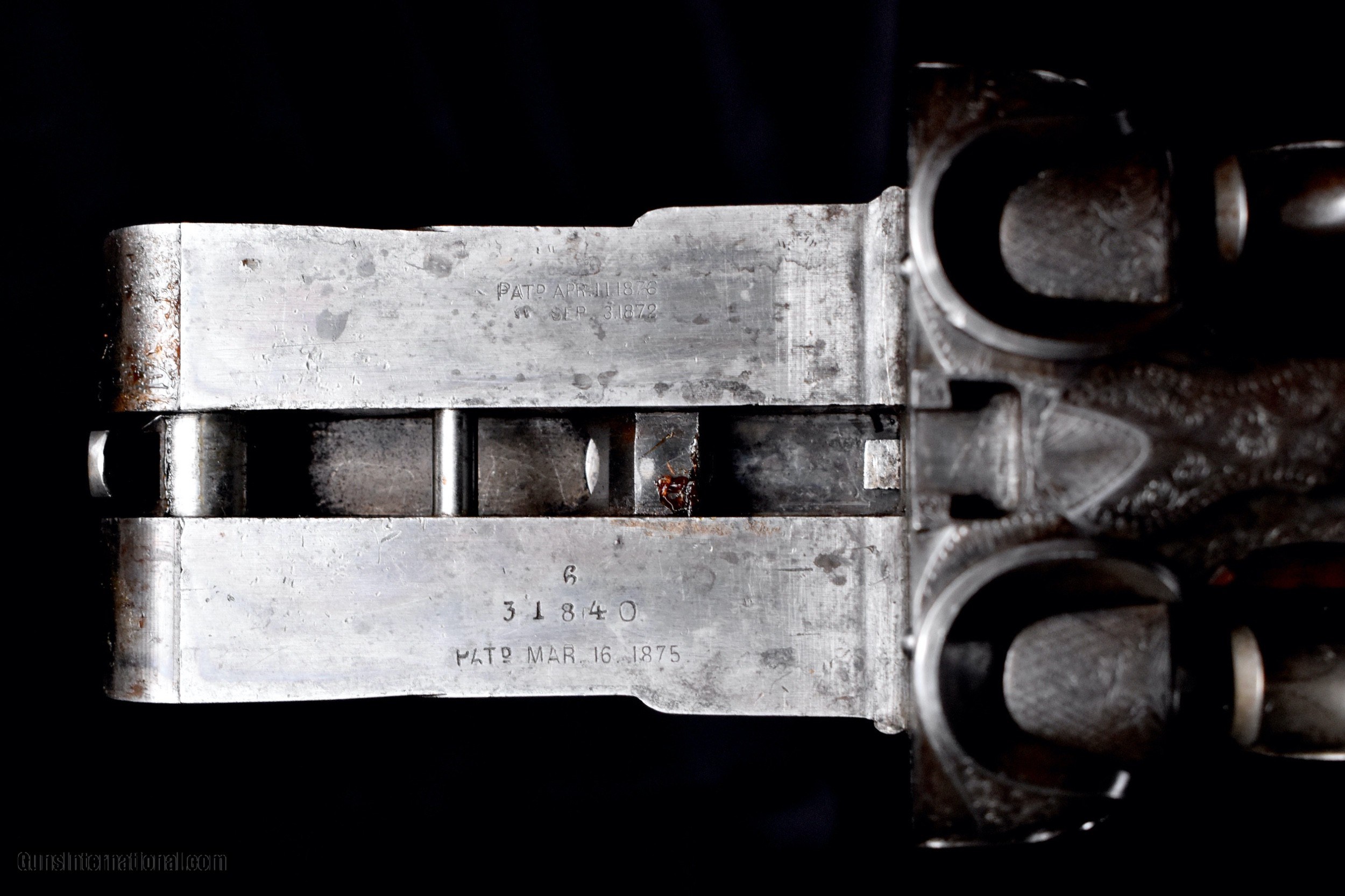 Description: This gun was part of a set of 8 Grade 6 (A Grade) Hammer guns, all 10ga guns, ordered by E.C. Meachem Arms Co. of At. Louis in early 1883. These guns are known to advanced collectors as the "Meachem Arms Set" and are the only grouping of high grade hammer guns like this known to exist! The guns, all labeled "PREMIER QUALITY" in the Parker records are all 10ga guns made with 32" barrels. I have 3 of the guns from that order for sale now- this one being the first SN 31840. This gun, made with 32" Damascus barrels, checkered splinter forend with fully engraved latch release. The case hardened action is absolutely full coverage engraved with scroll and fine game scenes throughout. Tear drops sculpted on the barrel bolsters which are also fully engraved. Trigger guard is near fully engraved with SN at tang. Stocks are beautifully figured finest quality European Walnut with round pistol grip with gold oval cap and terminate with the original engraved skeleton buttplate. I have attached a photo of the original order from the original order books to show this incredible order! Overall, this gun remains in excellent overall condition. Barrels retain about 90%++ of their bold damascus pattern. Action retains a flash or two of case color, engraving still clear and fine all the way around. Stocks are sound, checkering is fine and they retain nearly all of a professionally restored hand rubbed finish. Bores do show some orange peel and minor pitting but overall fine. Mechanics are crisp. These #4 Frame 10ga guns dont come along everyday and this is literally a once in a generation opportunity to purchase a trio of Grade 6 hammer guns from the same order (see my other listings for the other two guns). This gun can be purchased individually for $19,500 or as part of the trio for a volume discount price. Please dont hesitate to contact me with any questions or reasonable offers at (704) 280-2382 or via PM on this site. SOLD Antique: Yes Shotgun Gauge: 10 Gauge Manufacturer: Parker Bros. Model: Grade 6 (A Grade) Serial Number: 31840 Chambers: 3" (For Brass) Condition: Excellent Metal Condition: Excellent Wood Condition: Excellent Bore Condition: Excellent Barrel Type: Finest Damascus Triggers: Double Triggers Stock Comb: 1-5/8 Stock Heel: 2-3/8 Butt Pad: Skeleton BP LOP: 14-1/4 Weight: 10lbs 8oz Manufacture Date: 1883 Choke Left: .035(Imp. Modified) Choke Right: .033 (Modified) Minimum Wall Thickness Left: Over .030 Minimum Wall Thickness Right: Over .030 |