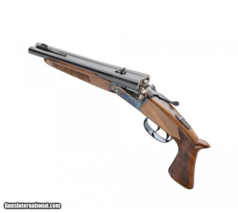 Description: Manufacturer: David Pedersoli Model: Howdah Pistol Sku: S640 Gauge: .45 Colt / .410 GA Barrel Length: 10.25" Chamber: 3" Capacity: 2 Rounds Finish: Blued Barrel, Case Hardened Frame Action: Break Open Walnut Stock and Pistol Grip Sights: Ramp Front, Folding Rear Leaf Overall Length: 16.75" Reproduction of the famous Auto & Burglar pistol produced by Ithaca Company in the 1920. Our version features rifled barrels and a special cartridge chamber enabling interchangeable use of either the .45 Long Colt caliber or 410 gauge shotshells. Extractors, automatic safety on the hammers complete the equipment of this unusual and fascinating pistol. A good looking model, aesthetically emphasized by the case hardened action and the walnut stock, oil finished. SOLD |