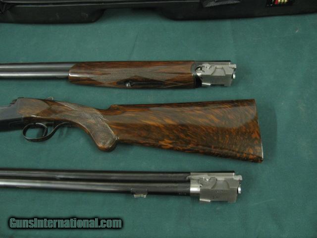 Description: 5933 Perazzi MX 20 2 barrel set, 28 gauge 29 1/4 inch barrels, IM/IM, 20 gauge barrels 29 1/4 ic/ic,(20 gauge barrels never shot)Jim Eyster of Heritag, balanced the weight exactly for both barrels and patterned them $1500,Exhibition Walnut $3500,all s/n numbers match,99% condition, none finer, priced to sell. SOLD |