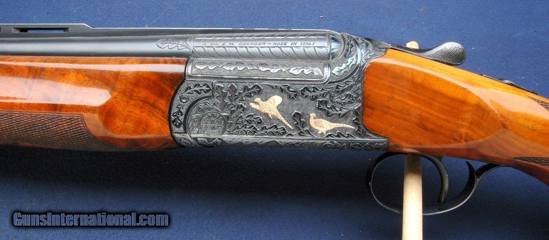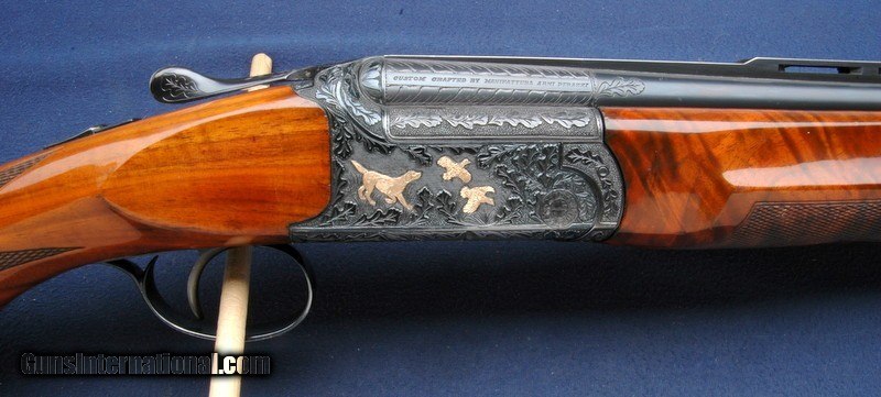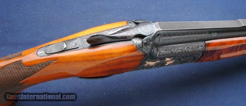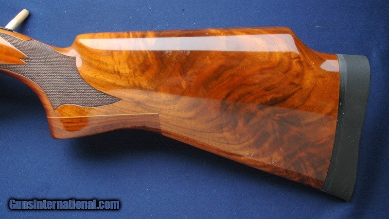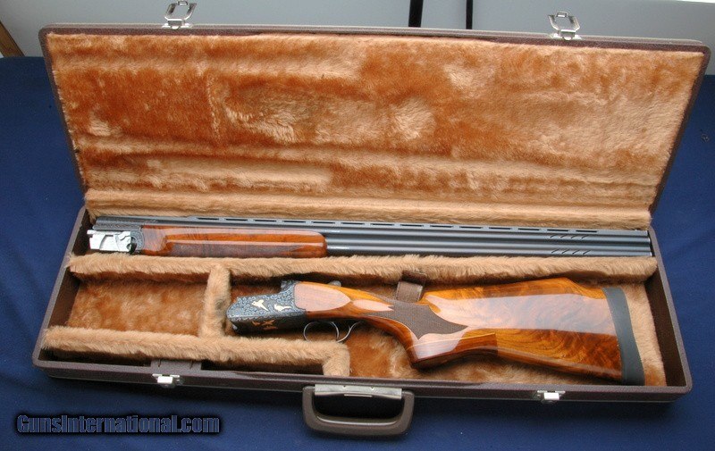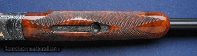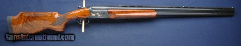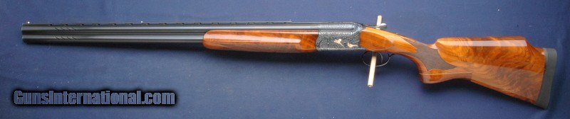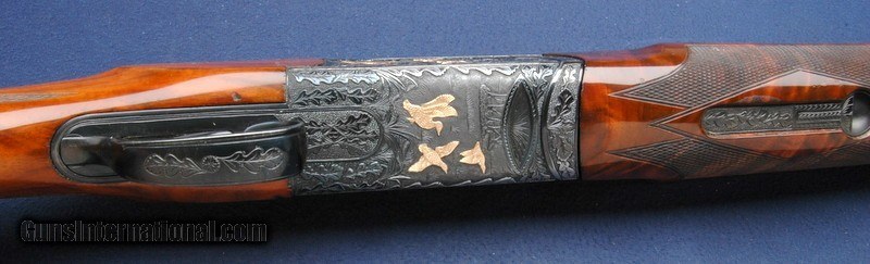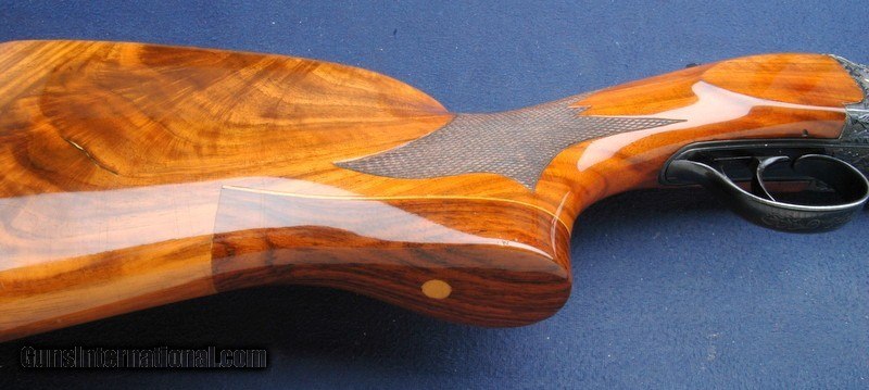Description: Feel like I'm running out of descriptive verbs for the guns I've been posting. So if I'm repeating myself, I'm sorry. Here is another wonderful example of the custom artwork to be found on higher end shotguns of years past. Starting with a Perazzi Comp 1 O/U 12 ga, IM/FULL barrels, ported top and bottom. Then deeply engraved by Neil Hartliep, add custom stocks from Wenig. The engraving, as you can see, includes a gold pointing dog and quails on the right flat, 3 gold ducks on the underside and 2 gold pheasants on the left flat. These figures are all deep gold inlays. Removable trigger. The stock has a very soft and sexy right hand rollover comb. The stock is cast off. Overall length is 47", weight 9 lbs 5 as you see it. 14 5/8" LOP. 30" barrels, 1 3/8" DAC, 2 1/4" DAH (pad). This is a 1971 production Ithaca Gun Company import. Comes in the hard case as shown. $75 shipping to the lower 48, 3% surcharge for using a CC. If you choose to pay with a personal check, we will hold the item for up to 10 days to make sure that it clears. Please expedite such pymts as we will hold an item on your word for 5 days. SOLD Shotgun Gauge: 12 Gauge |