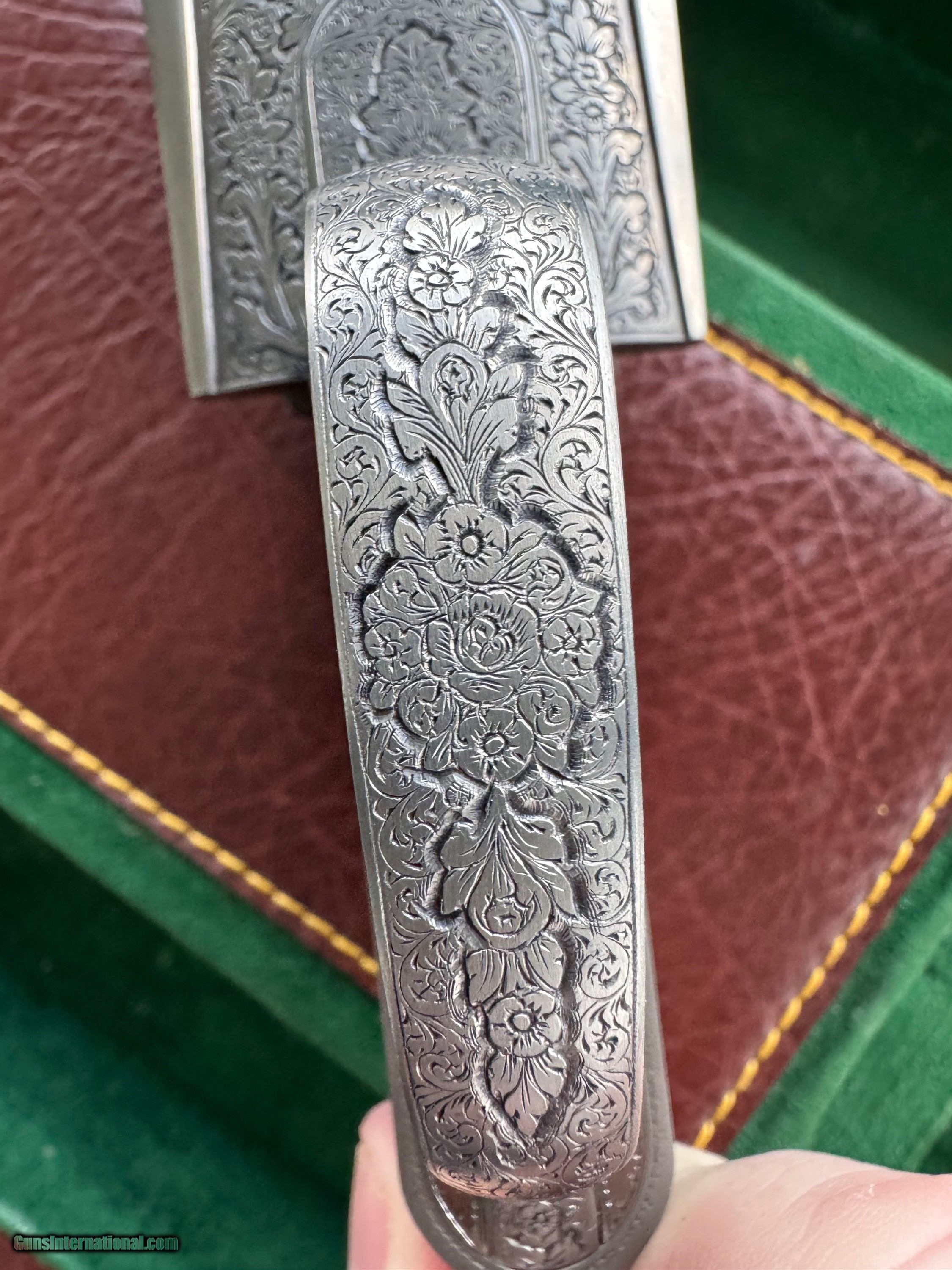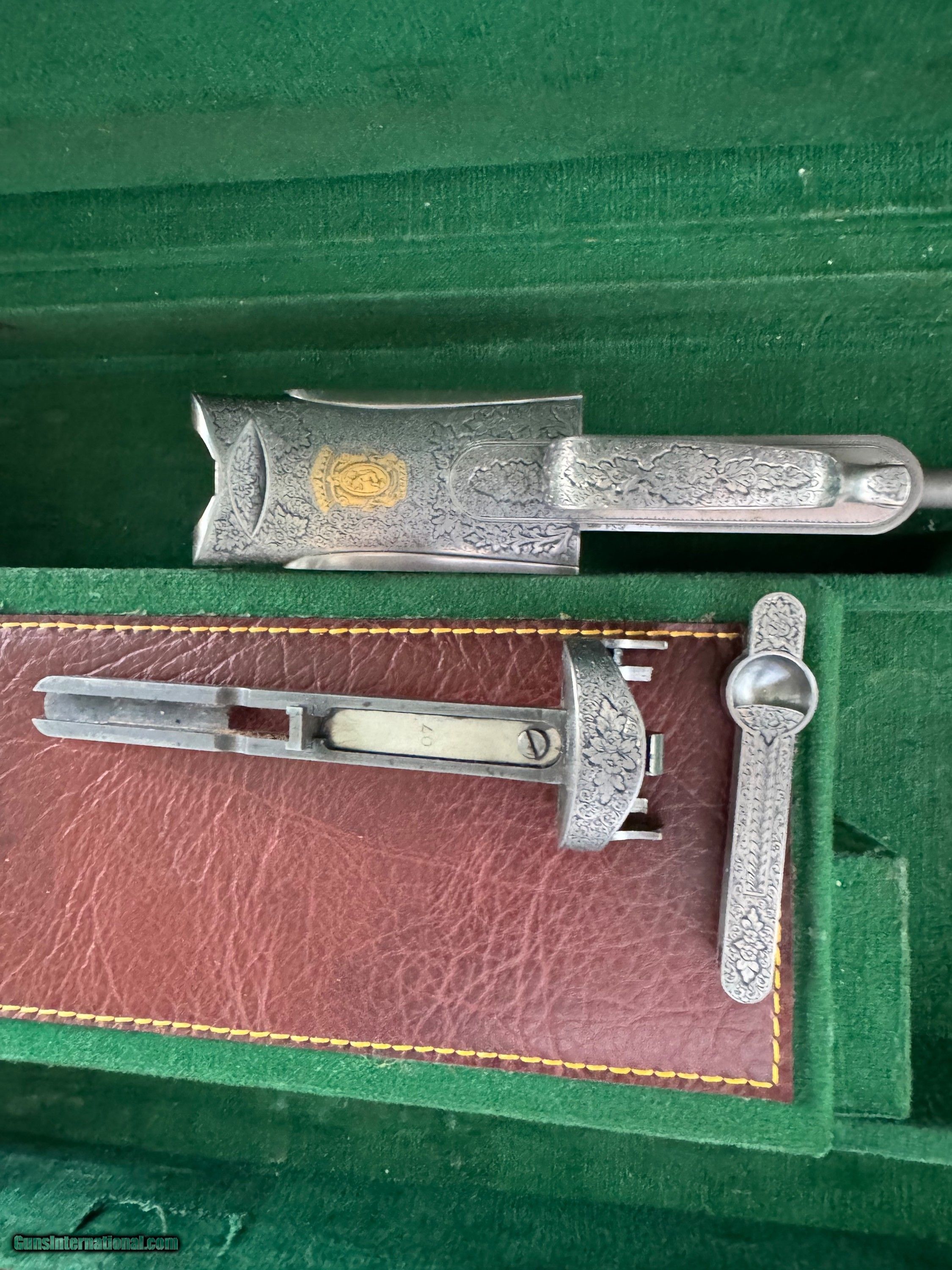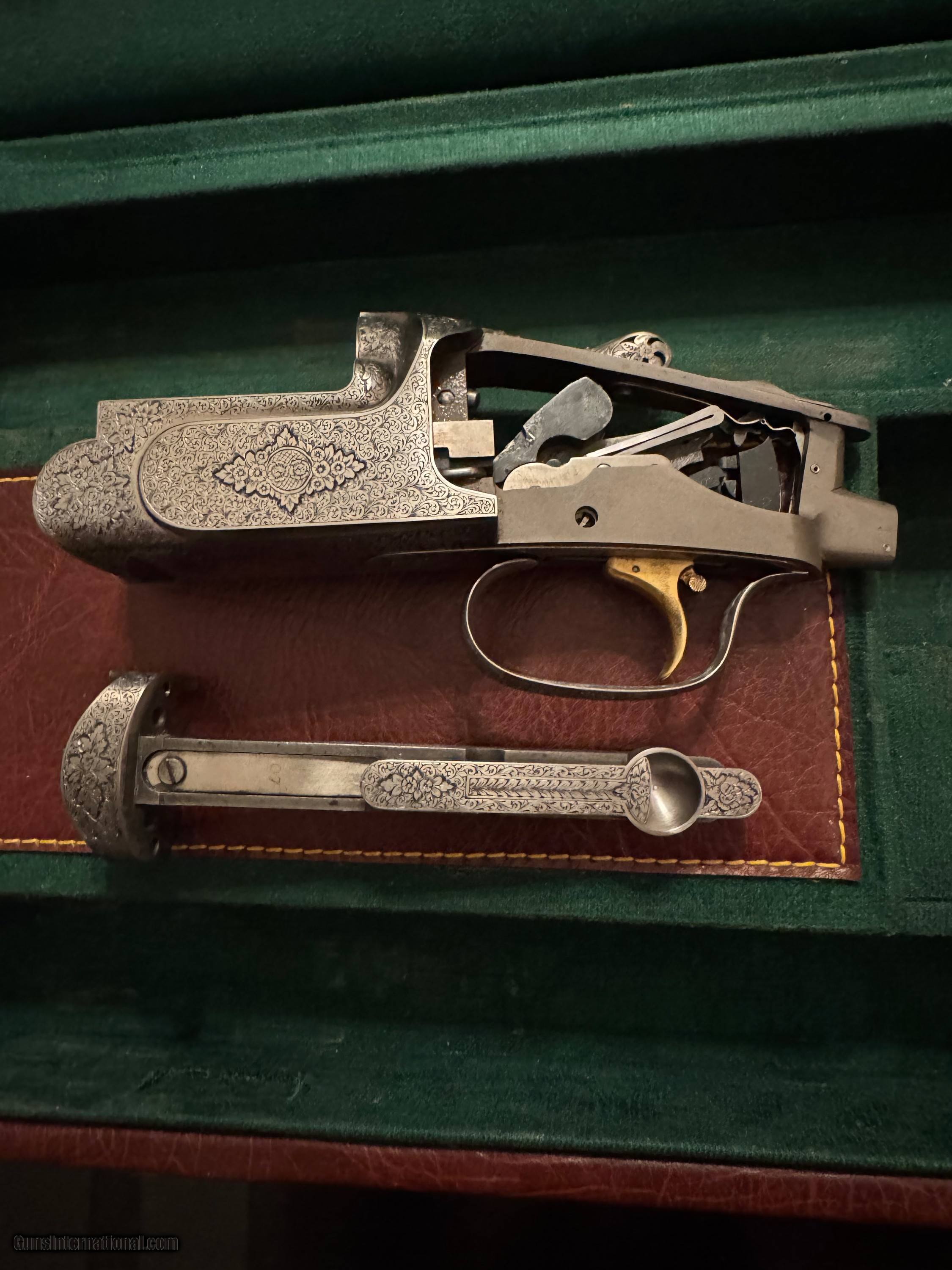 Perazzi 12 gauge MX8 custom. Perazzi Catalog SCO engraving Pattern #12. All coin color no black trigger and for end iron, Gold Adjustable trigger for Length of Pull, Upgraded pierced lever, gold trigger and gold cocking bar. Gold is perfect no signs of wear. Only 1 round of sporting clays after gun was fully serviced to make sure it was in perfect working condition. Upgrade your current mx8 Perazzi at a fraction of the price the engraving alone is 12k. Just add your wood and barrel. A complete gun with this engraving pattern is 42k and 2 year wait from the factory.