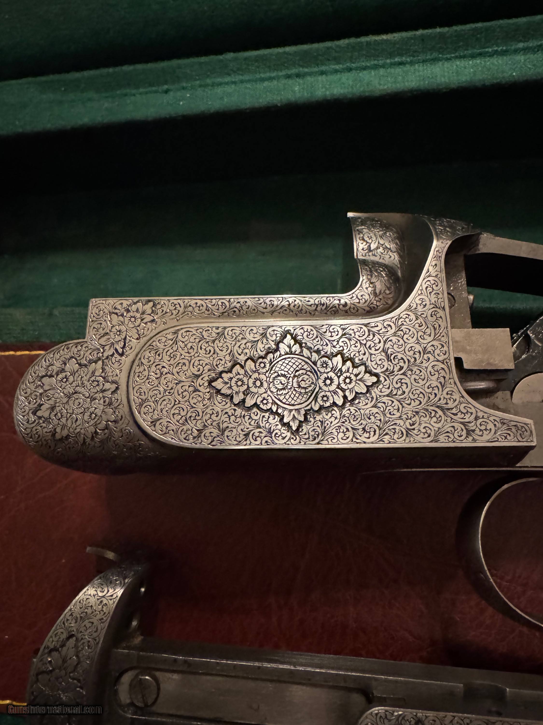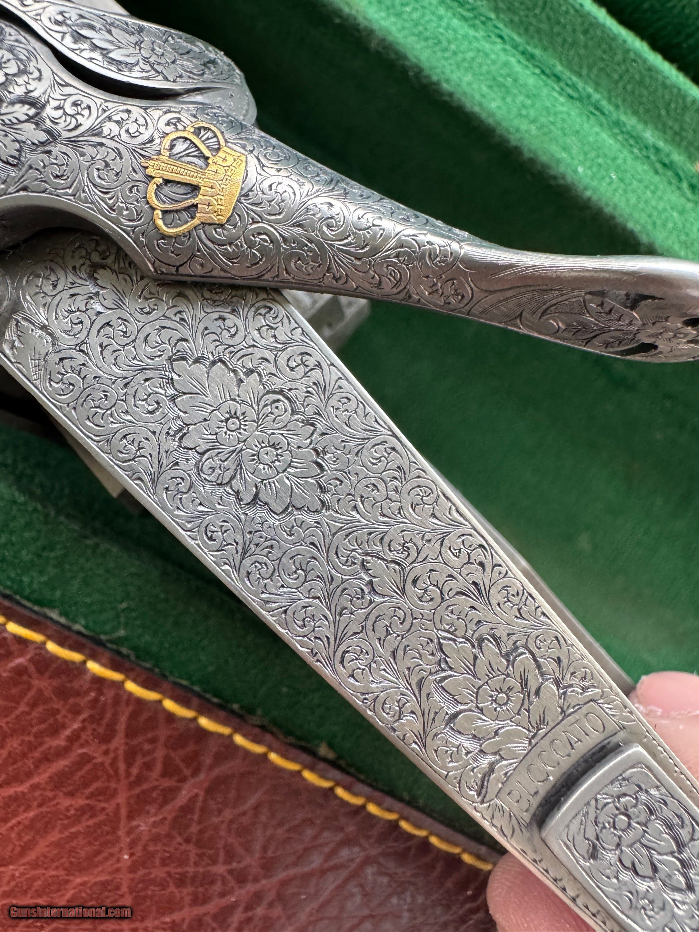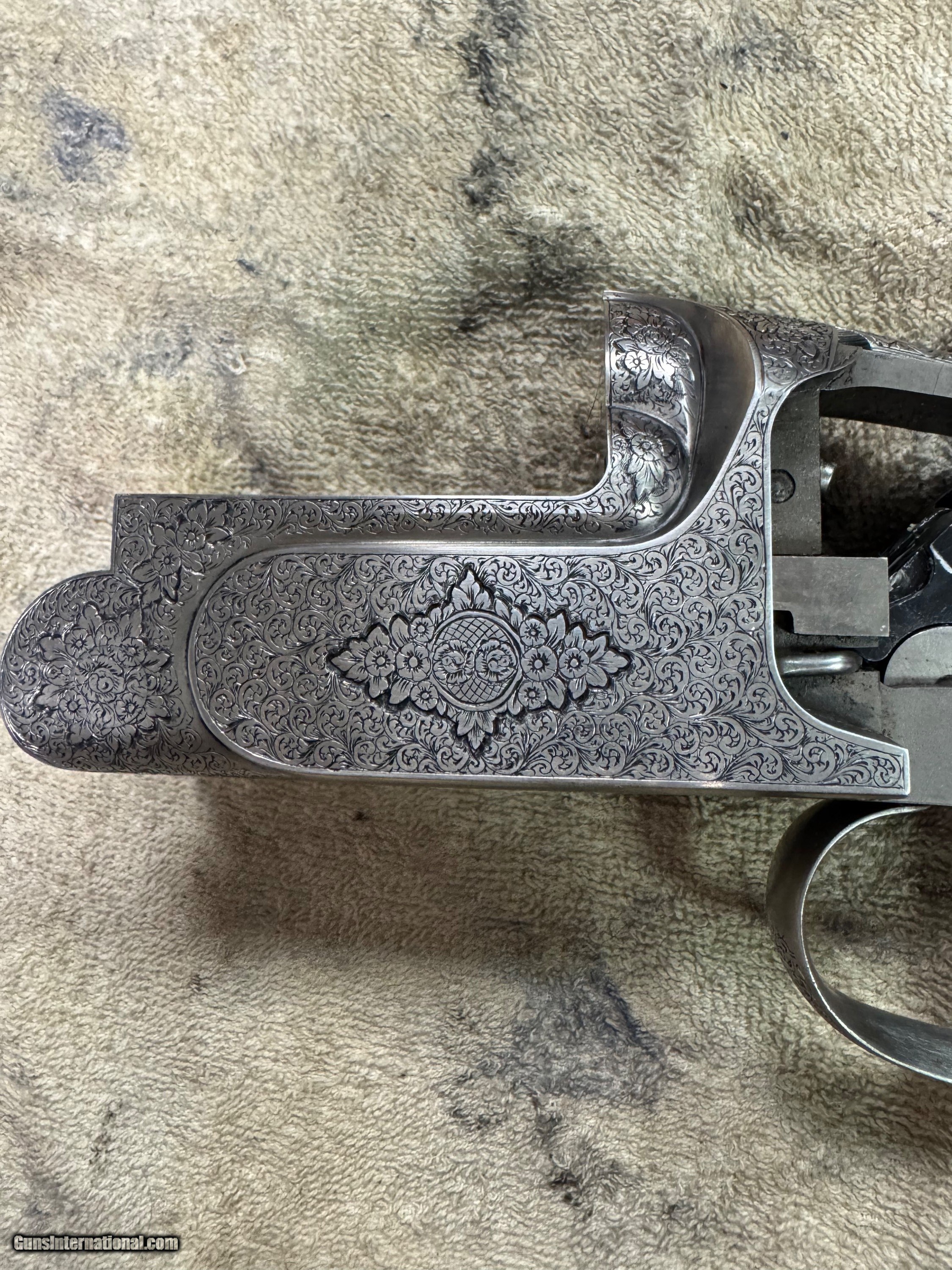 Perazzi 12 gauge MX8 custom. Perazzi Catalog SCO engraving Pattern #12. All coin color no black trigger and for end iron, Gold Adjustable trigger for Length of Pull, Upgraded pierced lever, gold trigger and gold cocking bar. Gold is perfect no signs of wear. Only 1 round of sporting clays after gun was fully serviced to make sure it was in perfect working condition. Upgrade your current mx8 Perazzi at a fraction of the price the engraving alone is 12k. Just add your wood and barrel. A complete gun with this engraving pattern is 42k and 2 year wait from the factory.