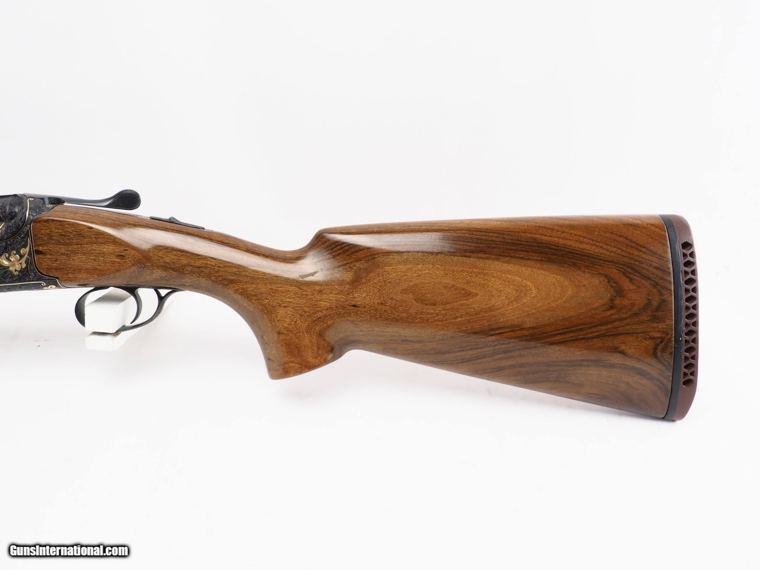 Description: Book #38. Price: $5895.00 Engraved Perazzi MX with 20ga/28ga/.410 tubes made by Kolar. Metal finish is excellent. Wood finish shows some light wear and handling marks. Engraving is hand-done, signed by Walter Kolouch. Locking block and top lever spring are newly-fitted. Action is tight, barrels are on-face. Barrels, receiver, and forearm iron are numbers-matching. Trigger operates mechanically to ensure proper function with .410 tubes. Make: Perazzi Model: MX w/ dropout trigger Hand: right hand Barrel length: 27.5" Top choke: .760" (.728" bore) - Tula style Bottom choke: .761" (.727" bore) - Tula style Sub-gauge tubes: Kolar LOP: 14 5/16" DAC: 1 7/16" DAH: 1 3/4" Cast at toe: 1/8" Cast at heel: 1/4" Accessories: hammer, knockout tool Case: aluminum tube case SOLD |