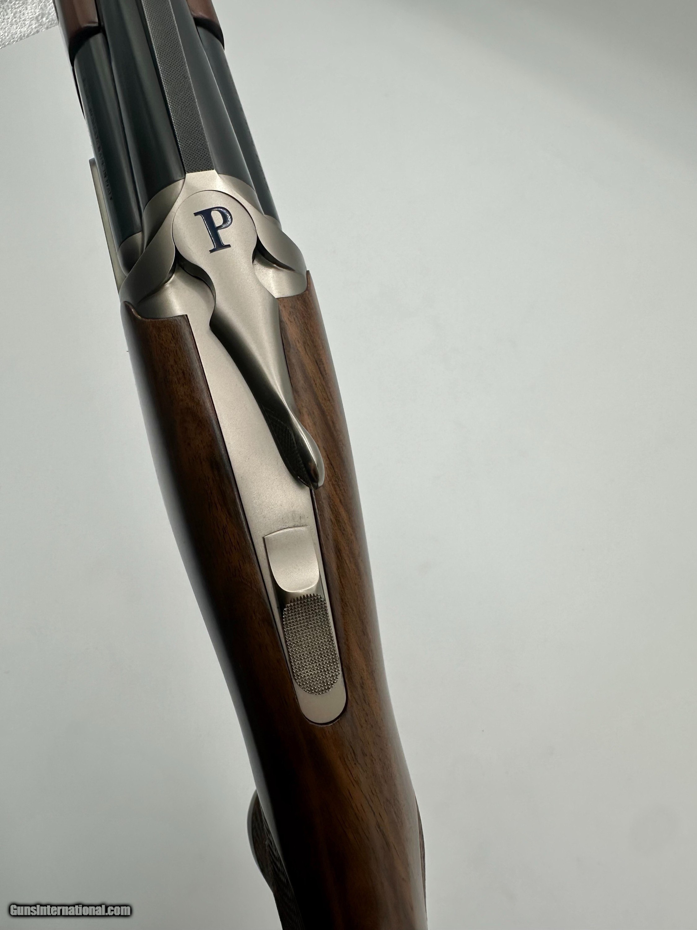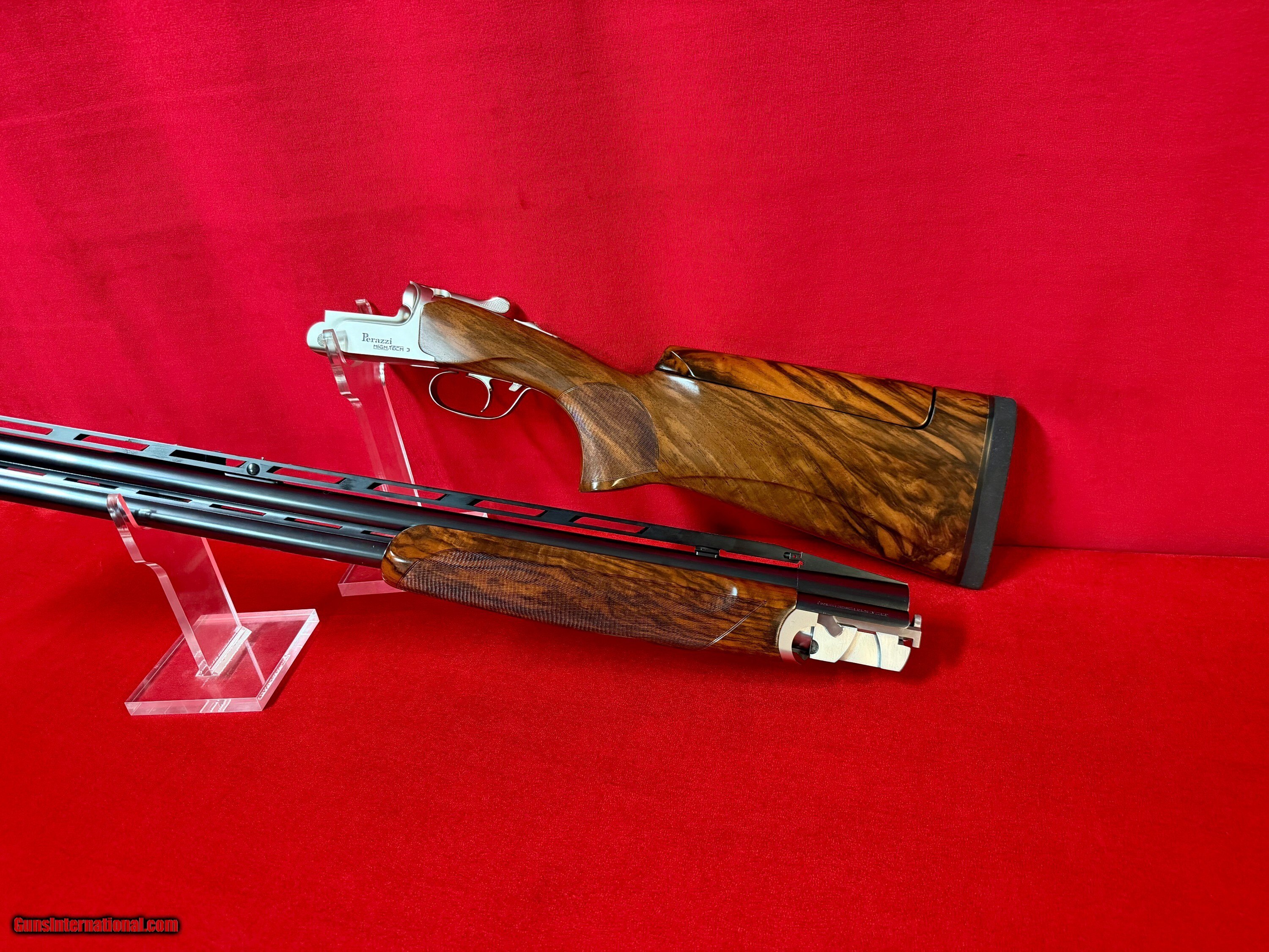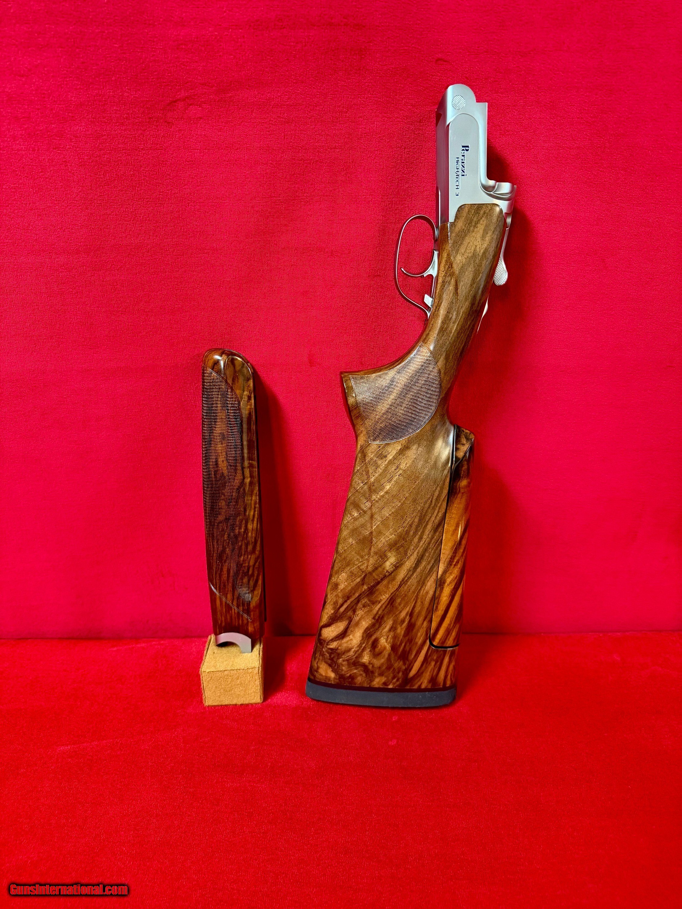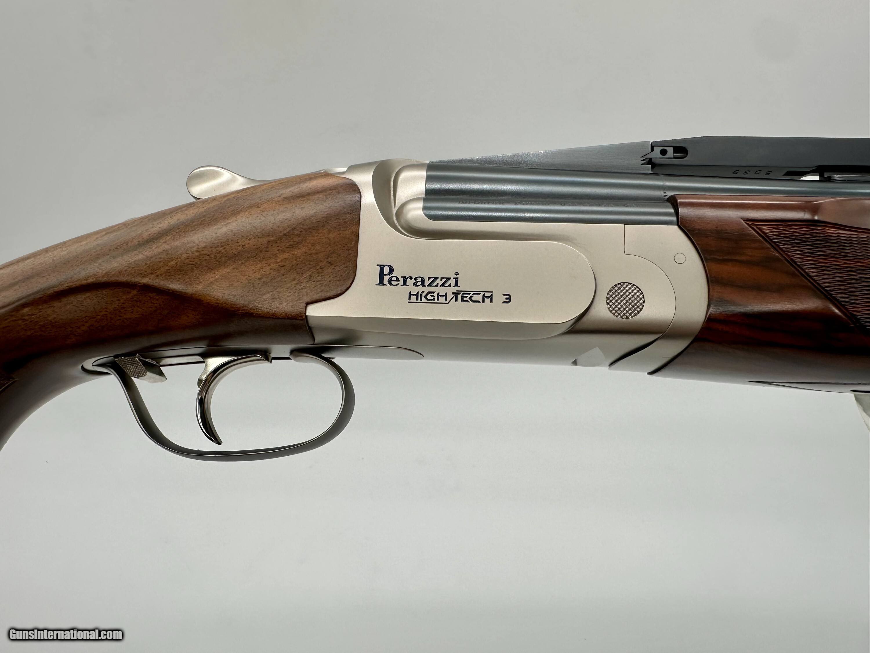Perazzi High Tech 3 all serial numbers matching at #165XXX. Gun is in LIKE NEW condition with beautiful factory upgraded SC2 wood. Has a dropout leaf spring trigger with external barrel selector. 2022 gun that is hardly been shot. This has the upgraded all nickel package so trigger, forearm iron, top latch and safety are all nickel