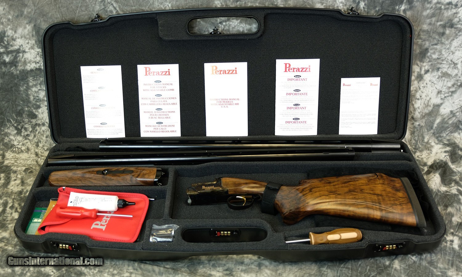 Description: New Perazzi High Tech Gold Skeet Combo with Heavy 11x7 3-Position Adjustable Rib, fixed SKT/SKT choked barrels, additional lightweight fixed choke (SKT/SKT) barrels with full set of fitted Briley UL (20/28/.410) sub-gauge tubes. Factory case-color hardened action with gold inlaid High Tech logo, factory removable non-selective trigger. Factory adj. comb Monte Carlo stock with right-hand palmswell and HT forearm. Includes Negrini tube-set case, tools, sub-gauge tubes. Call 626-633-1002 for pricing. SOLD Shotgun Gauge: 12 Gauge |